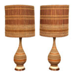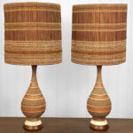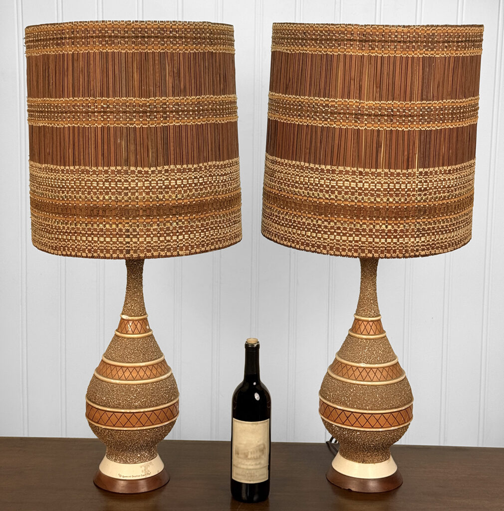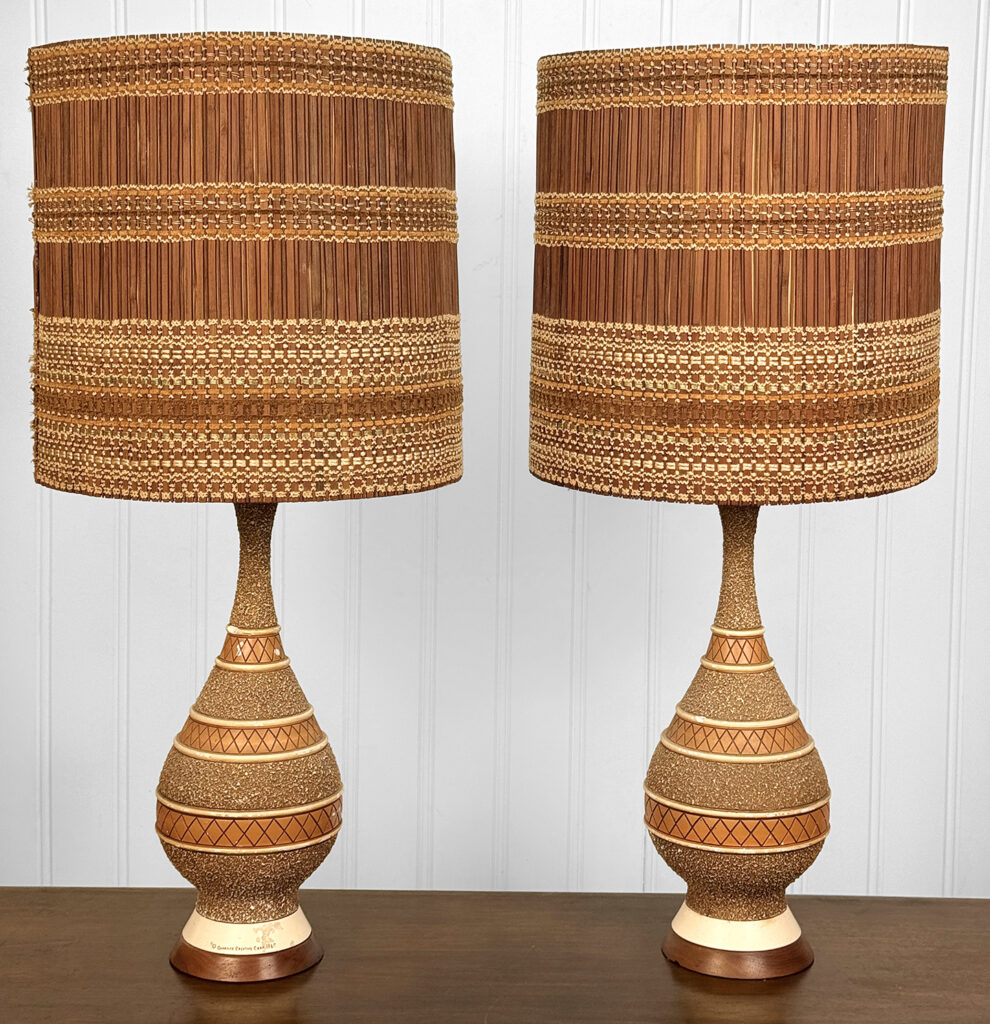 Each Lamp is fully tested and work as they should, they do not require rewiring. Surface chips and flea bites are shown to the chalkware bodies, as well as discoloration. One of the shades interior lining is taped. It’s used as is, but can be glued.