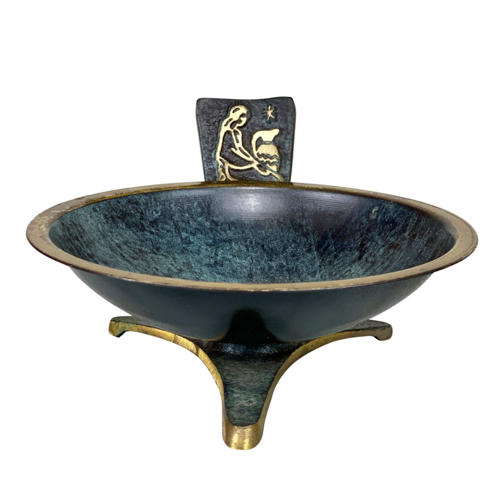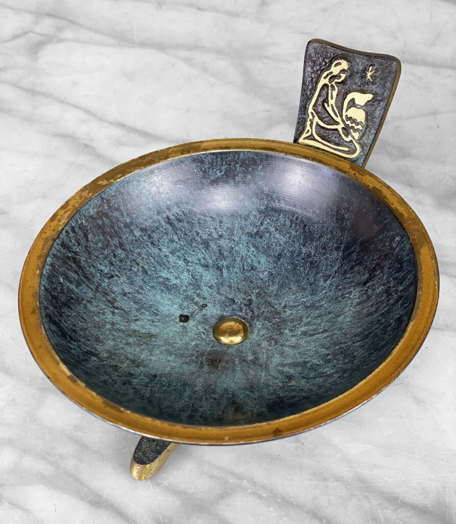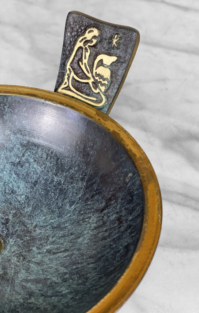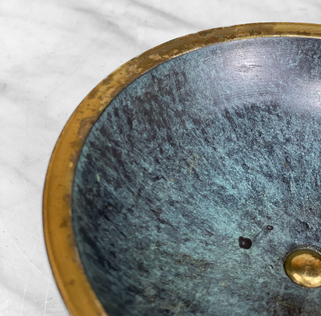Mid-Century Brass & Green Enamel Serving Footed Bowl by Taya, Israel, c. Mid 20th Century