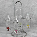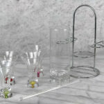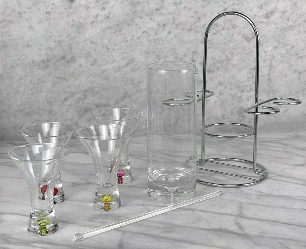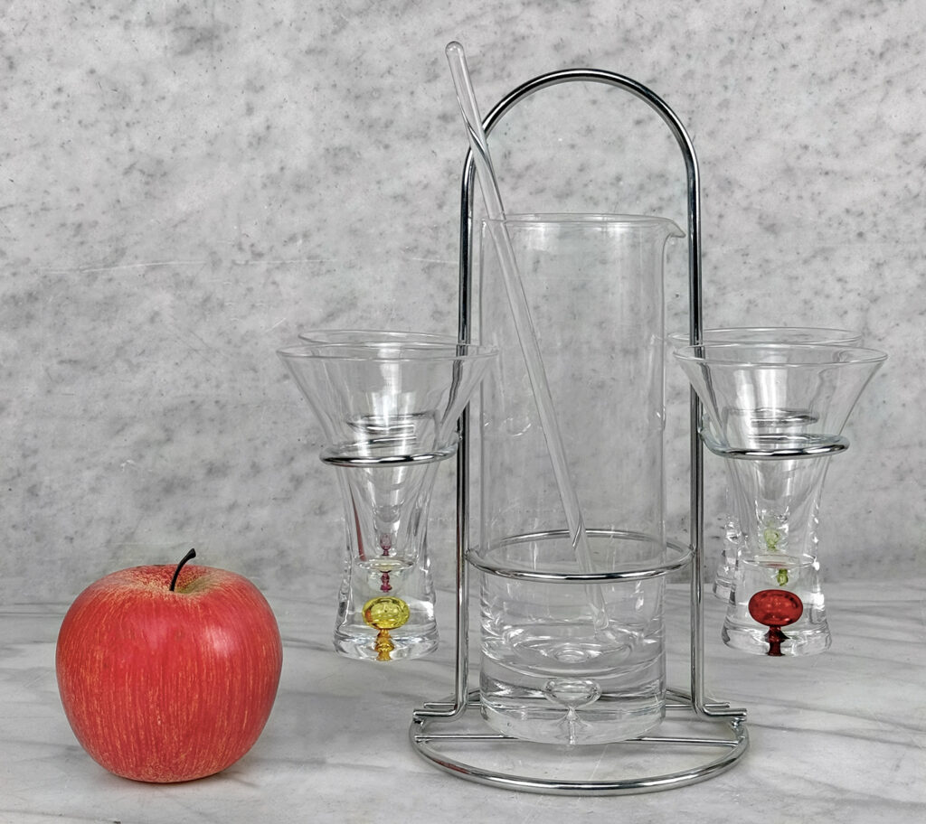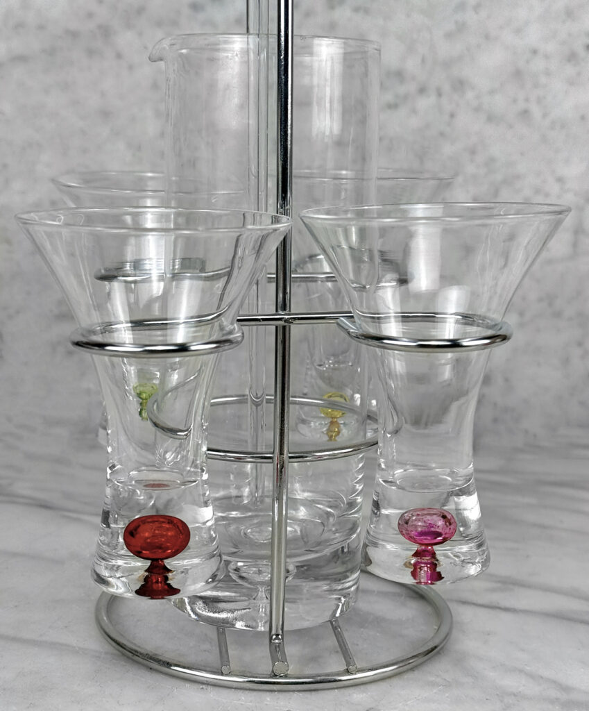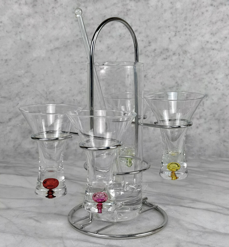 - Original Set Includes 4 Cordial Shot Glasses, Mixing Tumbler, Glass Mixing Stem & Chrome Caddy