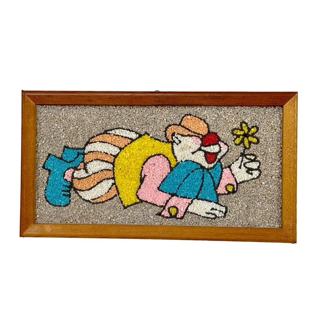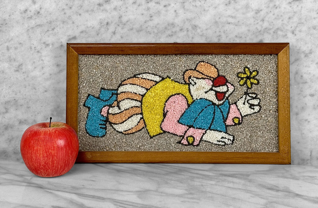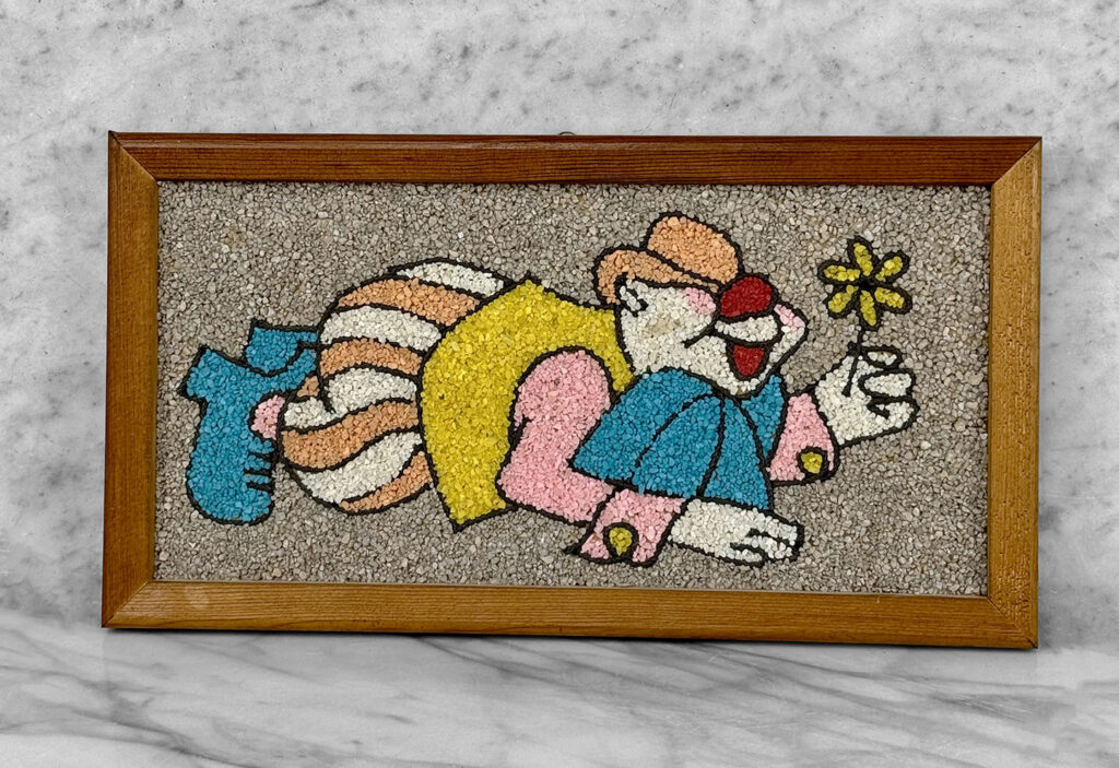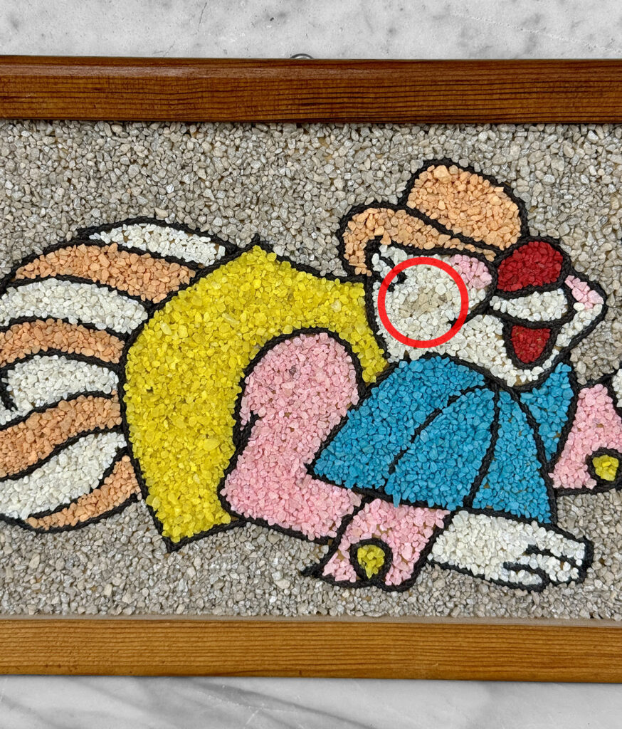 This Clown Gravel Art is in overall good condition. All of the pebbles are intact without any missing regions. An area of discoloration can be seen along the clowns face. We’ve circled this area in our photo gallery to reference.
