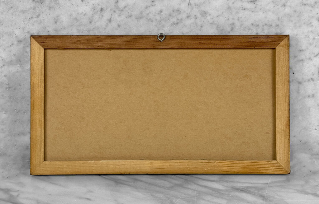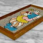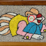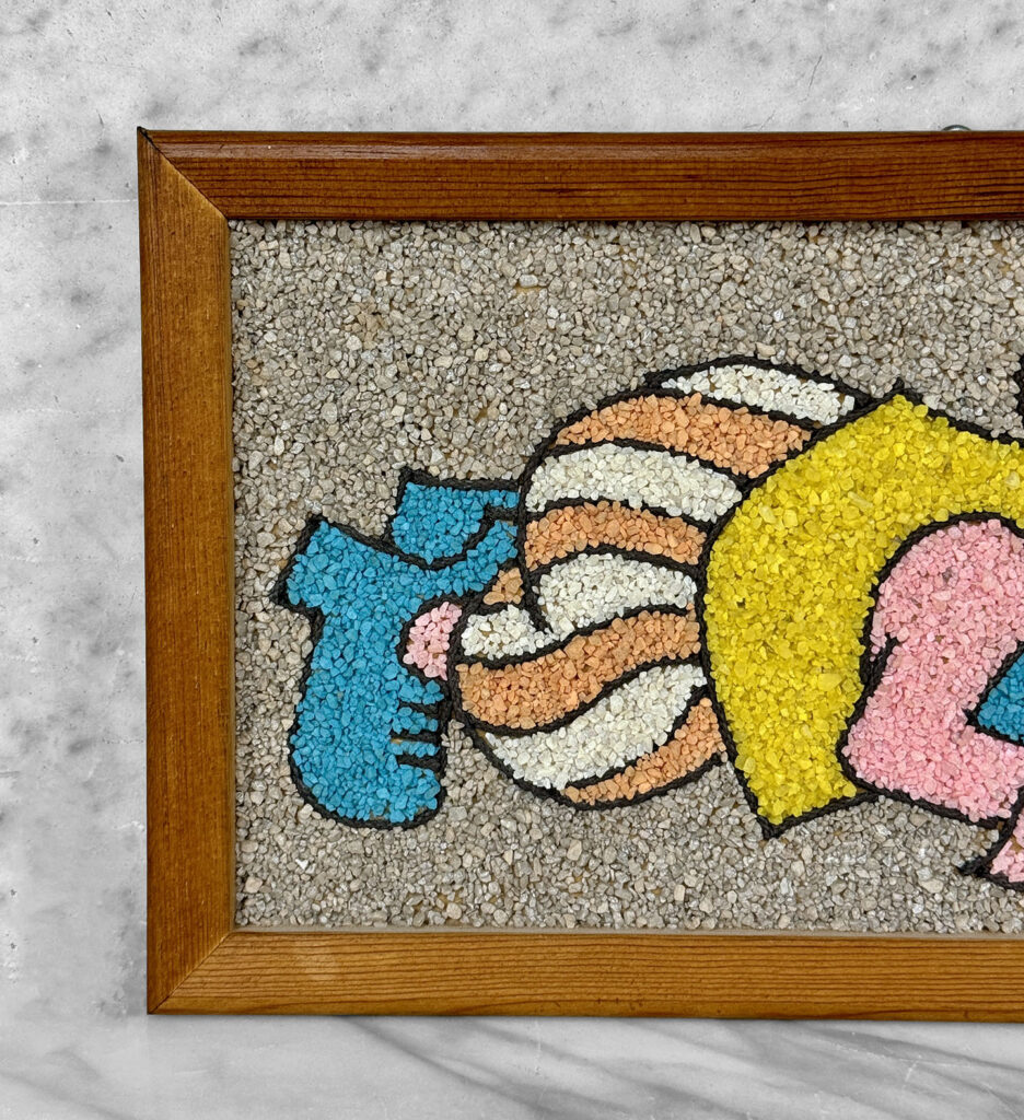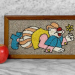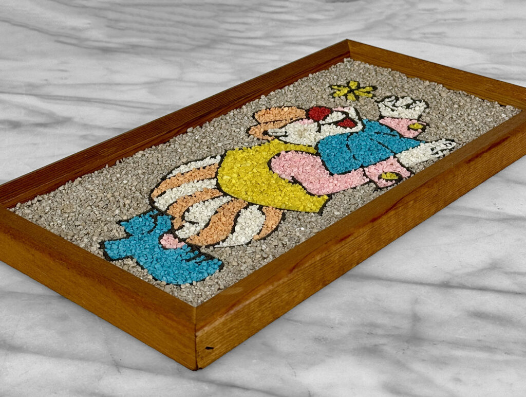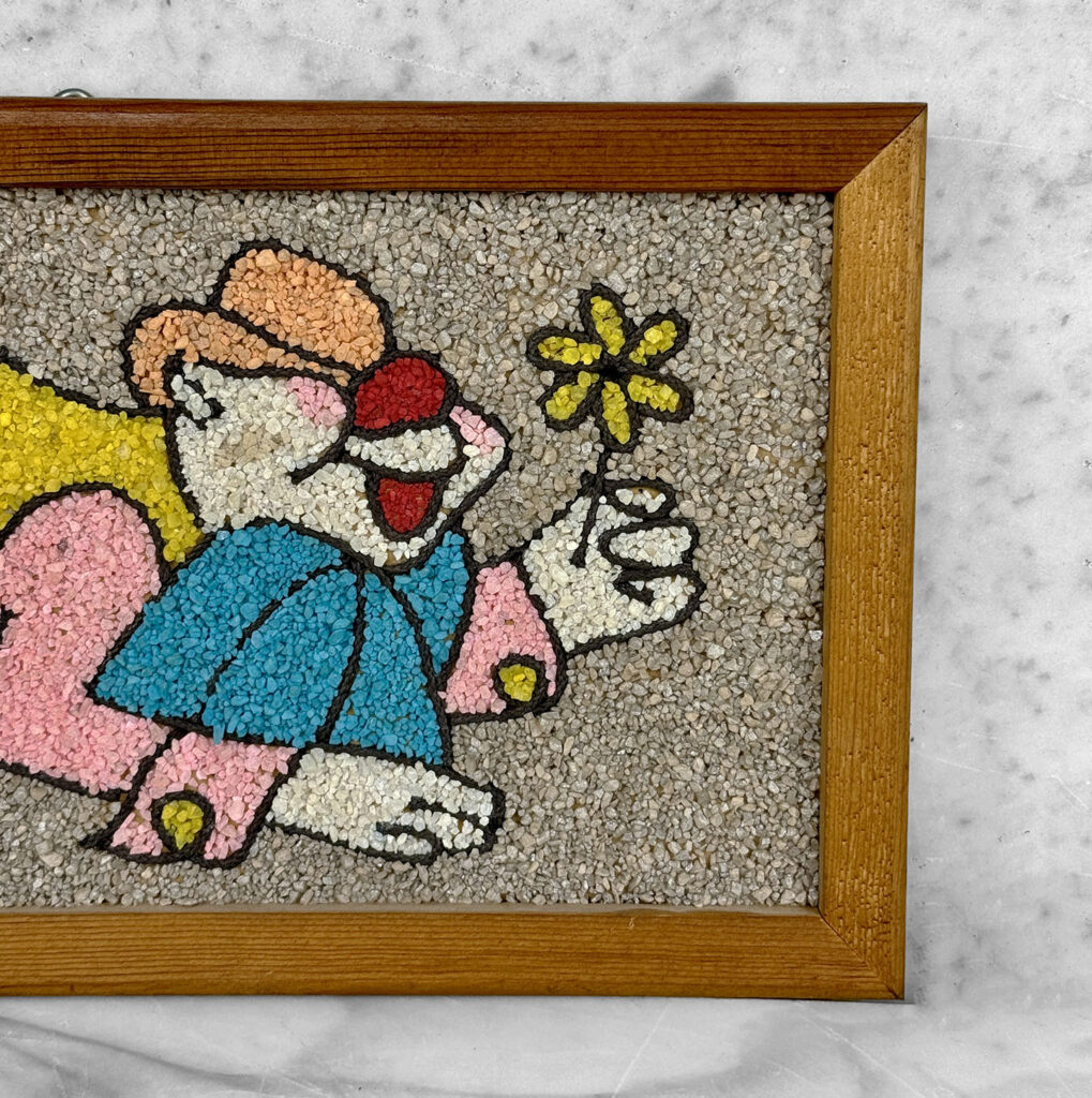 This Clown Gravel Art is in overall good condition. All of the pebbles are intact without any missing regions. An area of discoloration can be seen along the clowns face. We’ve circled this area in our photo gallery to reference.