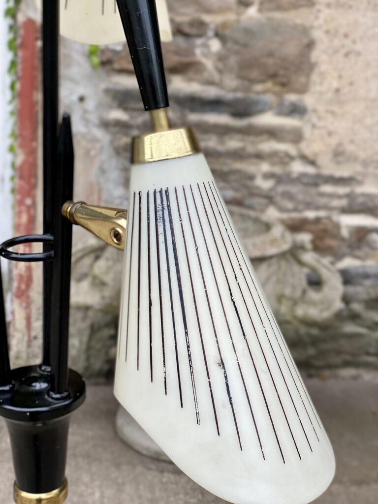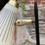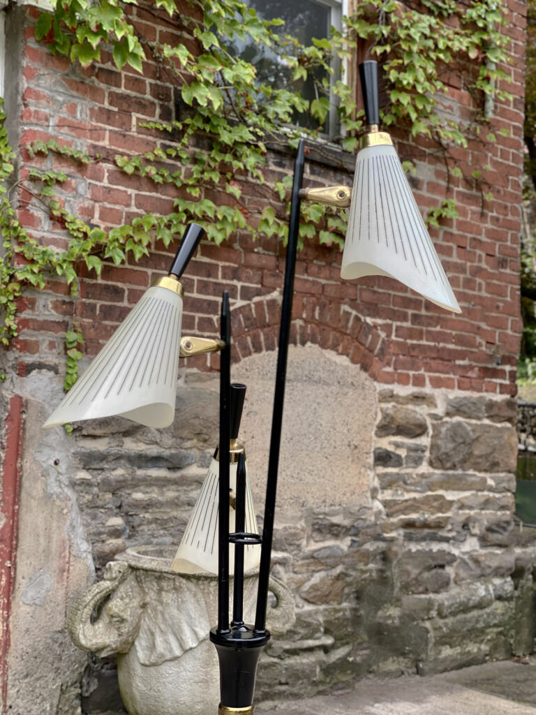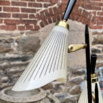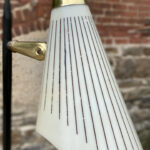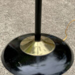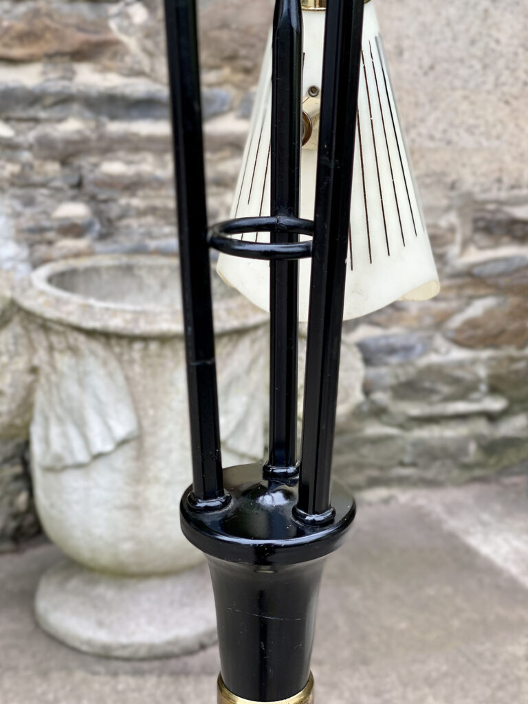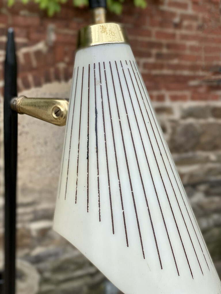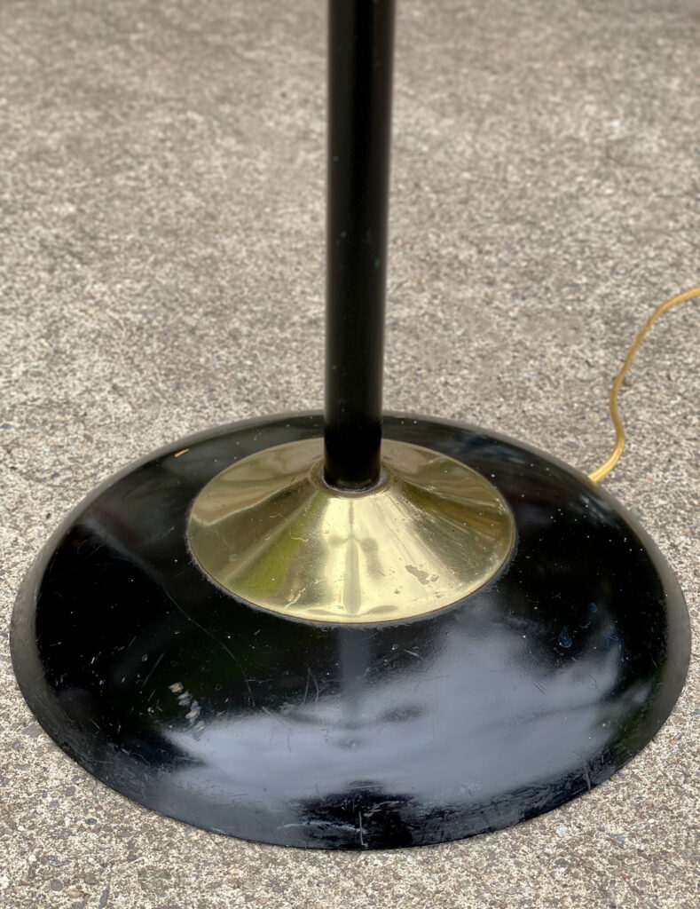 This Mid-Century Floor Lamp is fully tested and works as it should, it does not require rewiring. Each shade is free of any cracks, chips or repairs. Mild discoloration to the shades could be seen while off as well as wear to the striping. The base shows mild scratches from age.