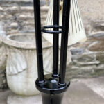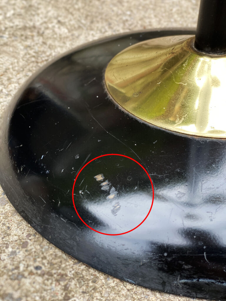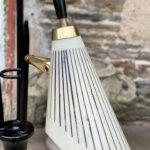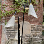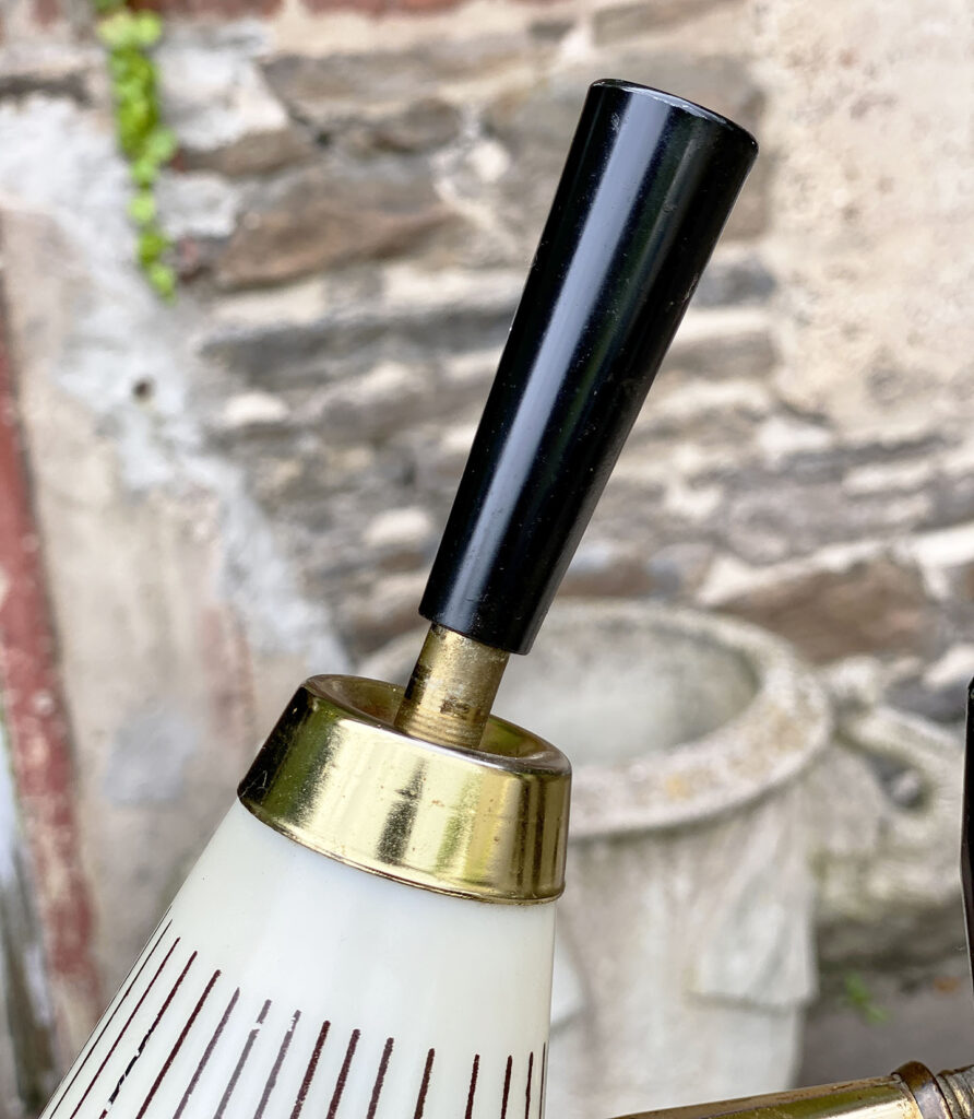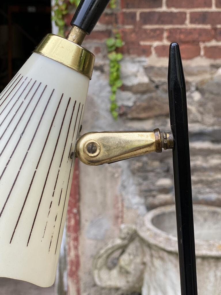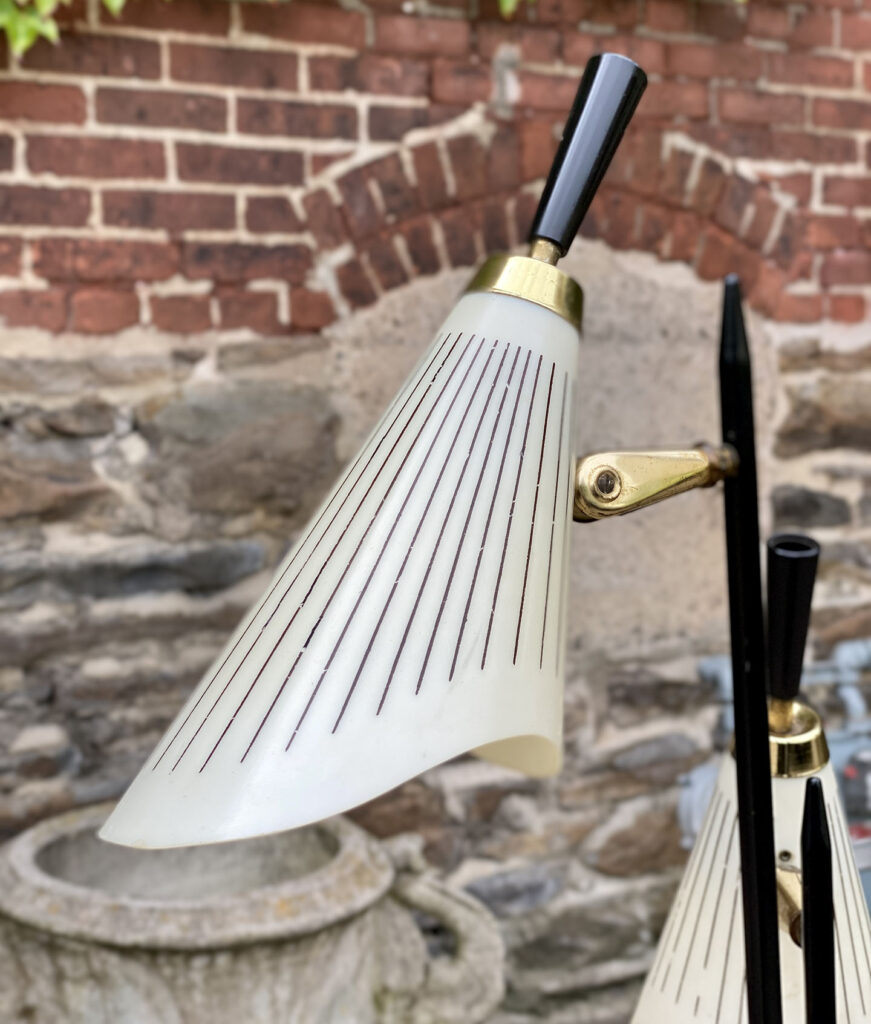 This Mid-Century Floor Lamp is fully tested and works as it should, it does not require rewiring. Each shade is free of any cracks, chips or repairs. Mild discoloration to the shades could be seen while off as well as wear to the striping. The base shows mild scratches from age.