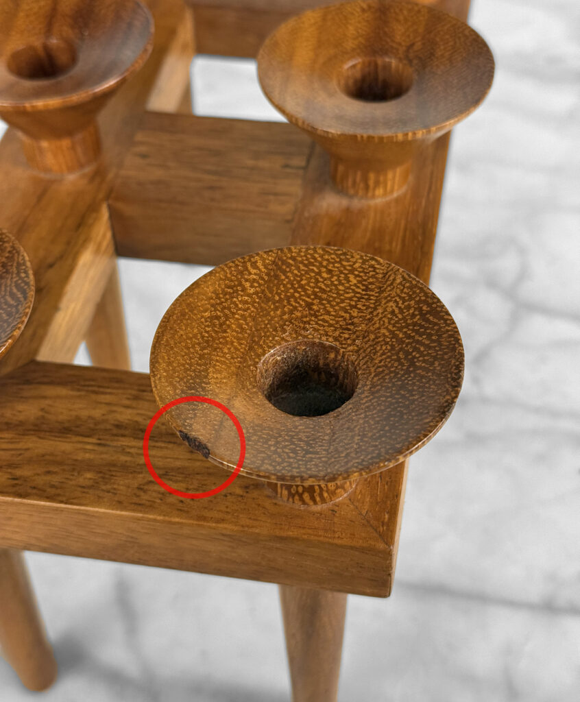 Overall good condition and very well made. A small chip to the lip of one of the candle holders is shown. We’ve circled this area in our photo gallery to reference.
