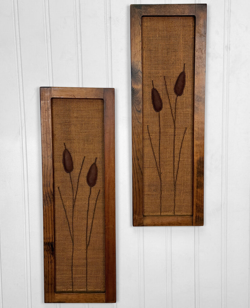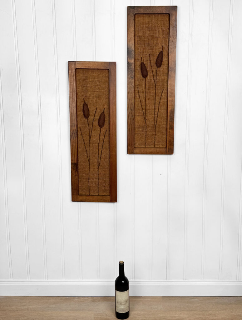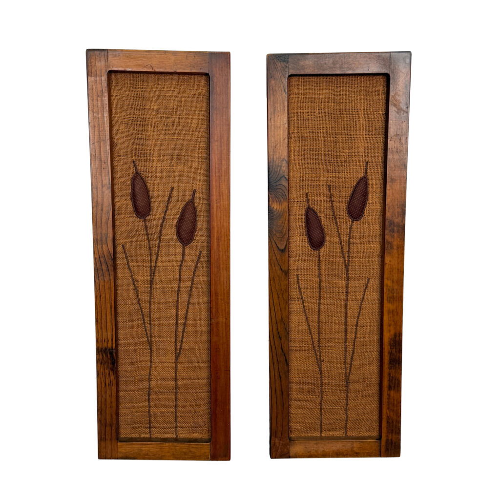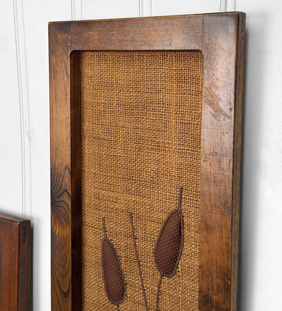 Mid-Century Embroidered Burlap Cattail Framed Wall Art – A Pair