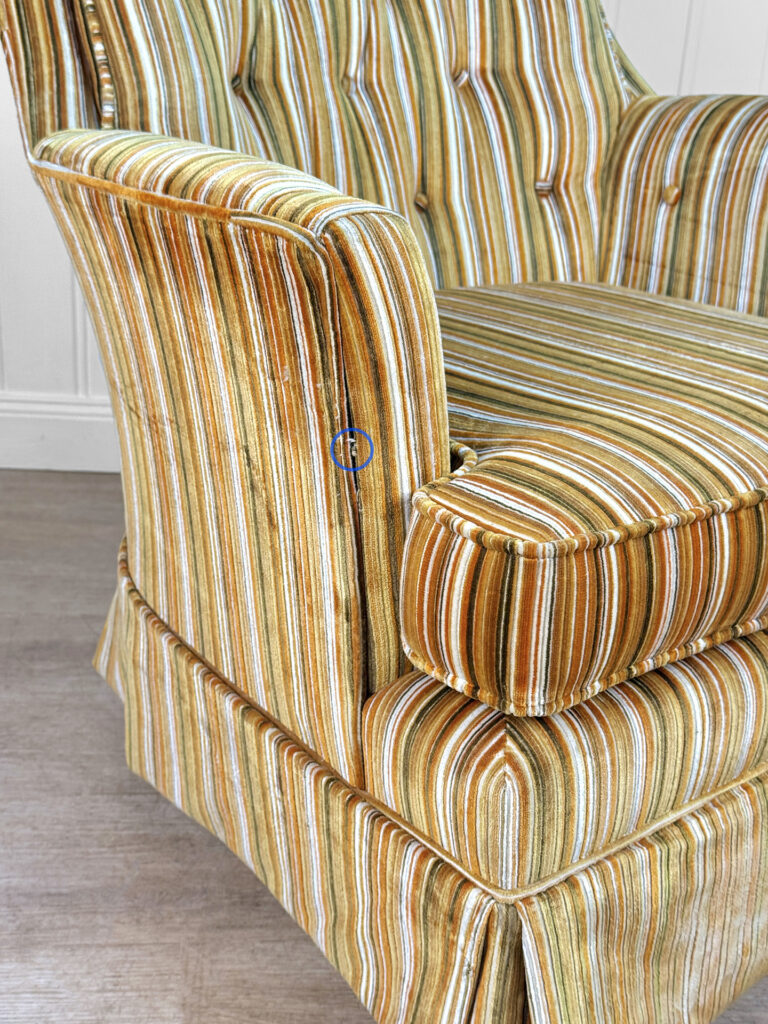 Overall good condition, solid, sturdy and very well made – Makes a great daily seat. A small area of fraying is shown along the left-arm-side. This area is circled in our photo gallery to reference. Very Clean and well kept.