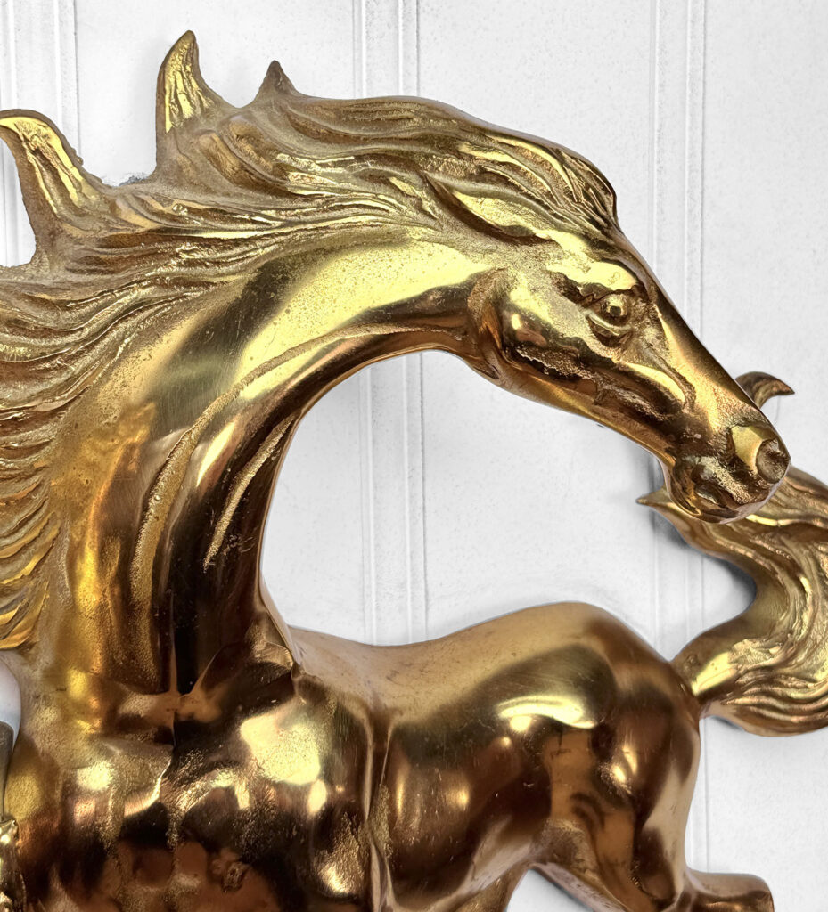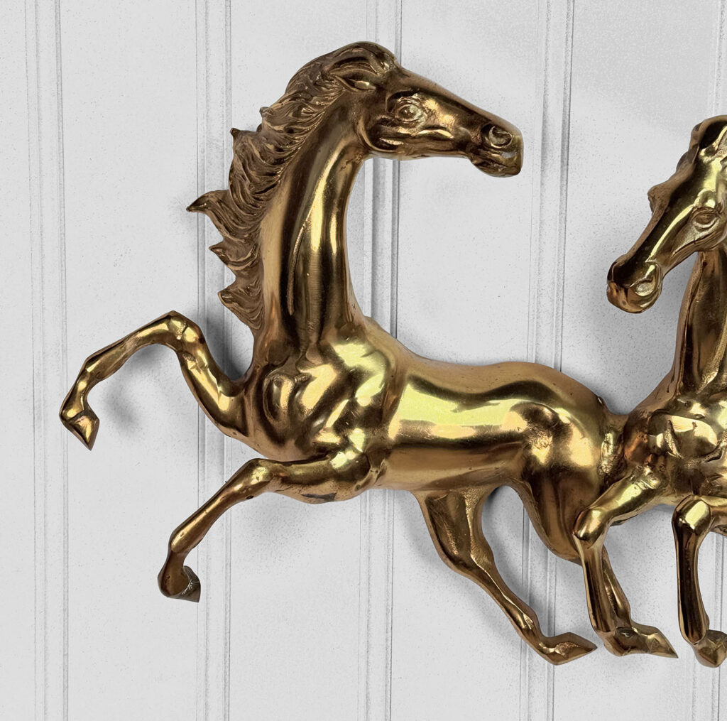 Mild tarnishing and patina to the finish is shown, the brass is not heavily cleaned or polished. The sculpture includes 2 loops for hanging. There was a brass chain which hung along the loops – This was since removed for a more concealed hang.
