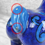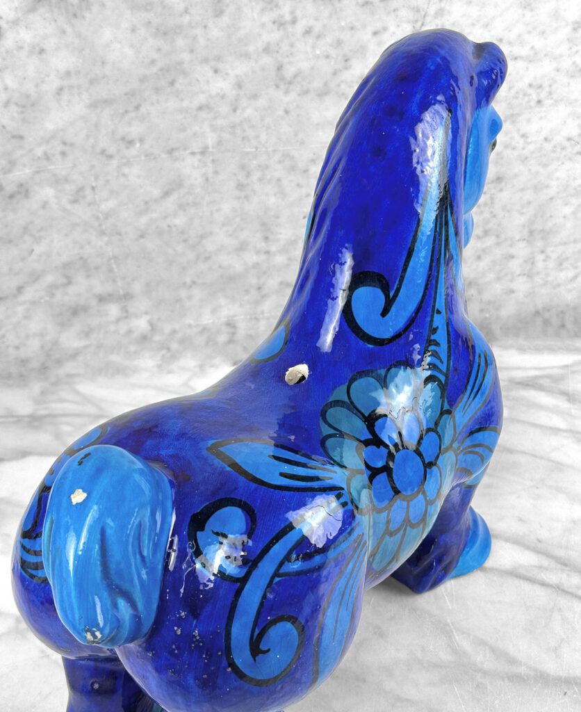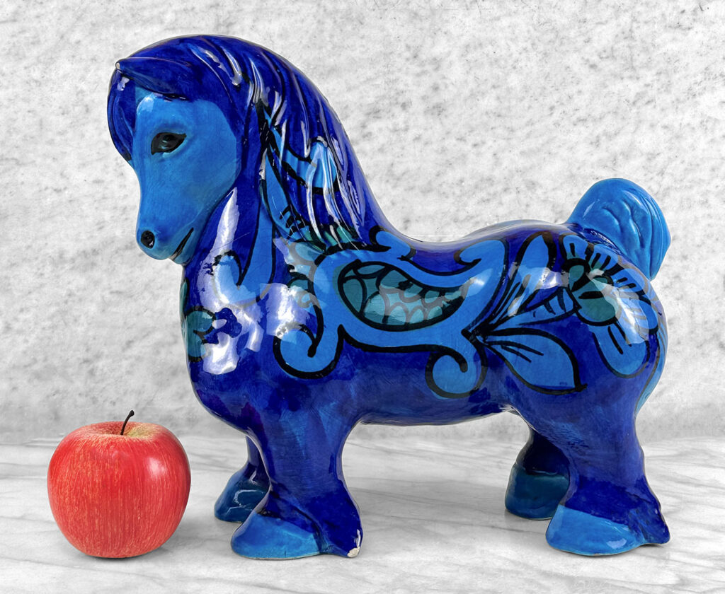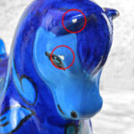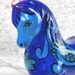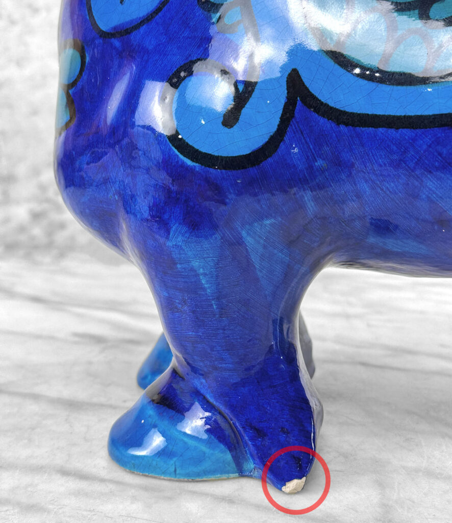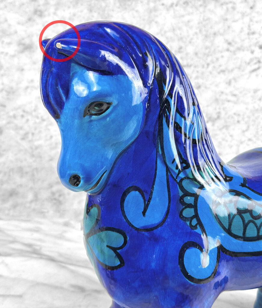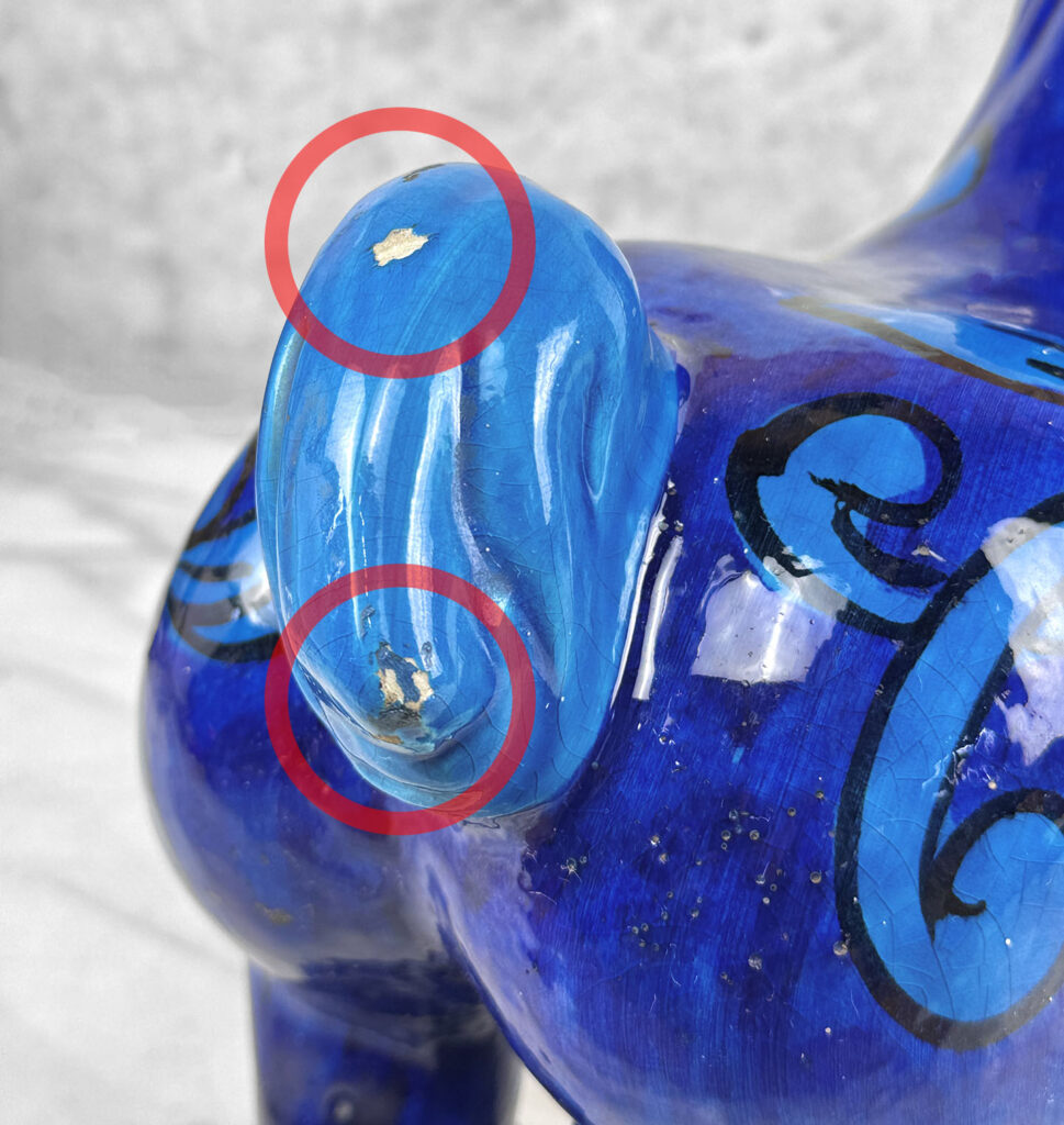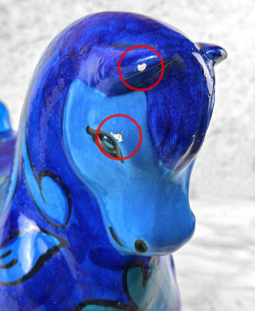 Chipped areas are shown to the horses glazing. We’ve circled these areas in our photo gallery to reference. An unusual hole is shown along the top of the horse, possibly made into a lamp at some point.