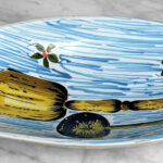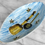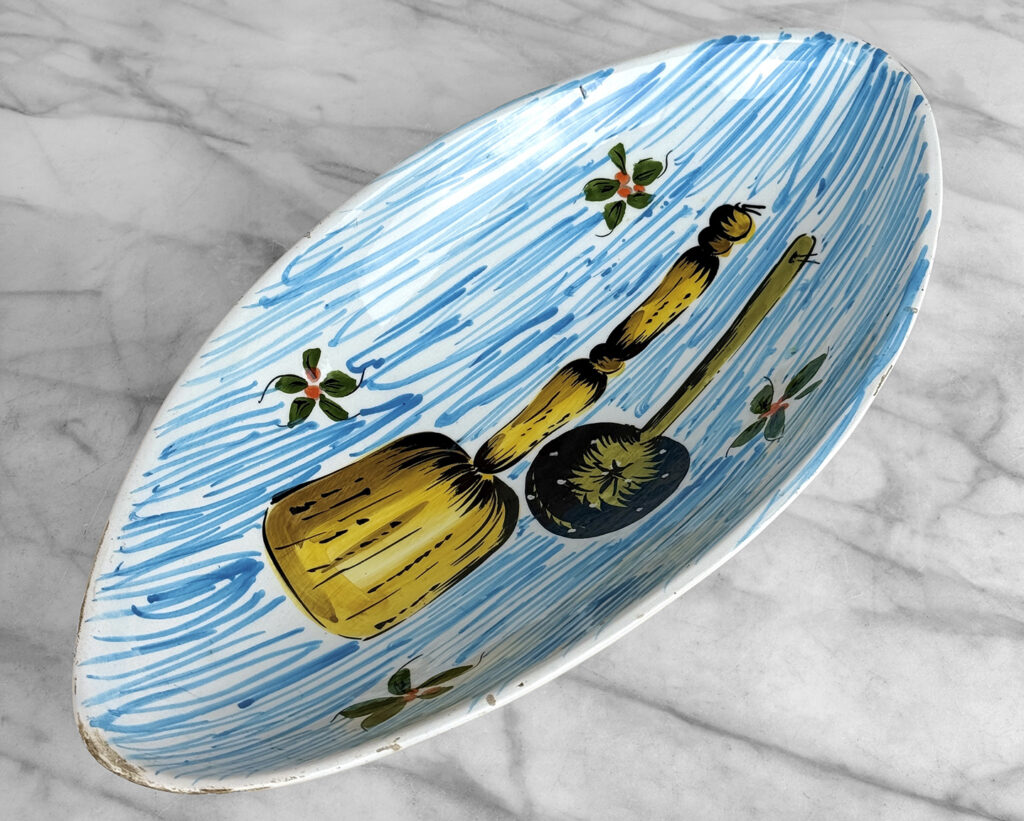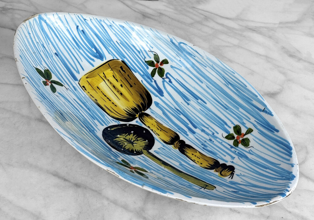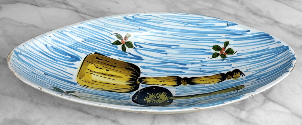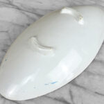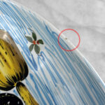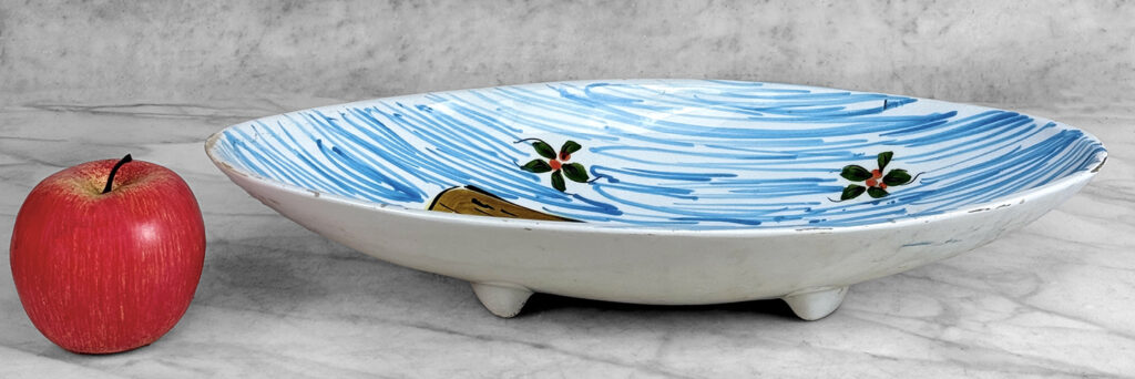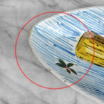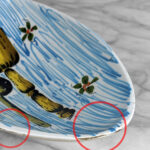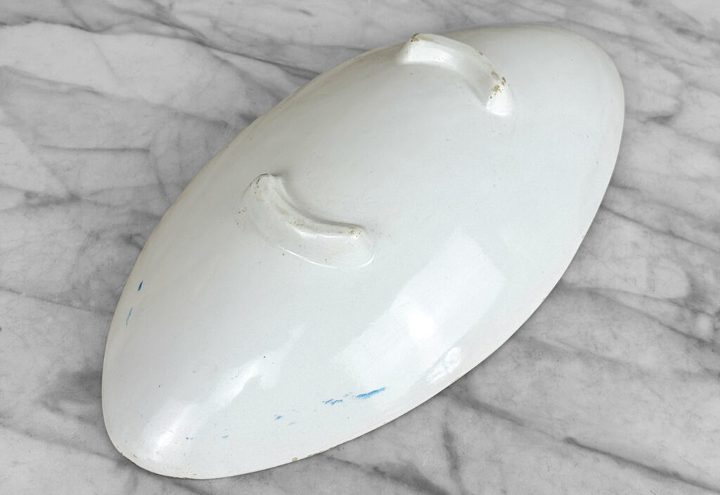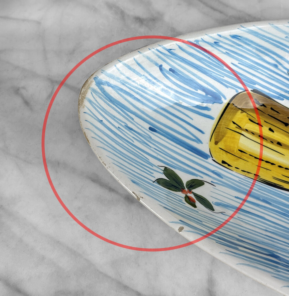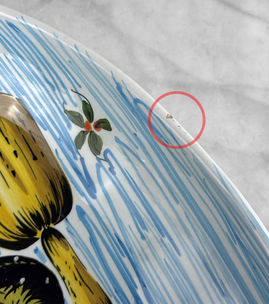 There aren’t any cracks or repairs shown. Worn areas to the glazing and fleabites can be seen along each side of the rim. This is likely from years of resting utensils on the edge.
