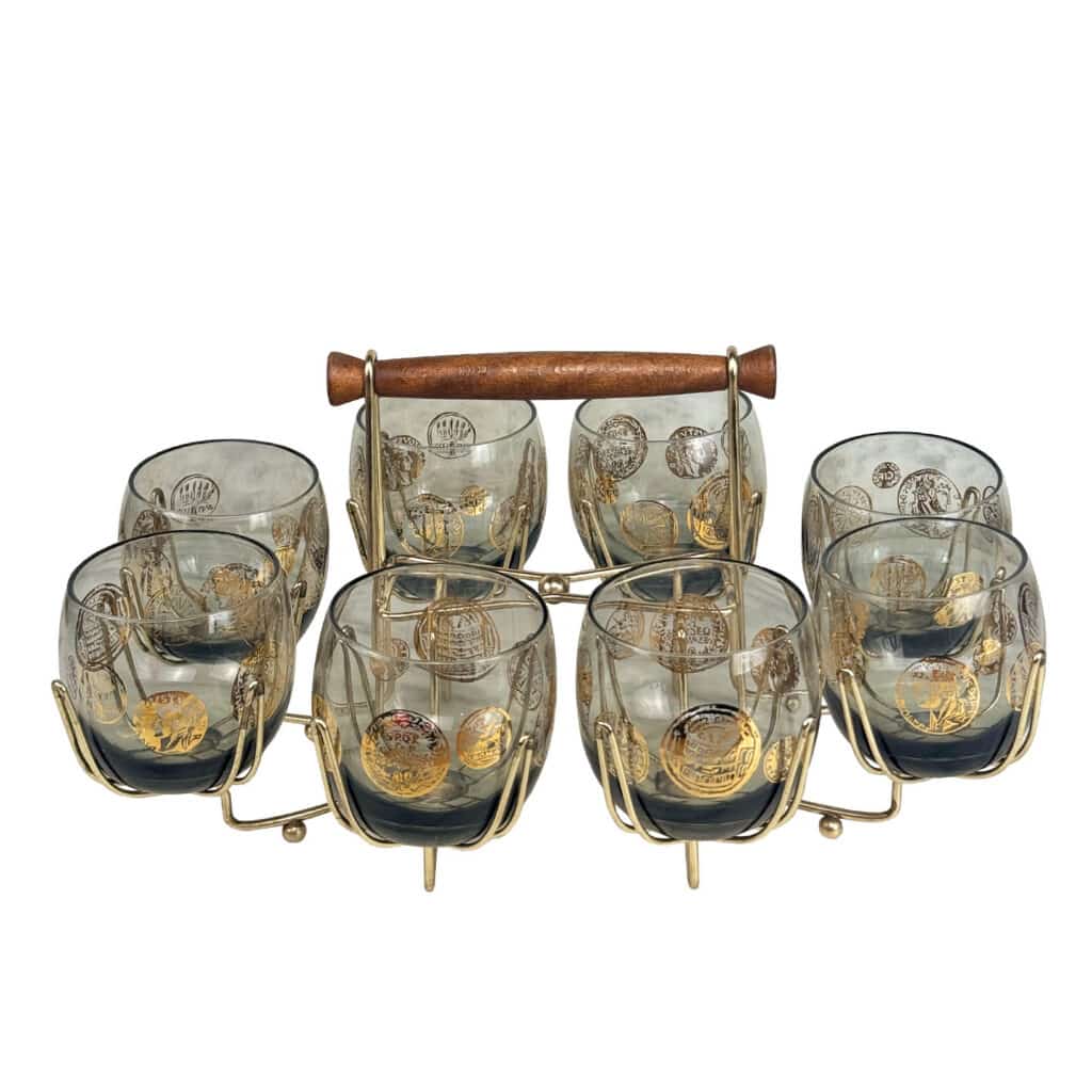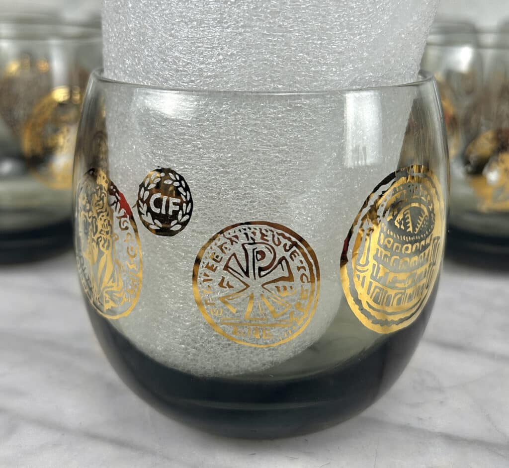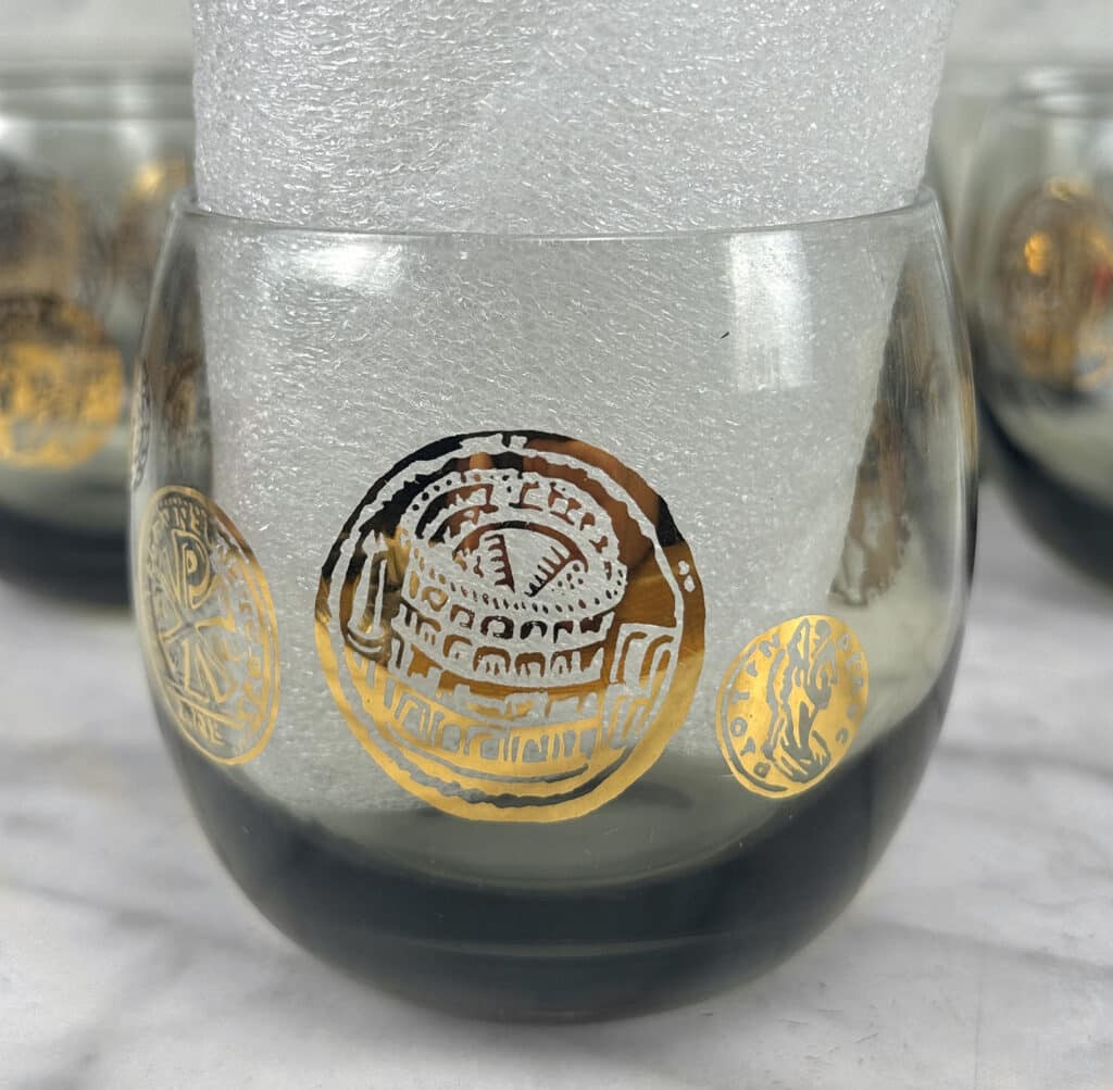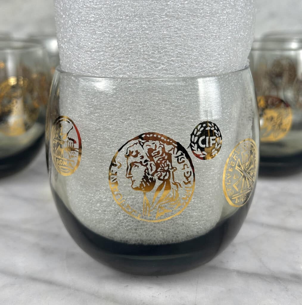 - Set Includes 8 Smoked Glasses with Gilded Italian / Roman Coin Motifs