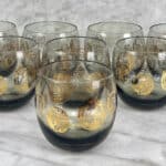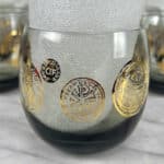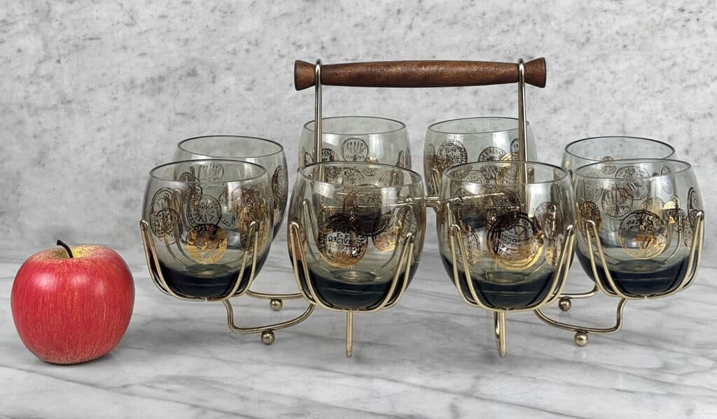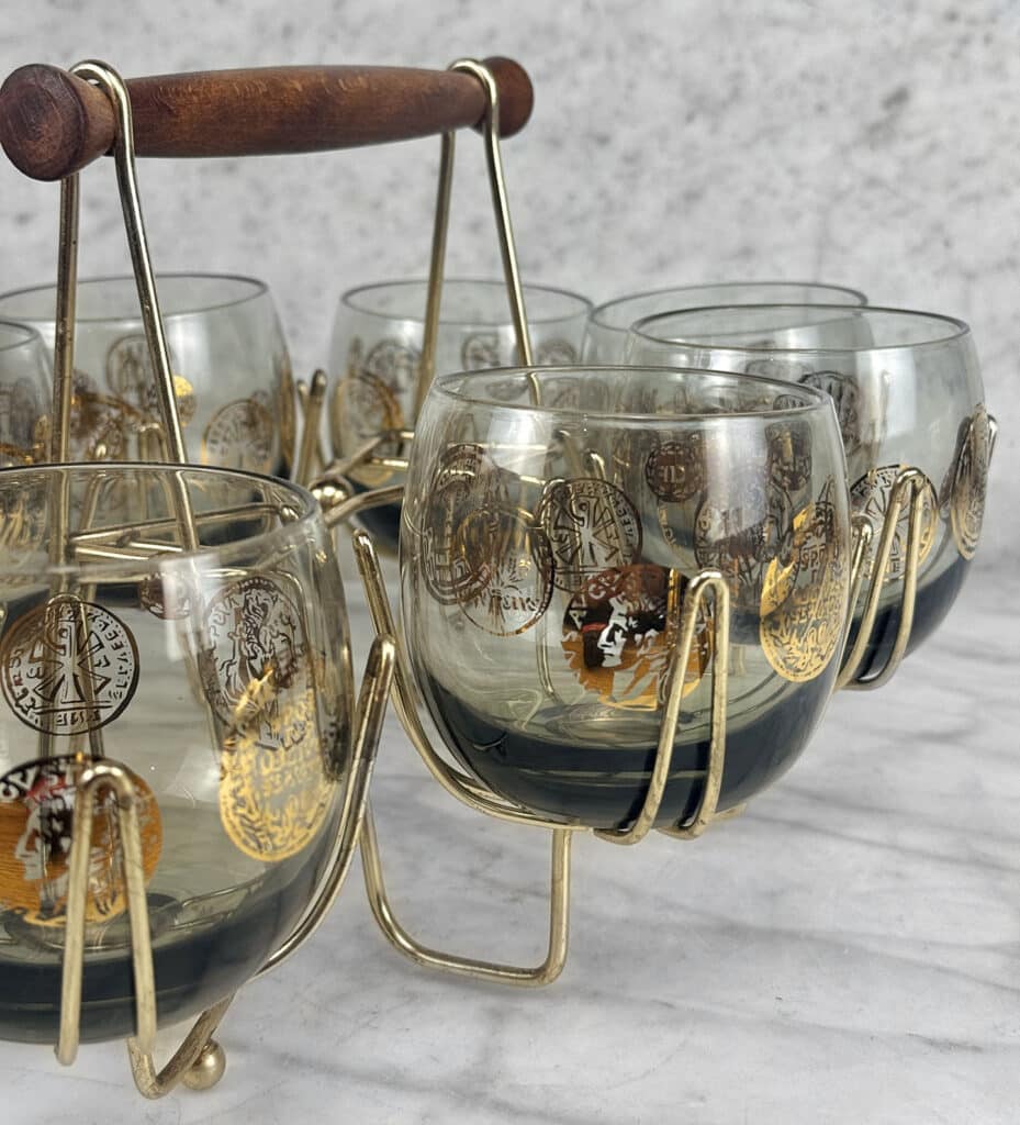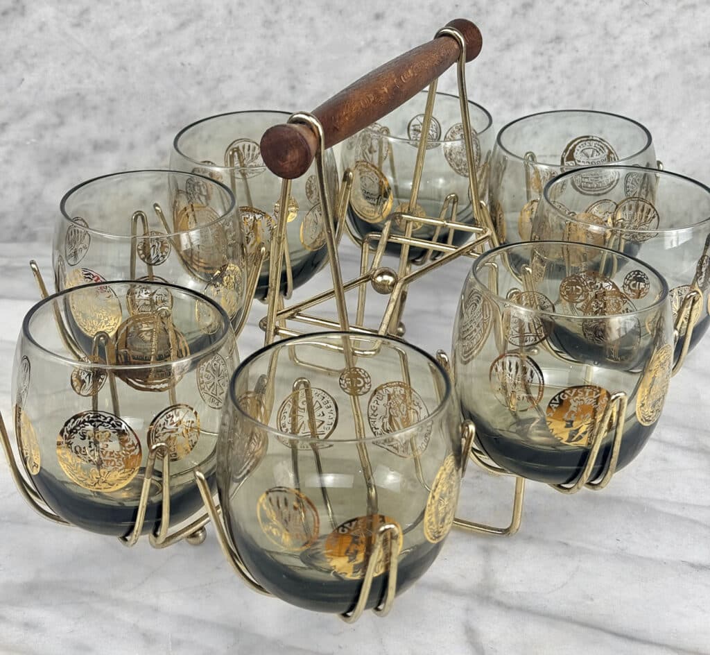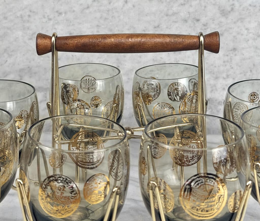 - Set Includes 8 Smoked Glasses with Gilded Italian / Roman Coin Motifs