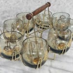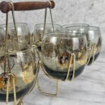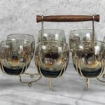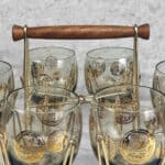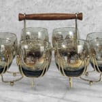 Overall good condition without any notable flaws shown. Each glass is clean, without any cracks, chips or repairs shown. The gilding is in great condition. Mild wear to the serving caddy is shown.
