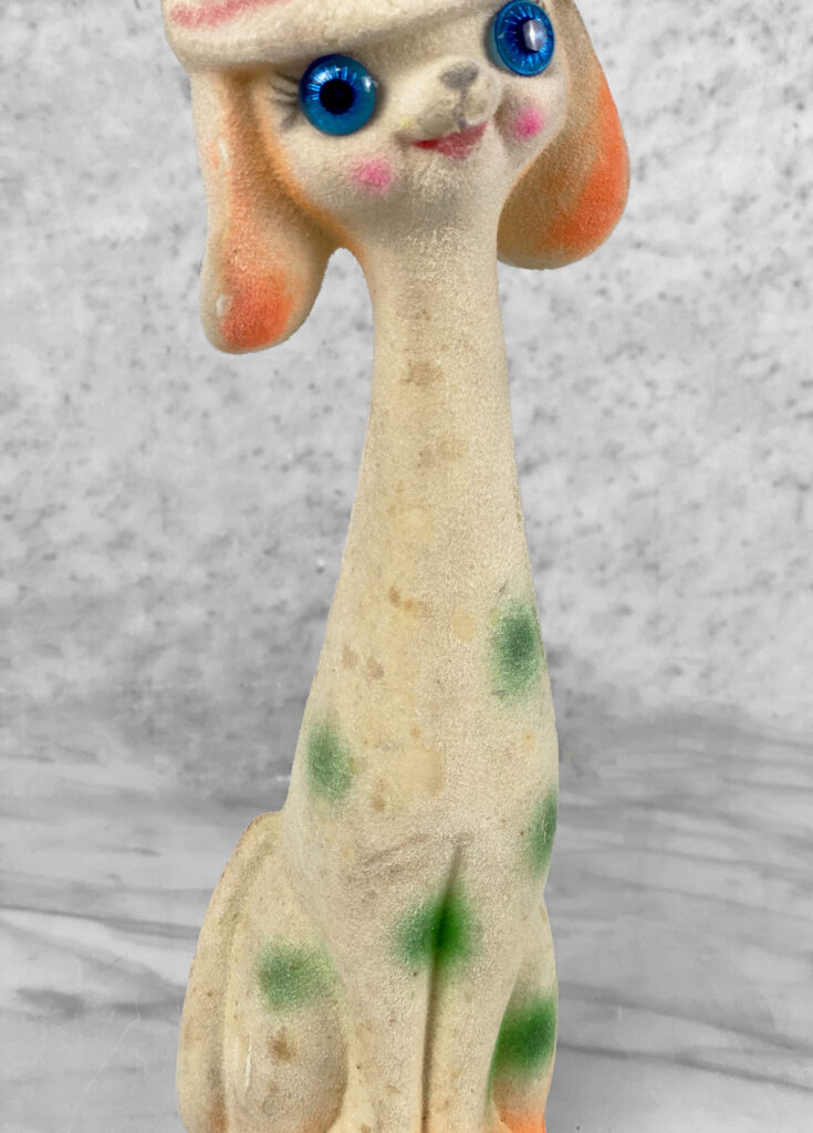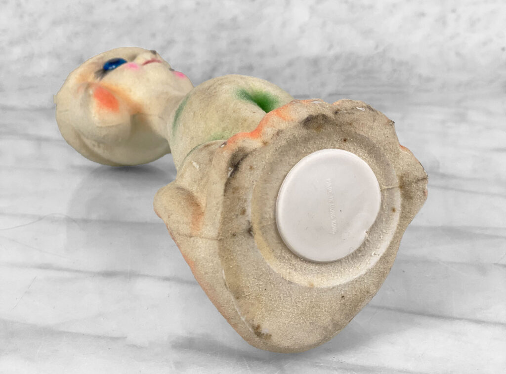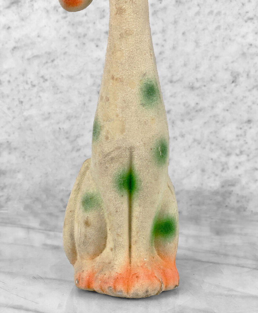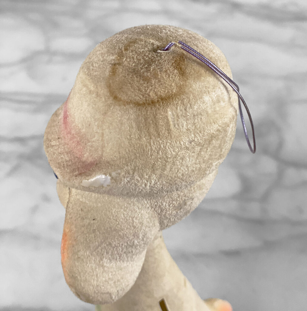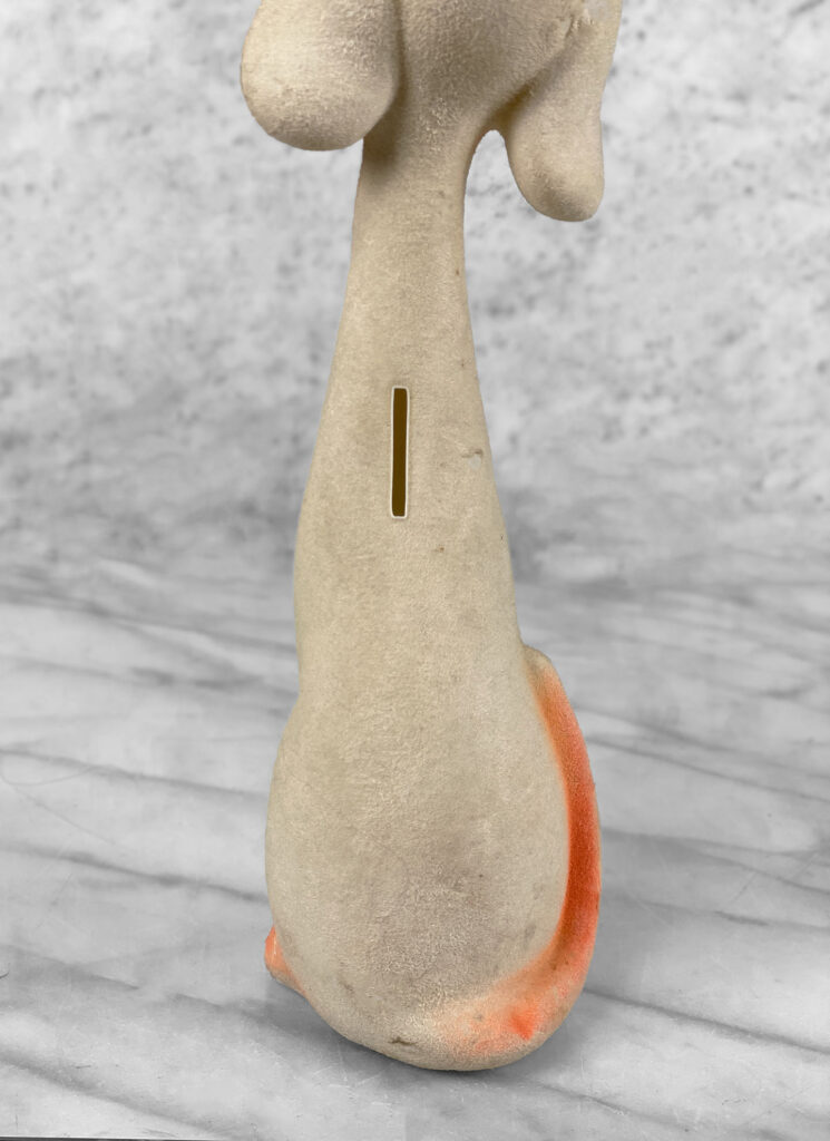 This Unique Carnival Prize Coin Bank shows areas of discoloration along the body of the dog and top of its hat. There isn’t any repairs or breaks shown.