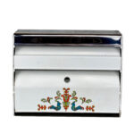 This Kitchen Towel Foil Dispenser is in overall good condition. The Chrome top shows a nice mirrored finish with only mild surface scratches shown. The original white enamel is in good condition for its age, but shows character throughout. Areas of oxidation and surface rust to the finish can be seen along the sides. The interior is clean, but shows oxidation from age. Each Compartment opens and closes as it should.