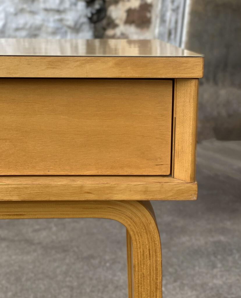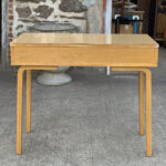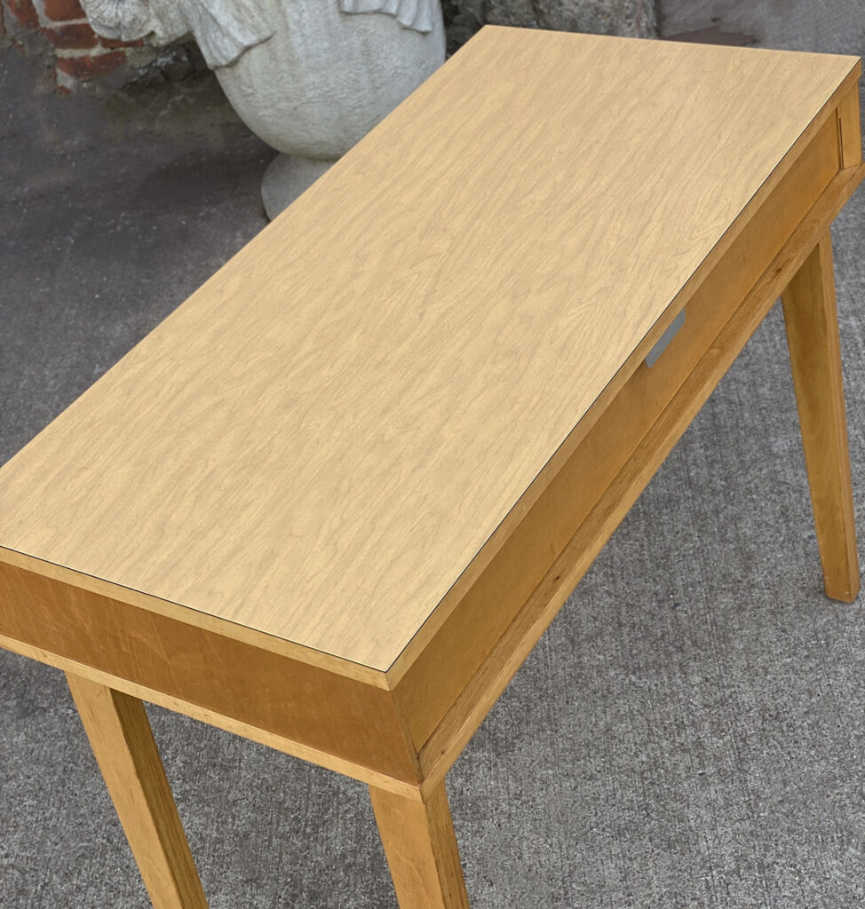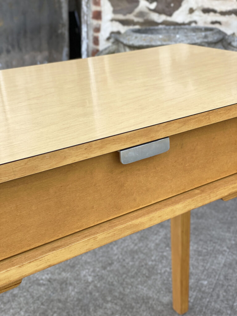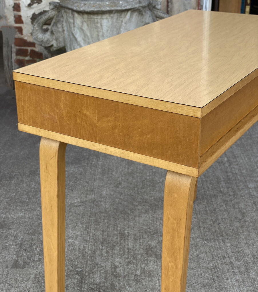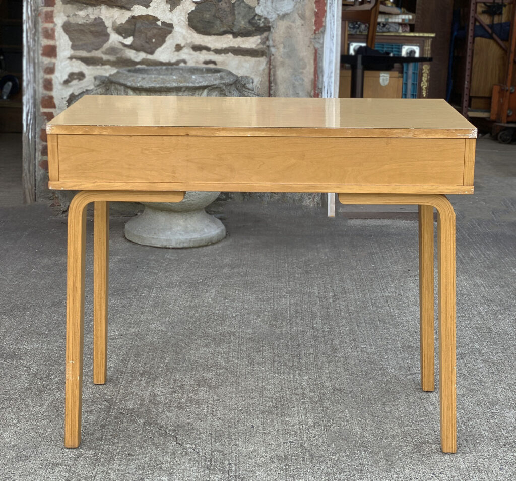 This Thonet Desk pairs nicely with many Mid-Century inspired interiors. The rectangle laminated top offers a spacious writing surface, accompanied by a single storage drawer which is nicely recessed within the desks design. The drawer opens and closes as it should and is embellished with a contrasting brushed steel pull. The sides and back are finished in a beech wood veneer with original satin finish. The ply legs are nicely sculpted, showing Thonet’s iconic bentwood process. The legs of the table will be removed during transport. The inside drawer shows the original Thonet label but is torn.