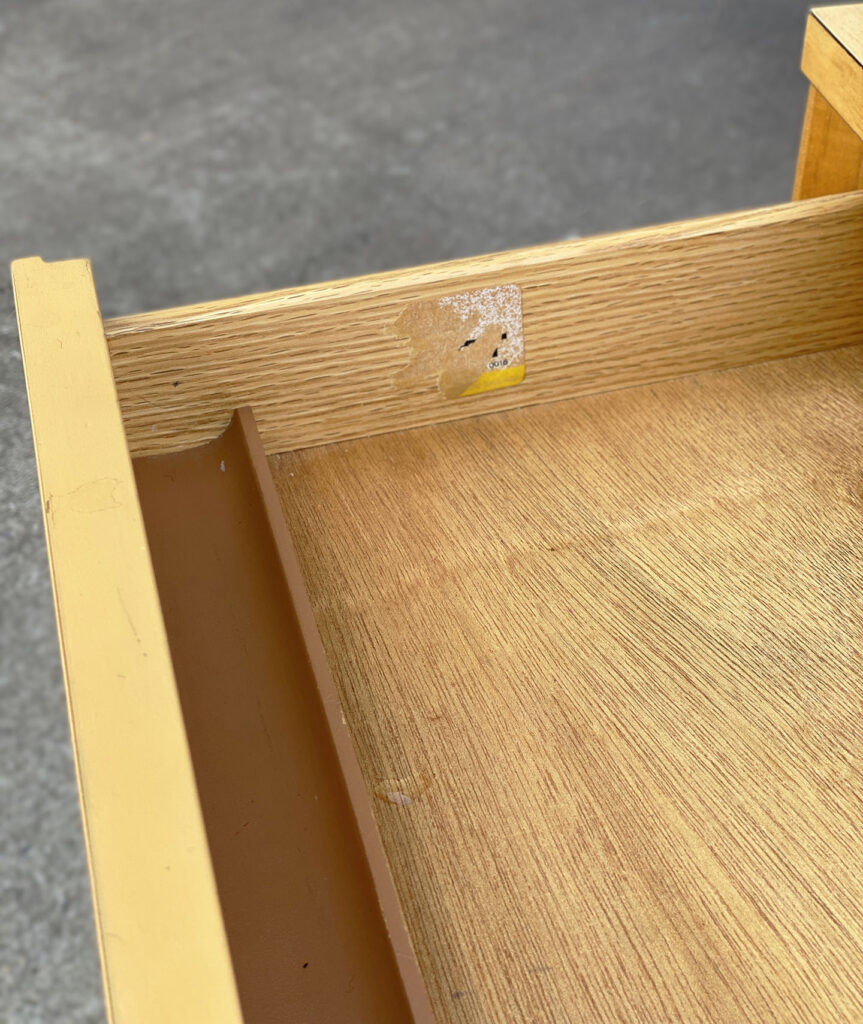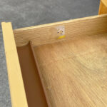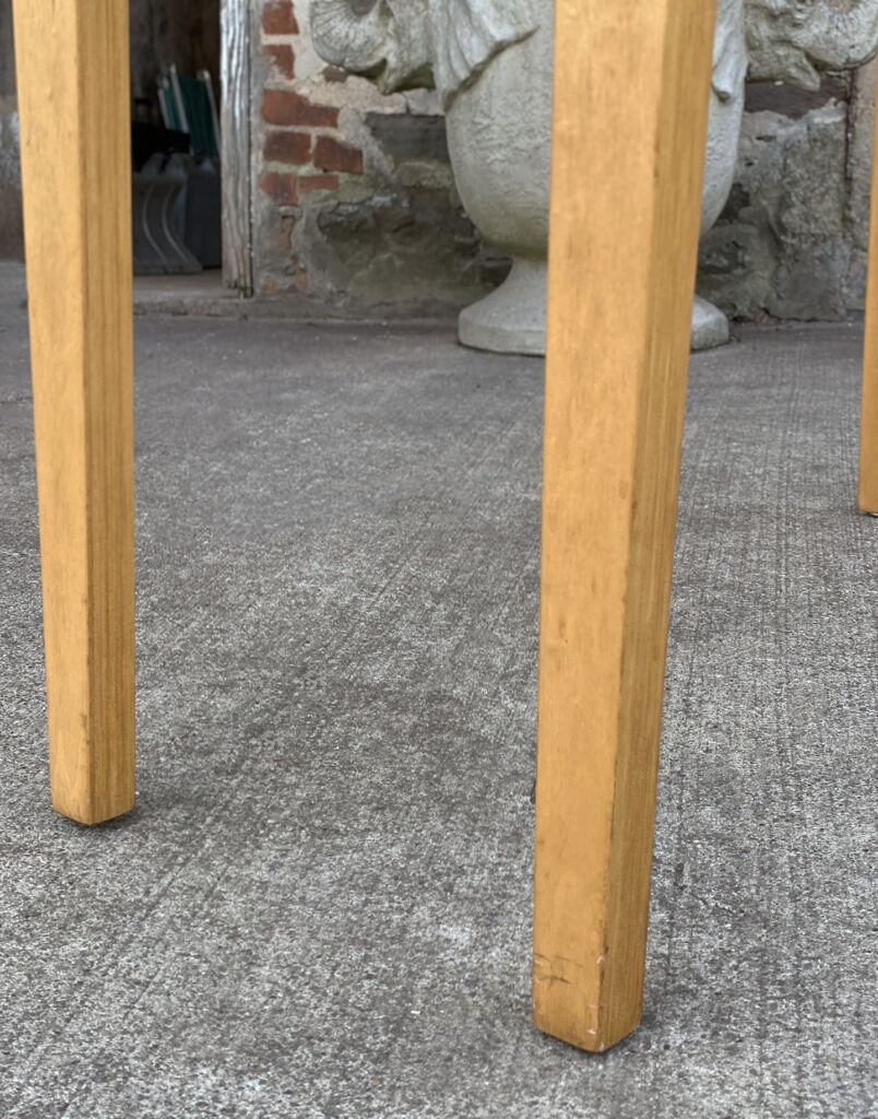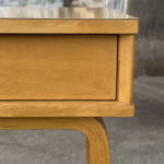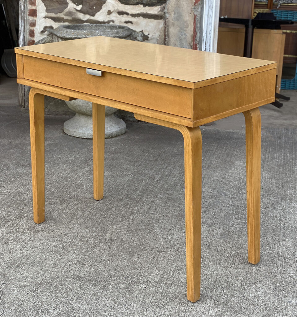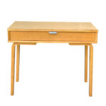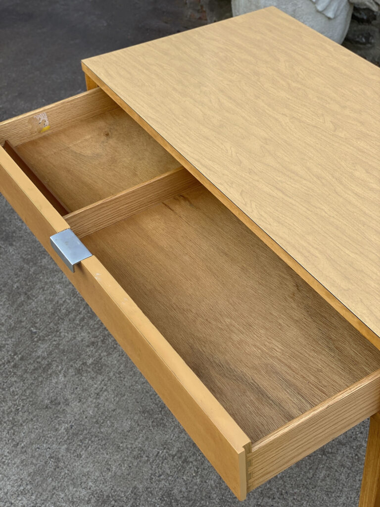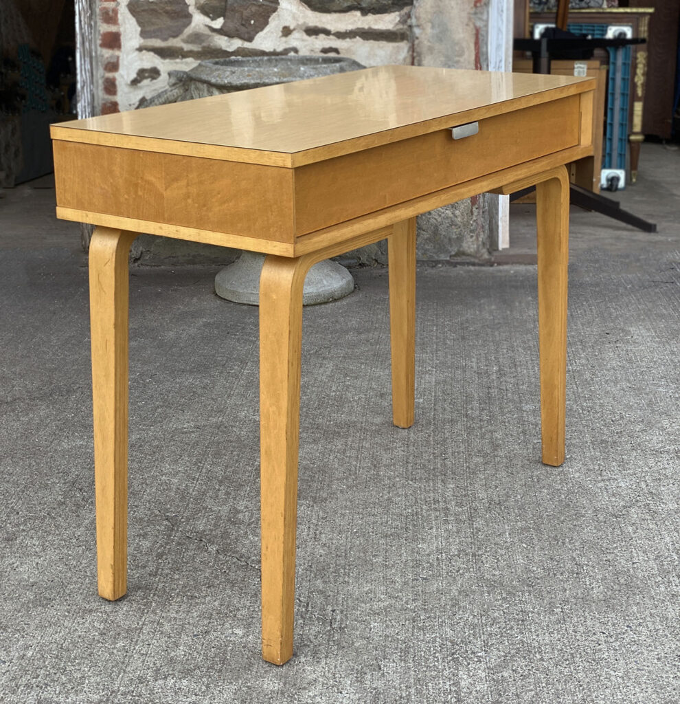 This Thonet Desk pairs nicely with many Mid-Century inspired interiors. The rectangle laminated top offers a spacious writing surface, accompanied by a single storage drawer which is nicely recessed within the desks design. The drawer opens and closes as it should and is embellished with a contrasting brushed steel pull. The sides and back are finished in a beech wood veneer with original satin finish. The ply legs are nicely sculpted, showing Thonet’s iconic bentwood process. The legs of the table will be removed during transport. The inside drawer shows the original Thonet label but is torn.