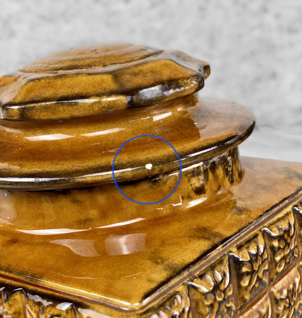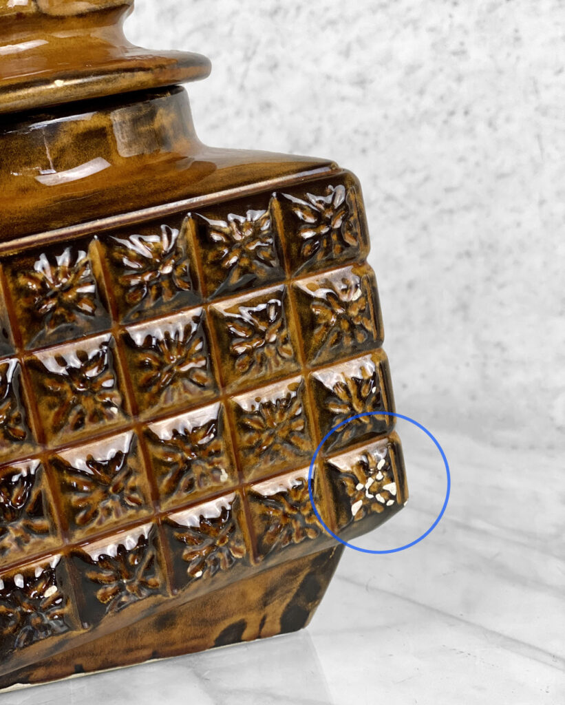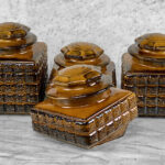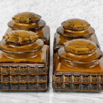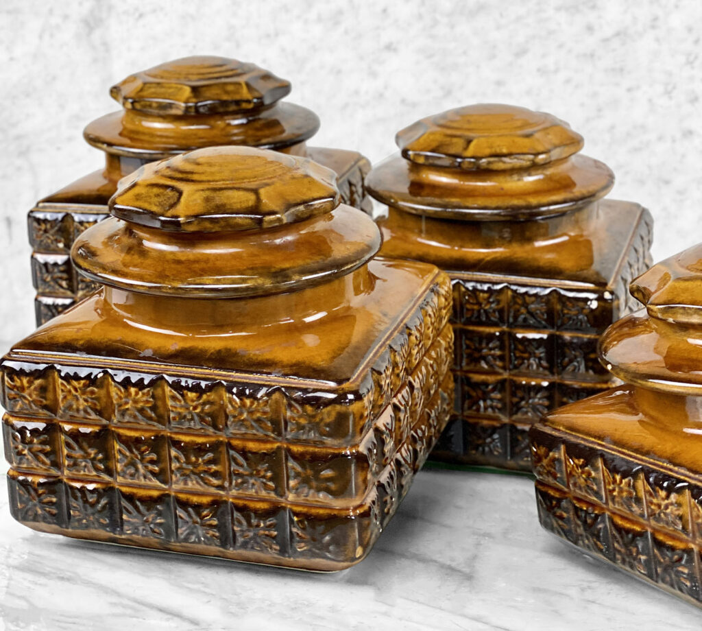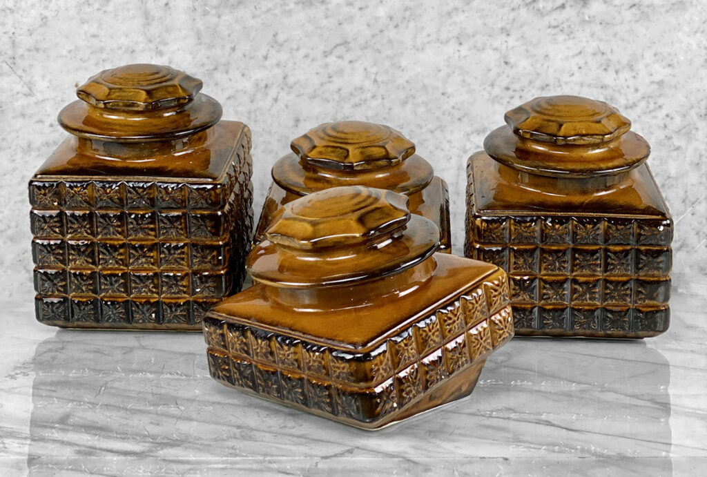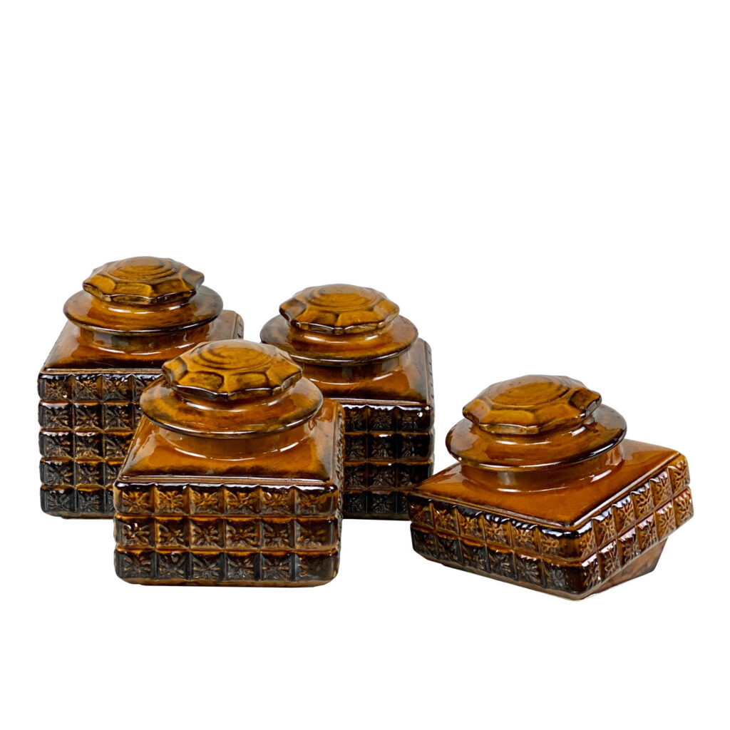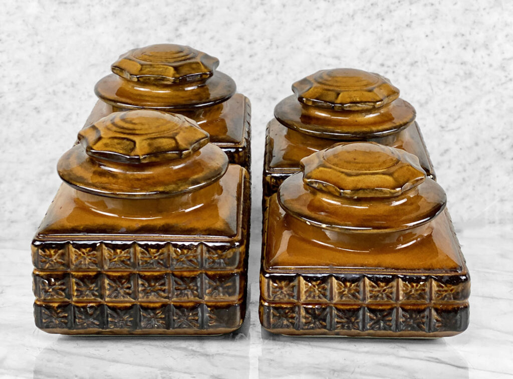 This Set of 4 Mid-Century Canisters are in overall good condition without any cracks or repairs shown. A series of flea bites can be seen along each canister. These areas are circled in our photo gallery to reference. Each lid fits upon the canisters as they should. The interiors are clean and ready to be used.