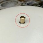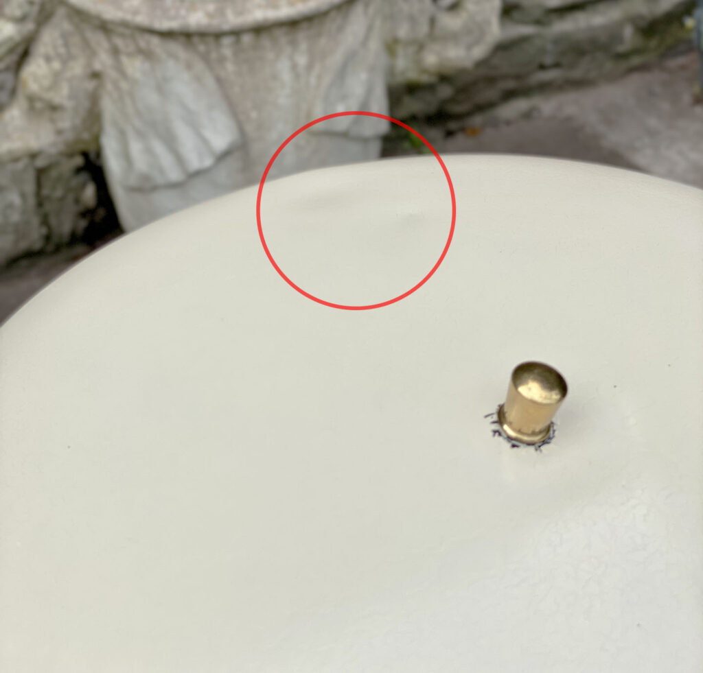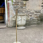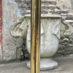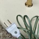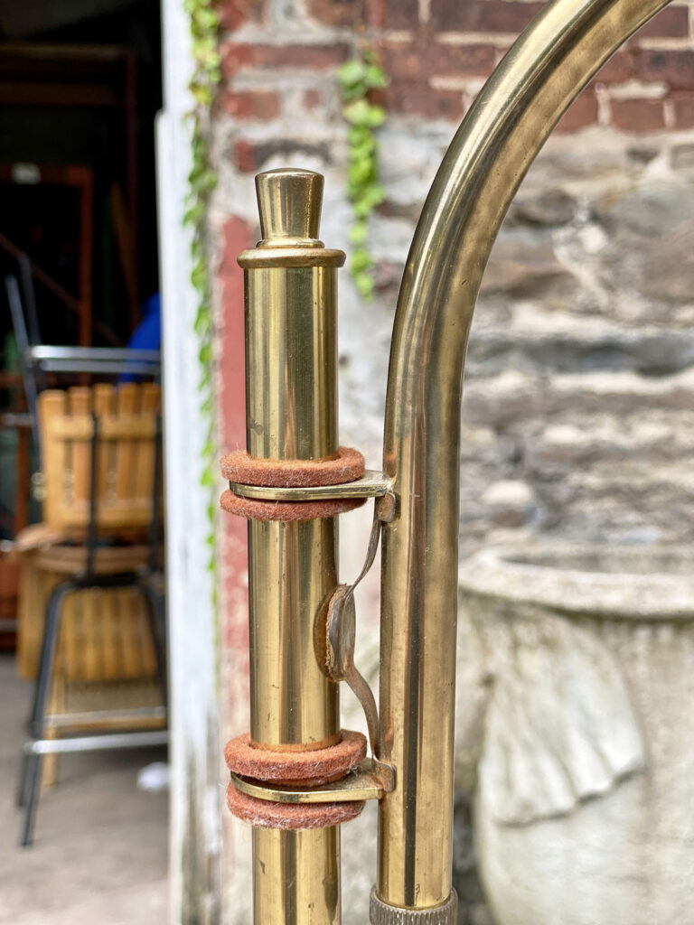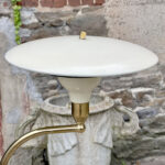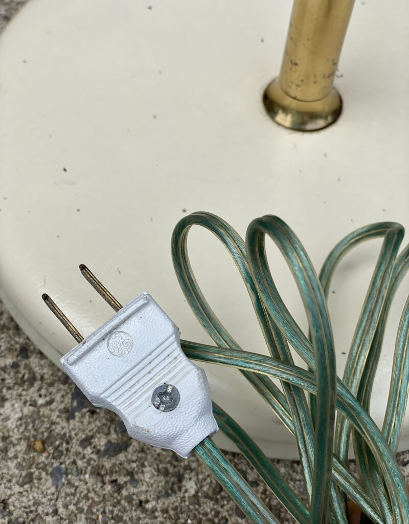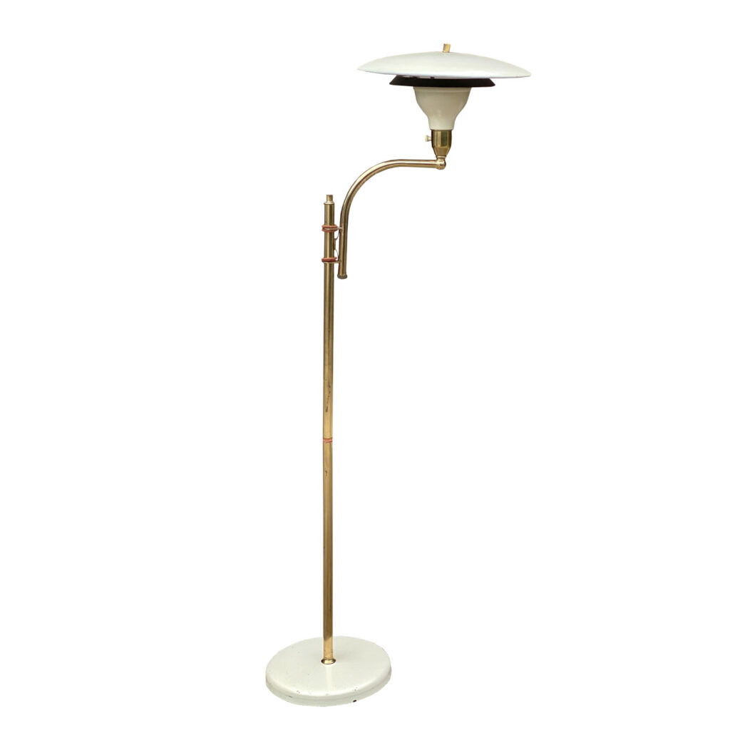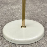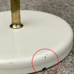 This Mid-Century Sight Light Floor Lamp is fully tested and works as it should, it does not require rewiring. The small brass finial along the top of the shade is slightly crooked. A series of small dents are present along the shade top, they’re very hard to make out, and even harder to photograph. Tarnishing along the brass stem is shown from age. The base shows wear to the original enamel finish. These areas of wear are circled in our photo gallery to reference.