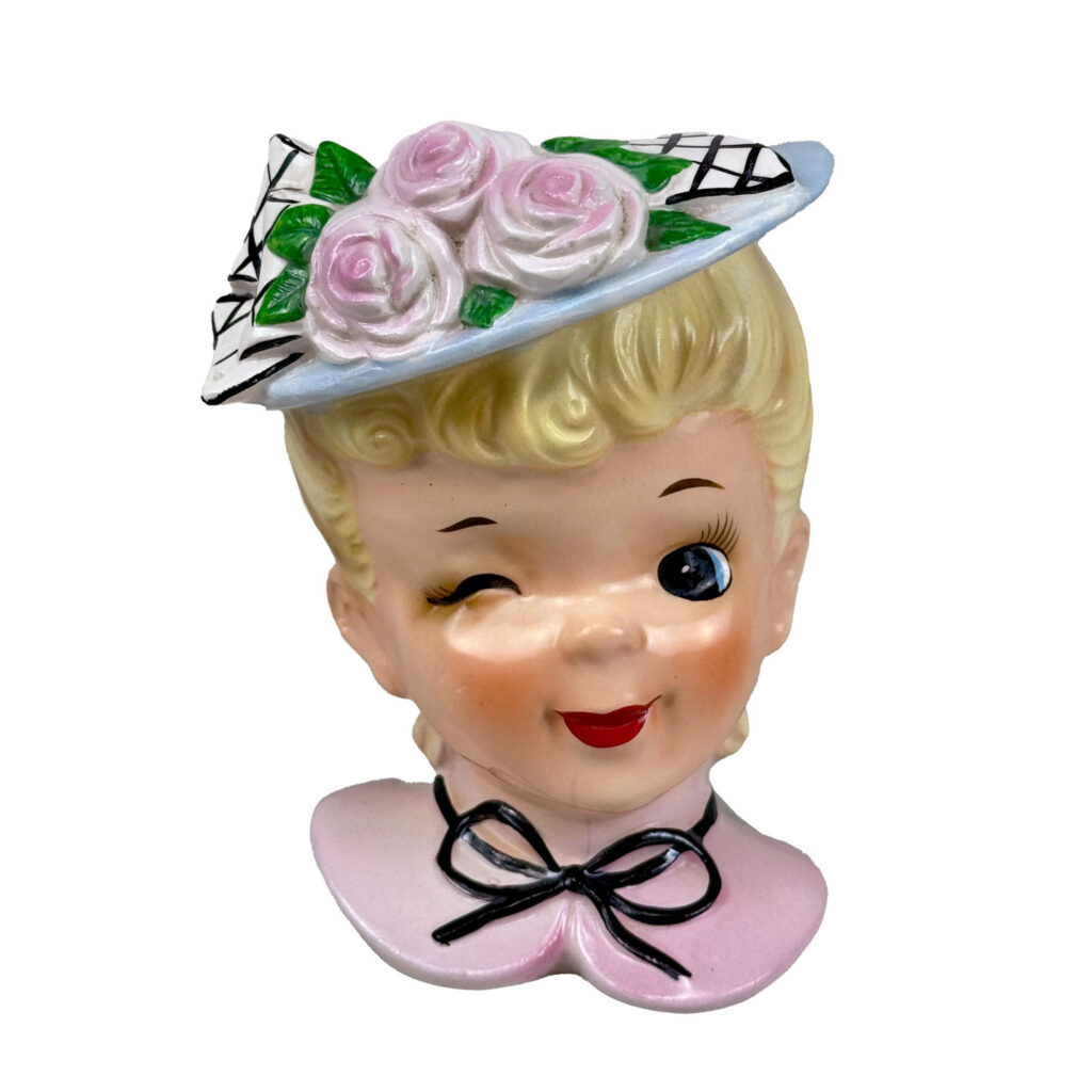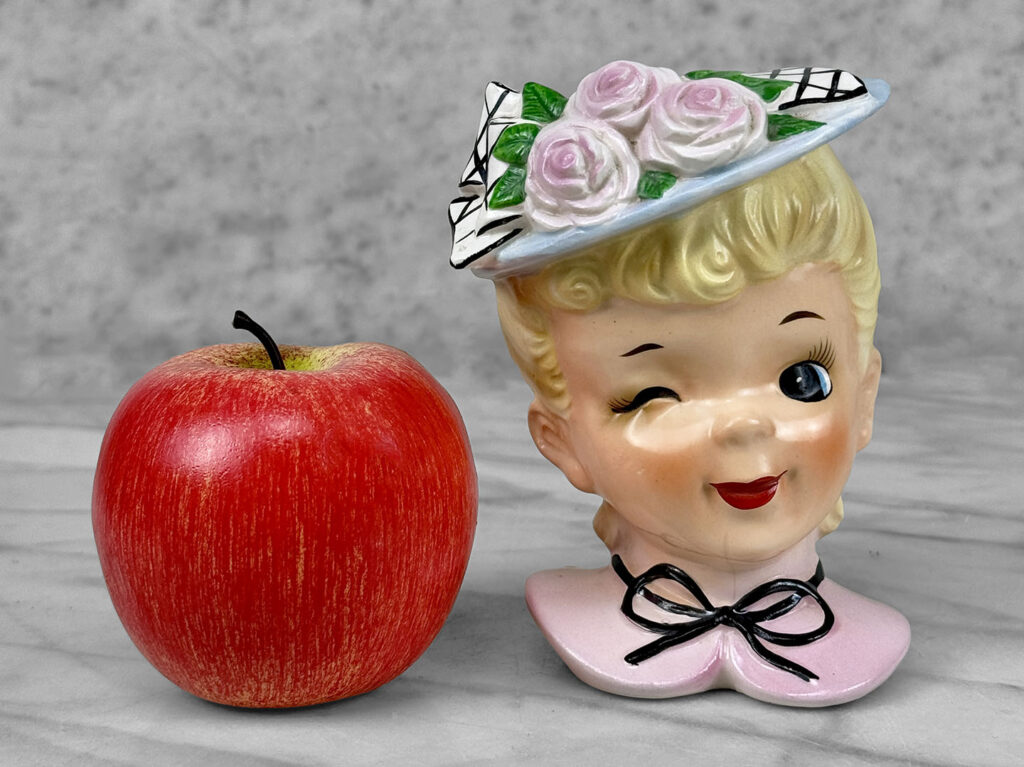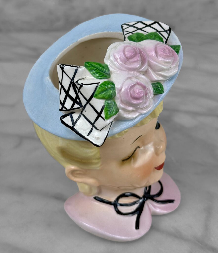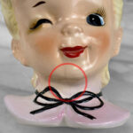 This Head Vase is in overall good condition without any chips or repairs shown. An area of crazing can be seen along the chin region. We’ve circled this area in our photo gallery to reference.