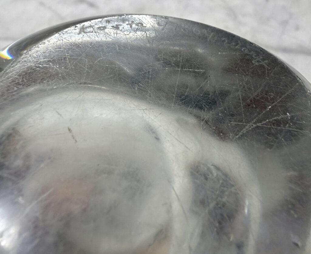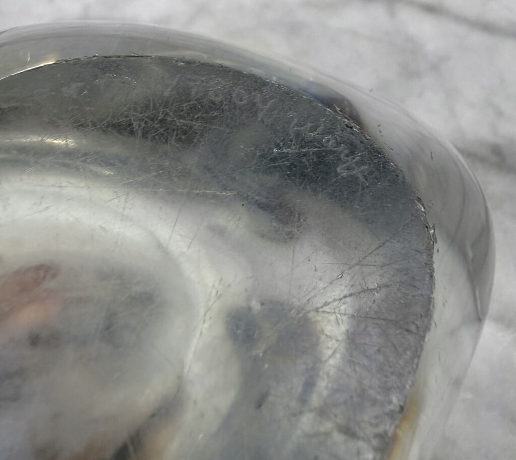 Overall good condition. Mild discoloration to the interior. Scratches and flea bites along the bottom and edge can be seen.