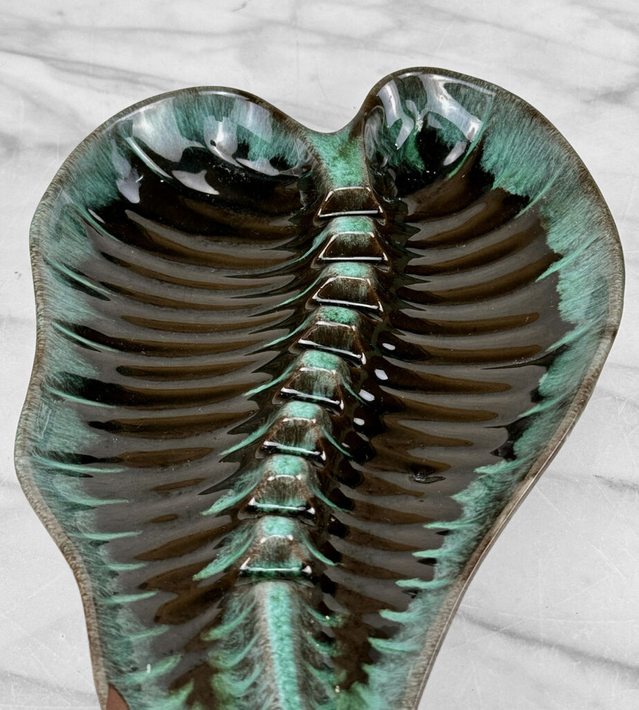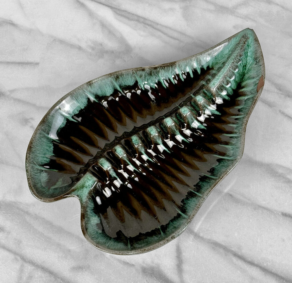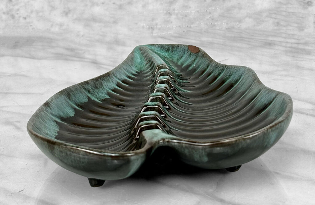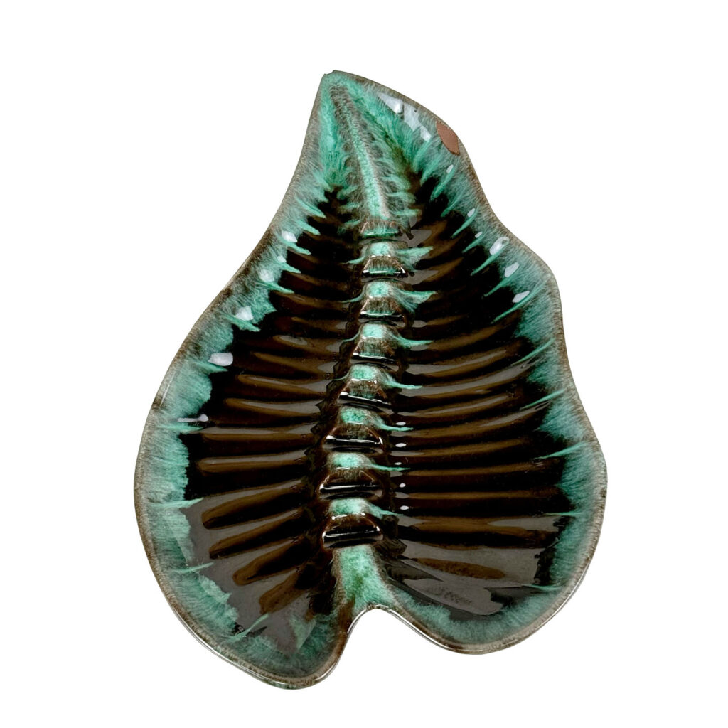 Mid-Century Porcelain Turquoise Drip Art Pottery Foliage Leaf Cigar Ashtray