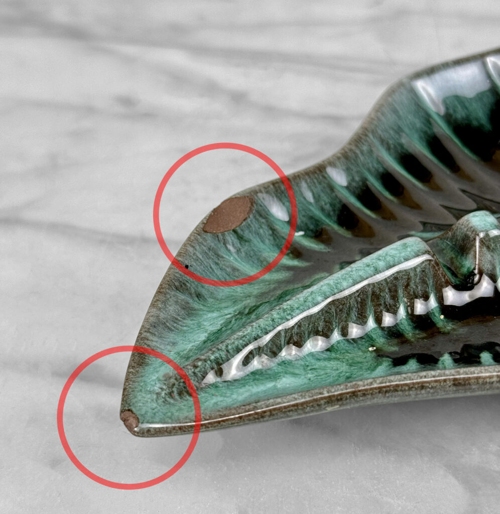 This Porcelain Leaf Ashtray shows a fleabite along the tip of the leaf, as well as a larger chip along the rim. These areas have been circled in our photo gallery to reference.