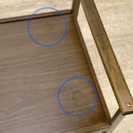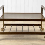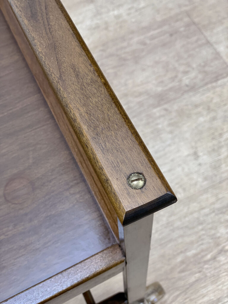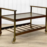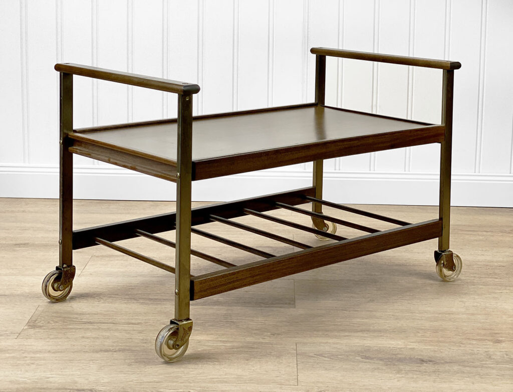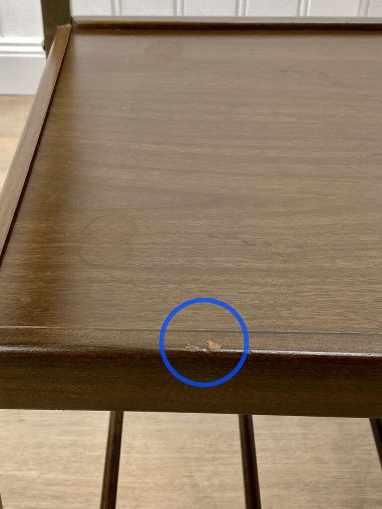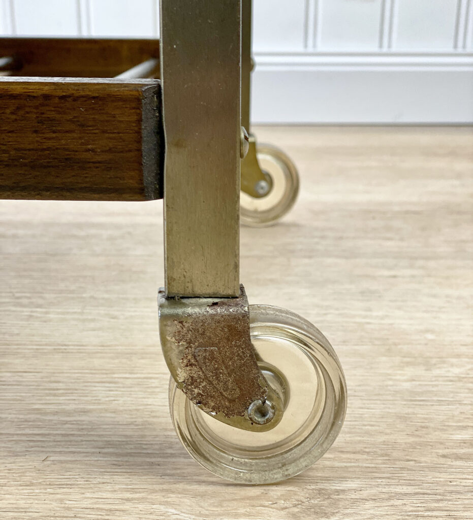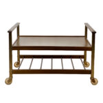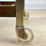 This Mid-Century Bar Cart is in overall good condition. The piece supports a tremendous amount of weight – Staging an entire collection of filled bottles is no problem. Tarnishing and scratches along the metal frame is shown. A series of stains along the top surface can be seen. We’ve circled these areas in our photo gallery to reference. Each caster wheel rolls smoothly and swivels as they should. Wear, patina and gilding loss can be seen along the bottom casters.