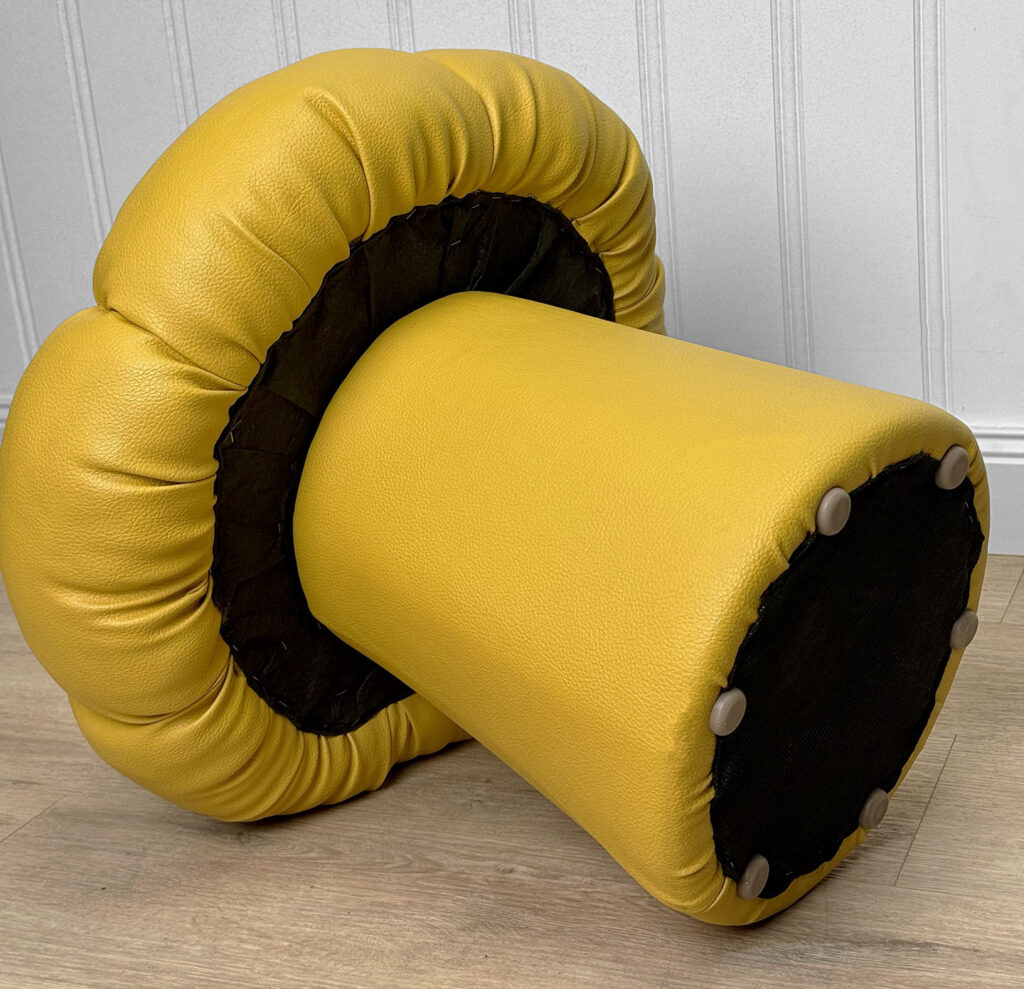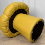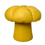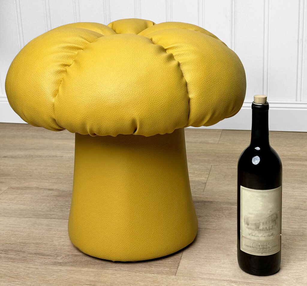 This Mushroom Ottoman was exceptionally well made and supports a tremendous amount of weight. Using it as a daily seat is no problem. The ottoman was professionally reupholstered in a Yellow pebbled vinyl, there aren’t any imperfections shown.
