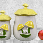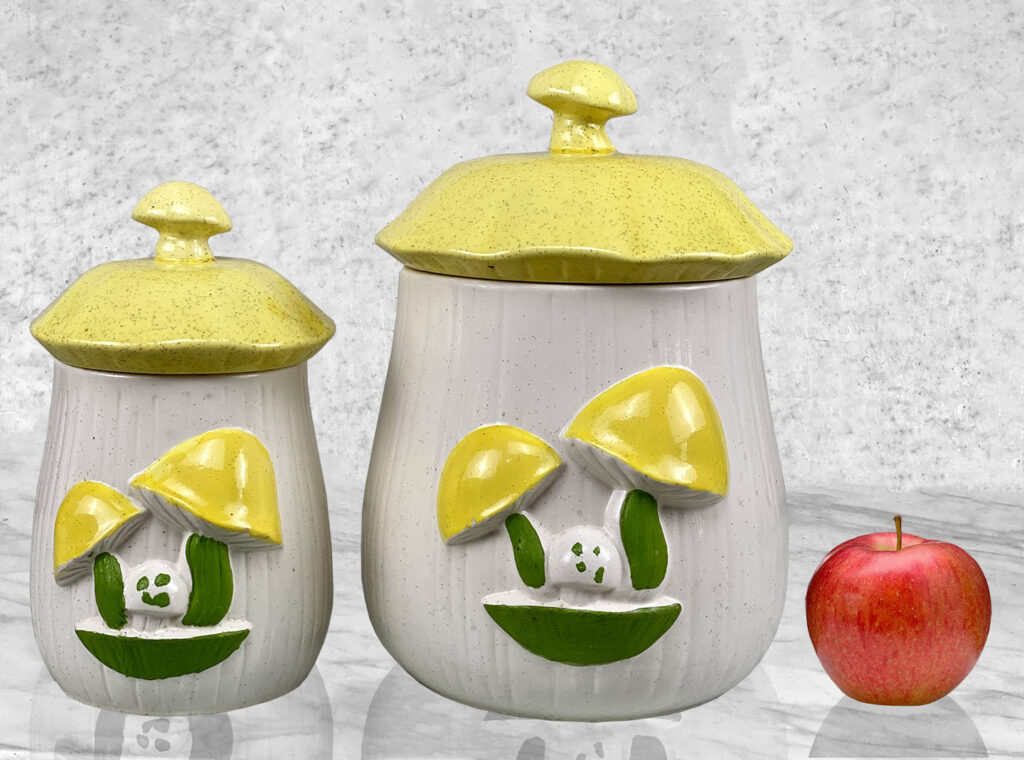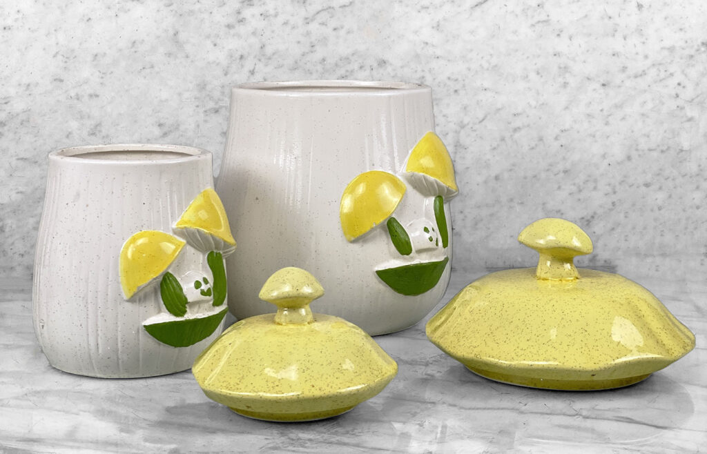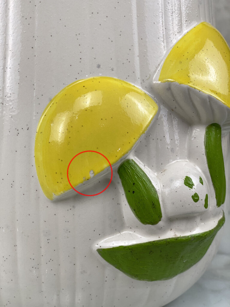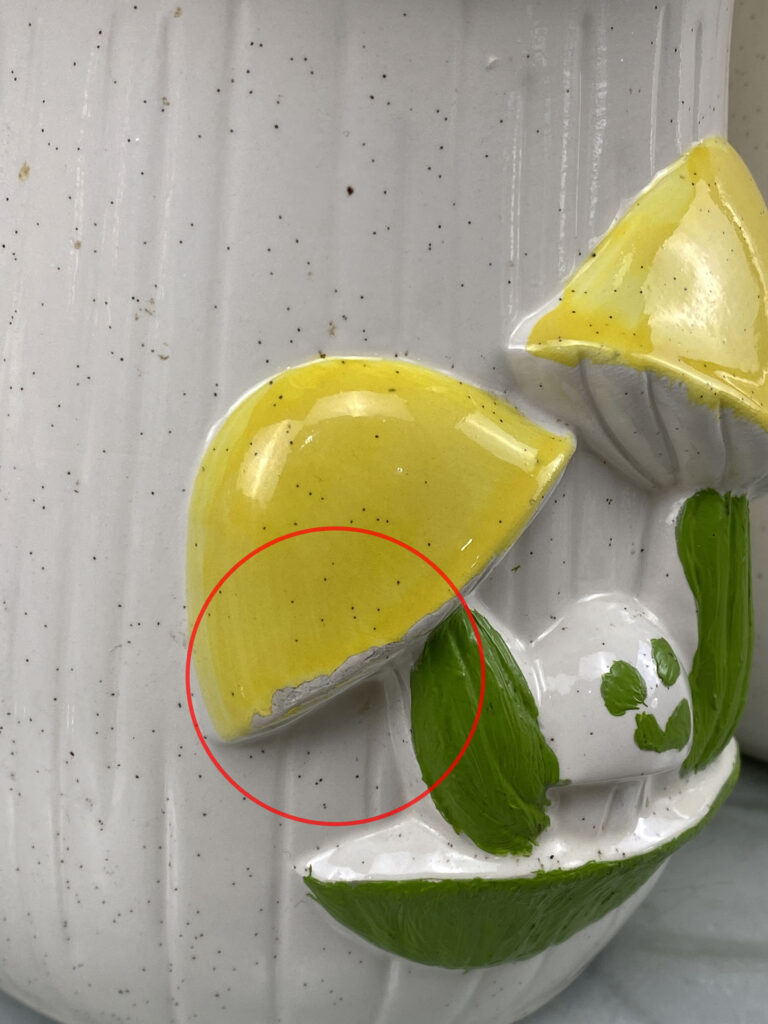 This Pair Mushroom Canisters are in overall good condition. A series of fleabites are shown along each mushroom motif. We’ve circled these areas in our photo gallery to reference. There aren’t any cracks or repairs shown.