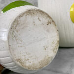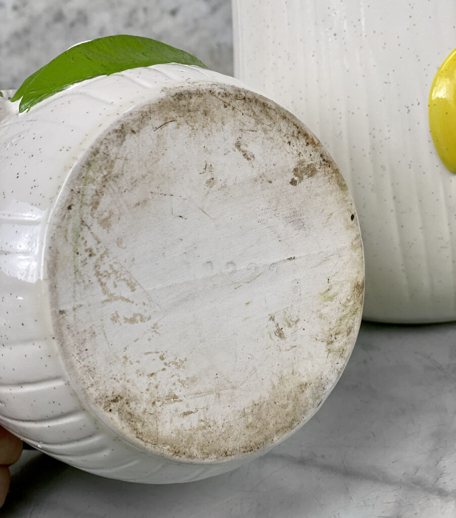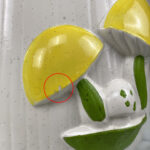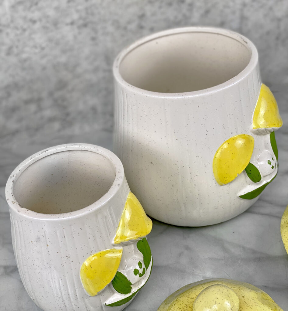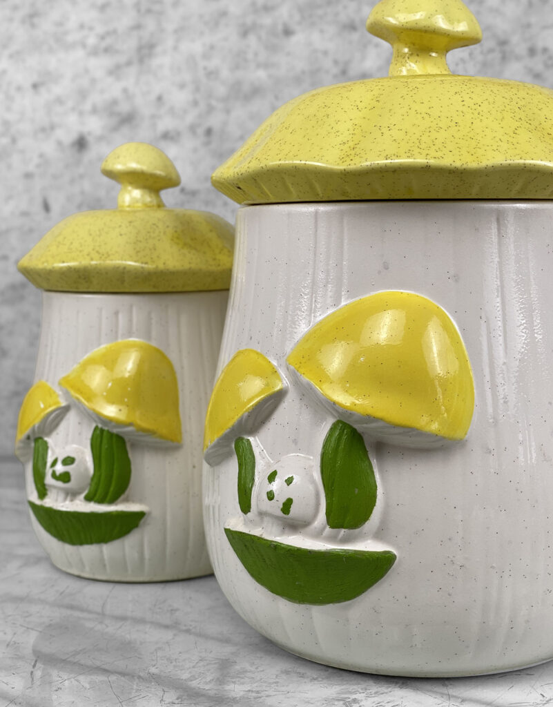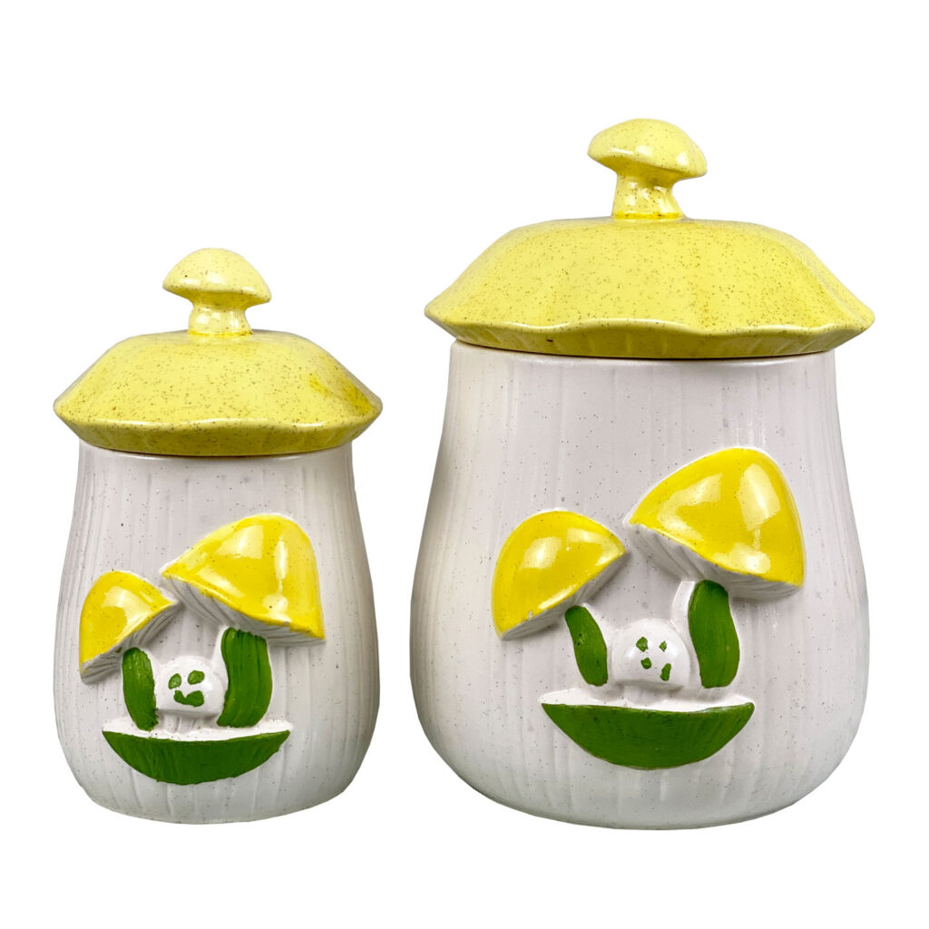 This Pair Mushroom Canisters are in overall good condition. A series of fleabites are shown along each mushroom motif. We’ve circled these areas in our photo gallery to reference. There aren’t any cracks or repairs shown.