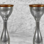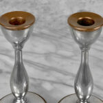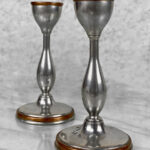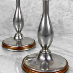 This Pair of Traditional Pewter Candlestick Holders are in overall good condition. The pewter shows mild tarnishing and surface scratches from age.