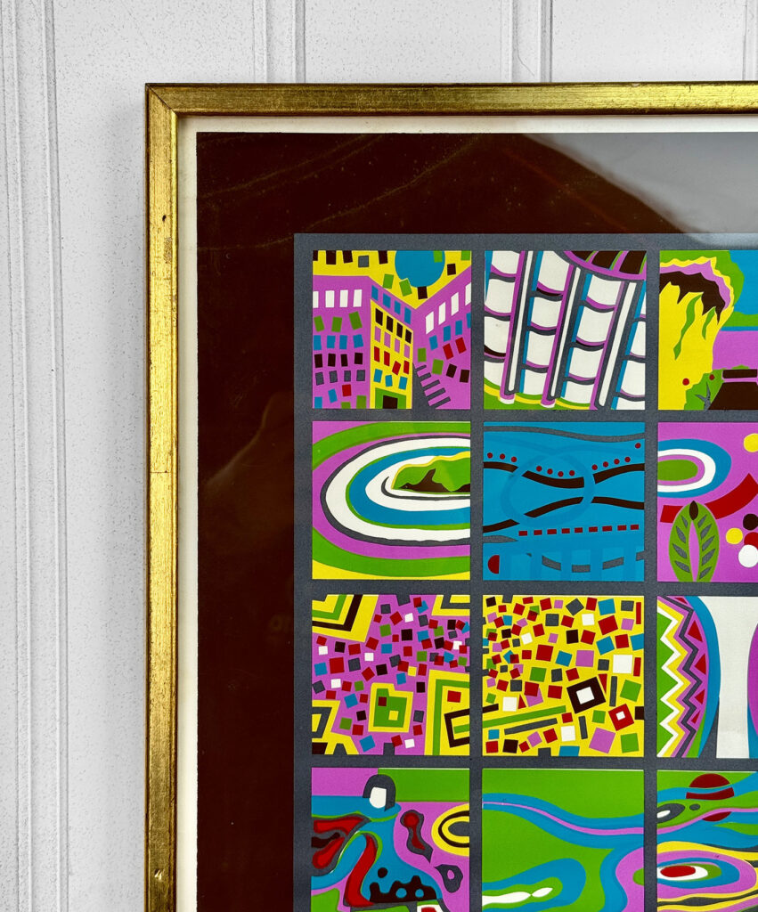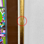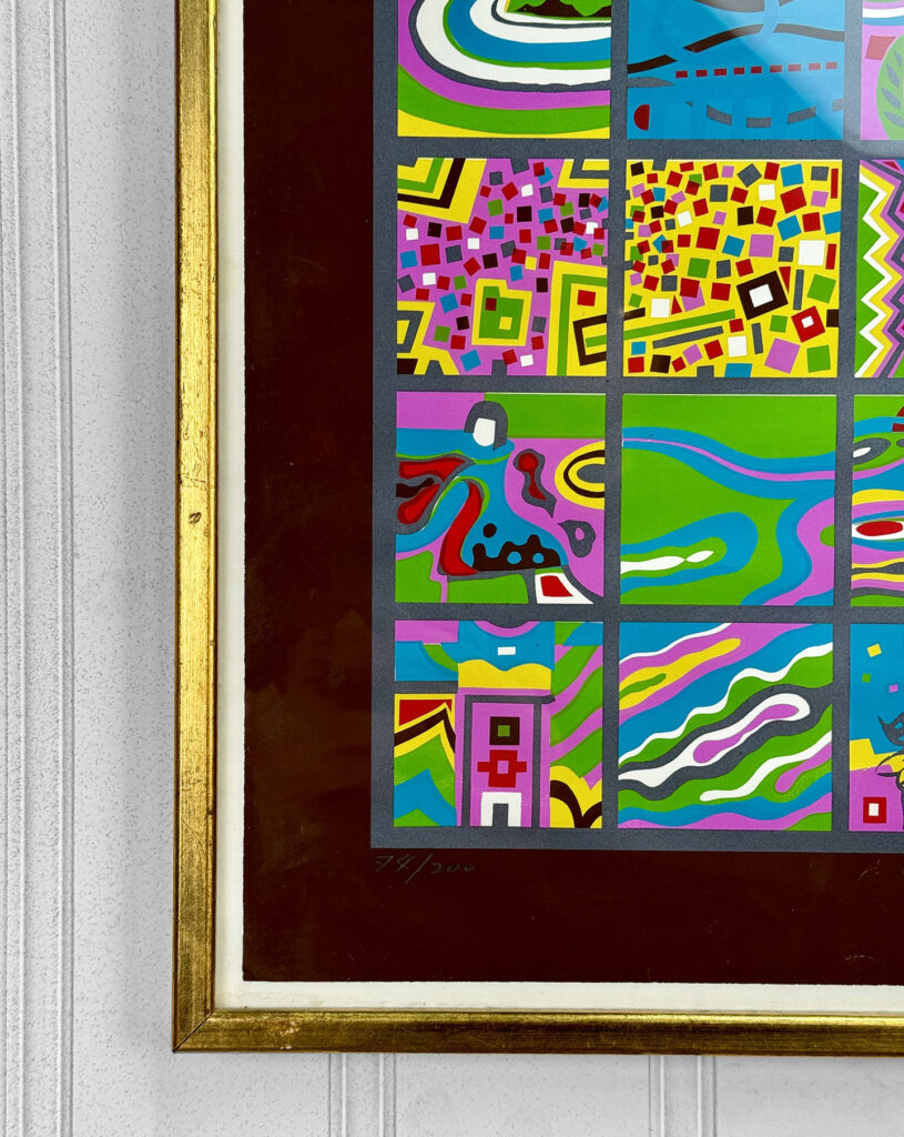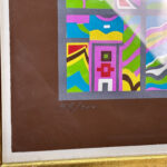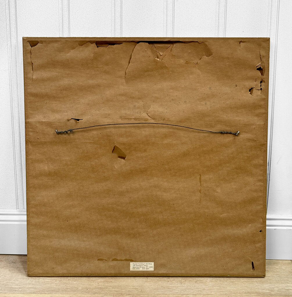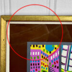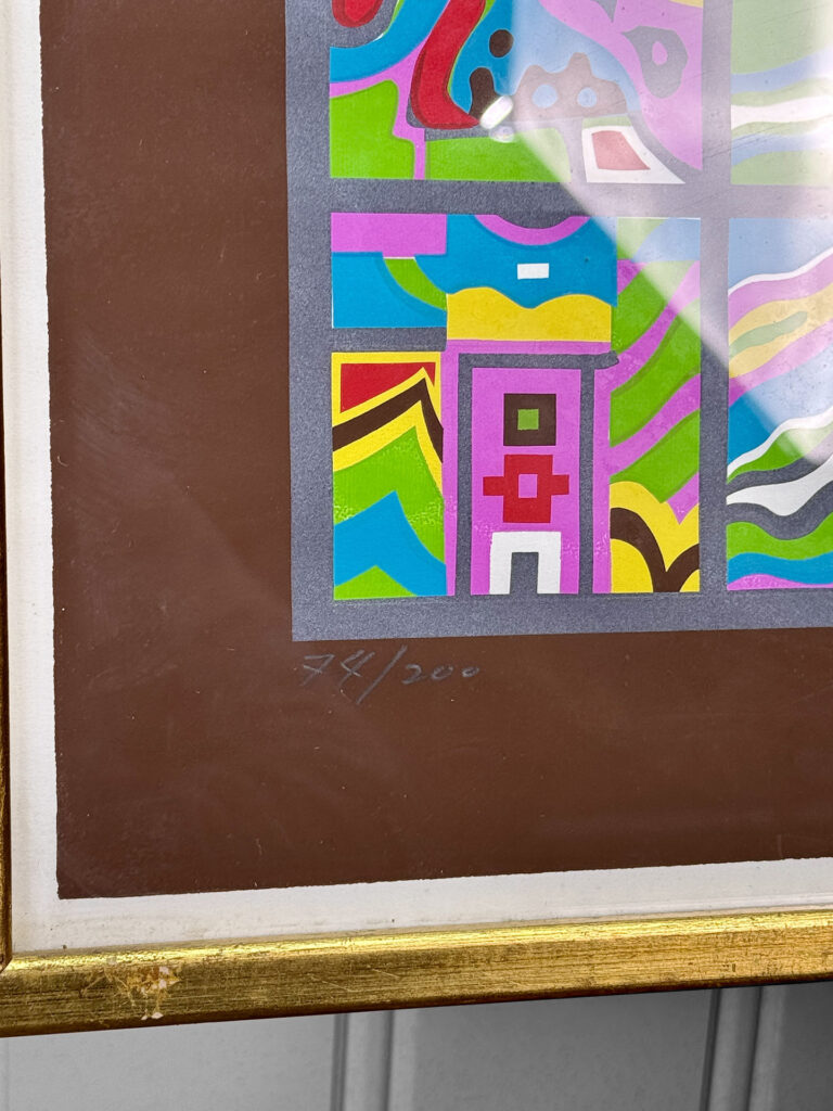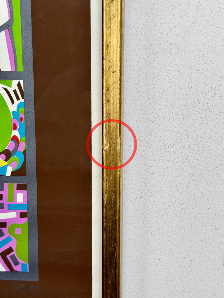 This Risaburo Kumura Serigraph is in overall good condition and looks great while hung. An area of debris can be seen along the interior frame along the matting. This area has been circled in our photo gallery to reference.