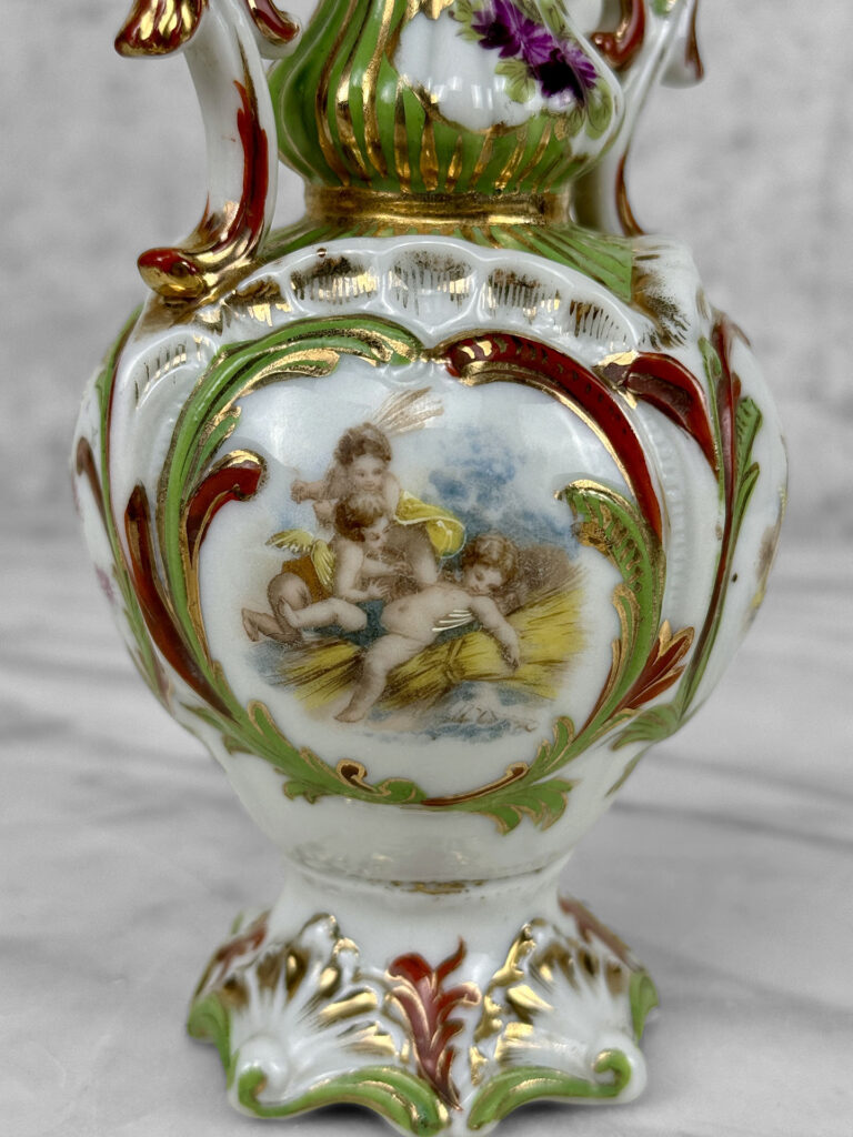 Vintage Rococo Green Porcelain Cherub Motif Handle Vase, c. Mid 20th Century