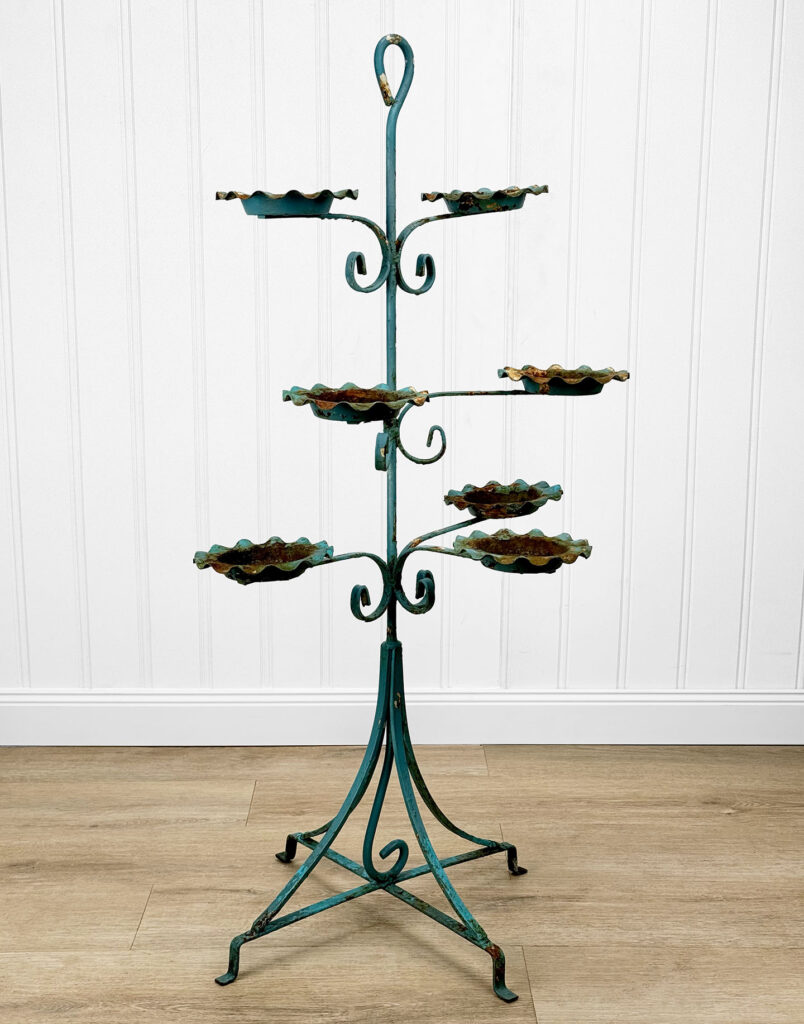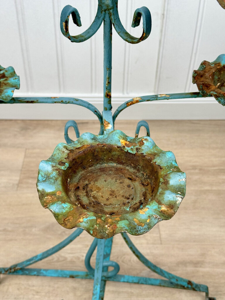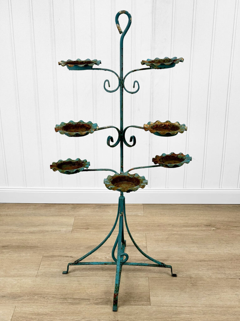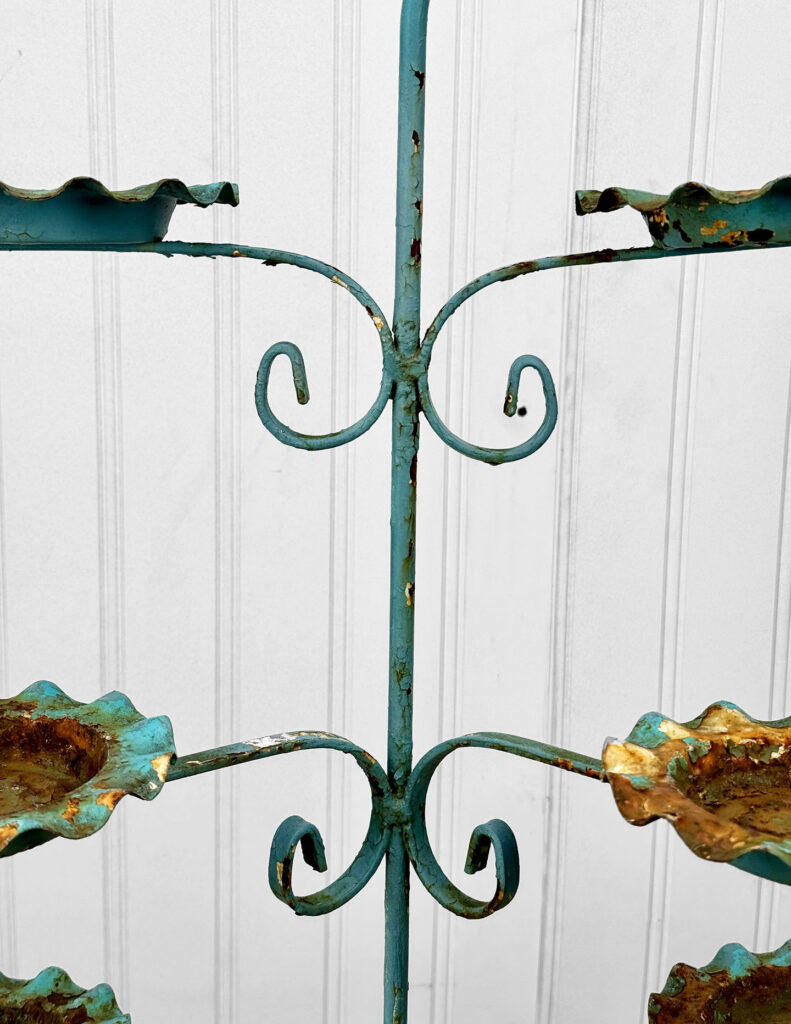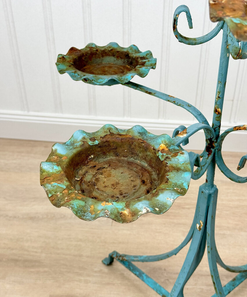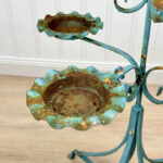 This Wrought Iron Outdoor Plant Stand was exceptionally well made. Each tier is solid and supports a generous amount of weight. The piece is overall heavy, keeping it in the garden during heavy winds and harsh elements isn’t an issue. The verdigris colored finish is heavily worn throughout with areas of surface rust shown. None of the plant tiers/cups show pitting.