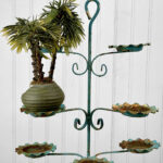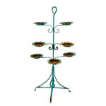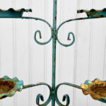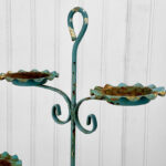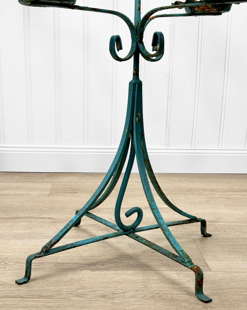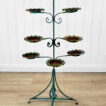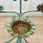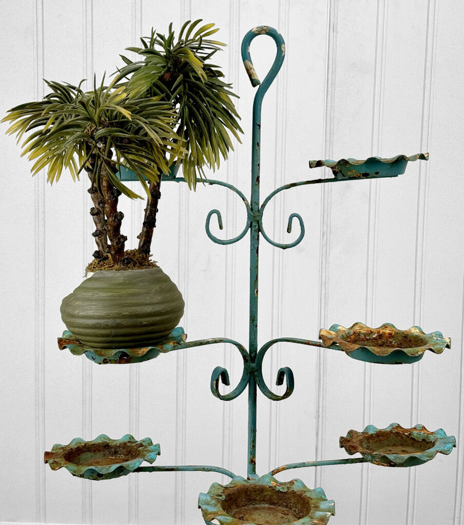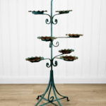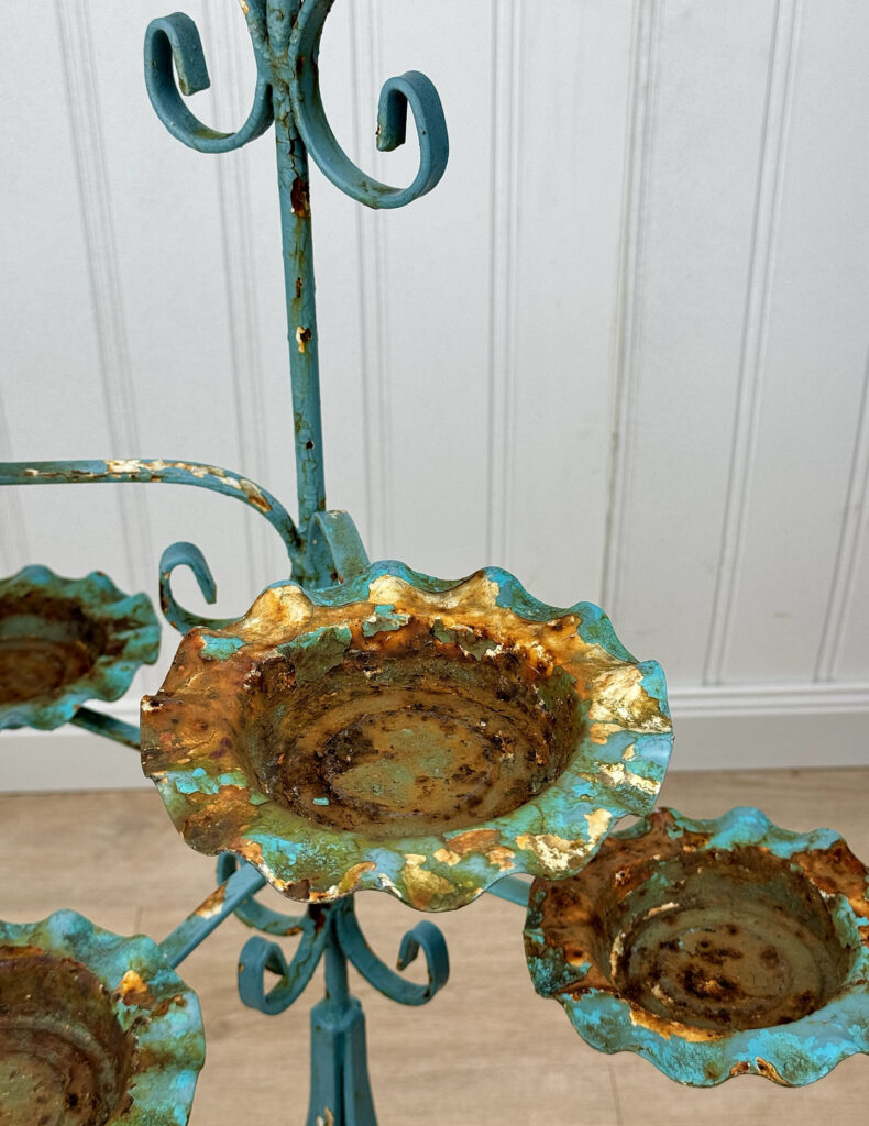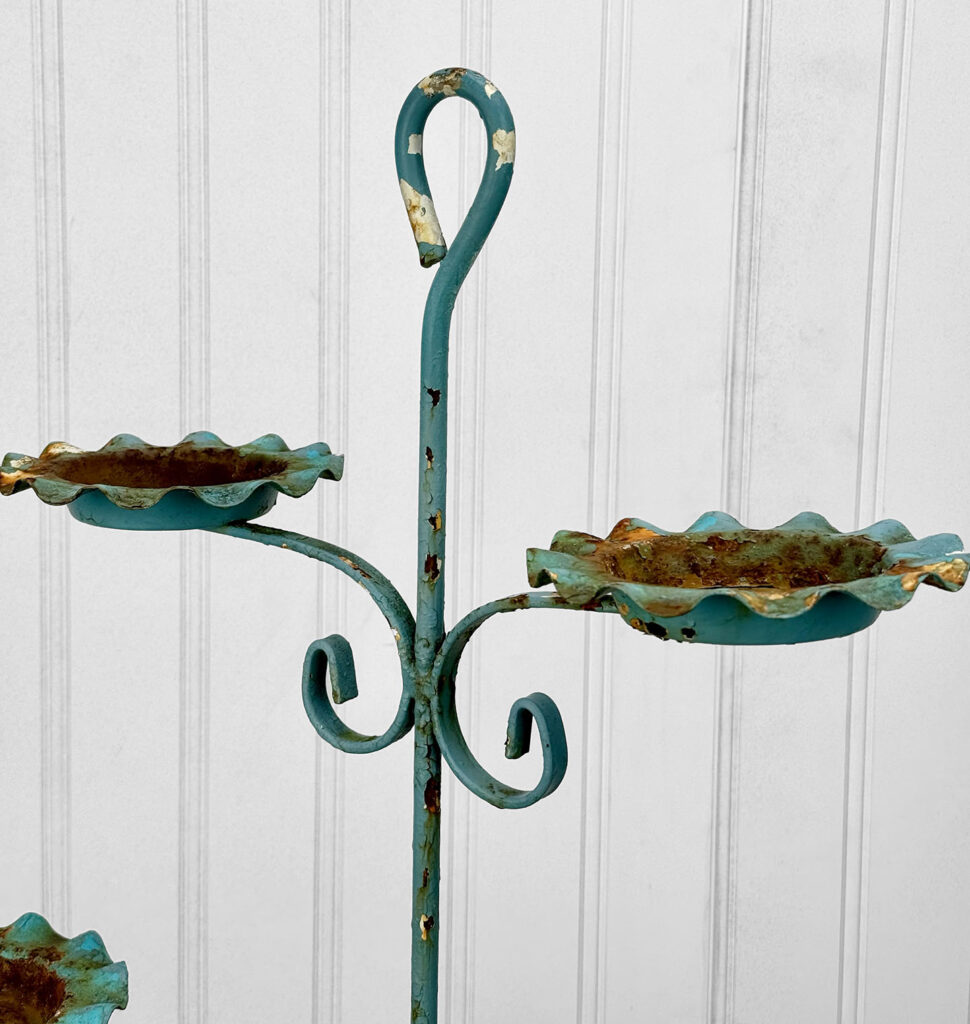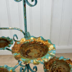 This Wrought Iron Outdoor Plant Stand was exceptionally well made. Each tier is solid and supports a generous amount of weight. The piece is overall heavy, keeping it in the garden during heavy winds and harsh elements isn’t an issue. The verdigris colored finish is heavily worn throughout with areas of surface rust shown. None of the plant tiers/cups show pitting.
