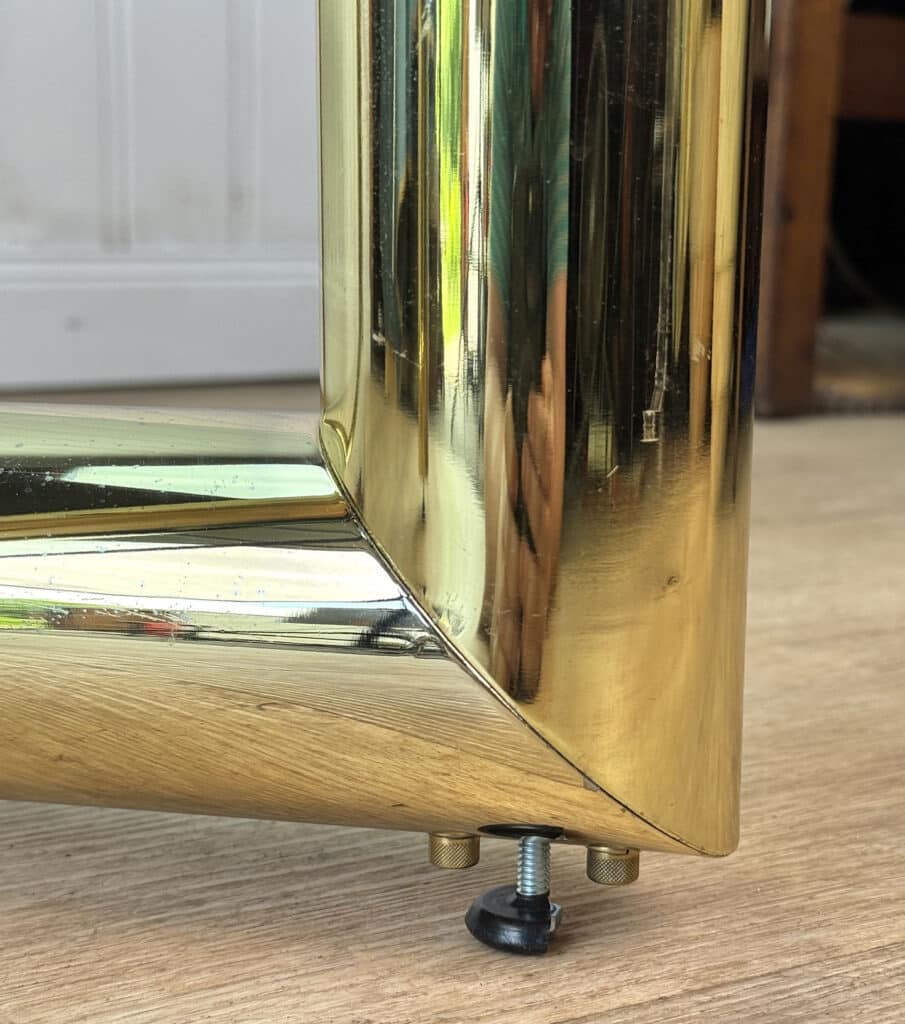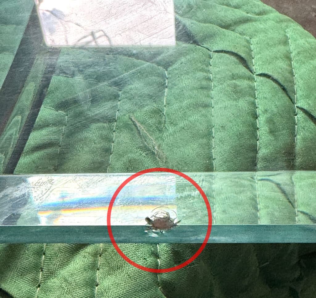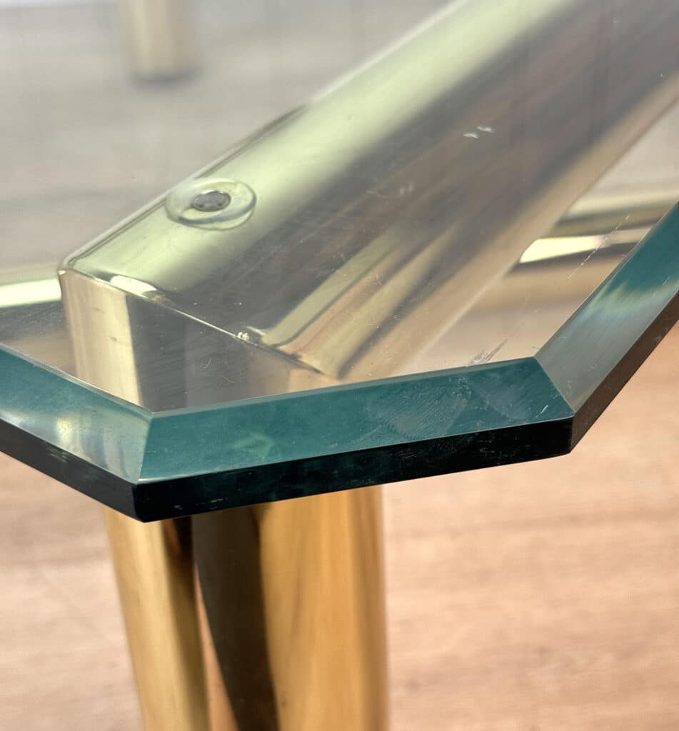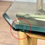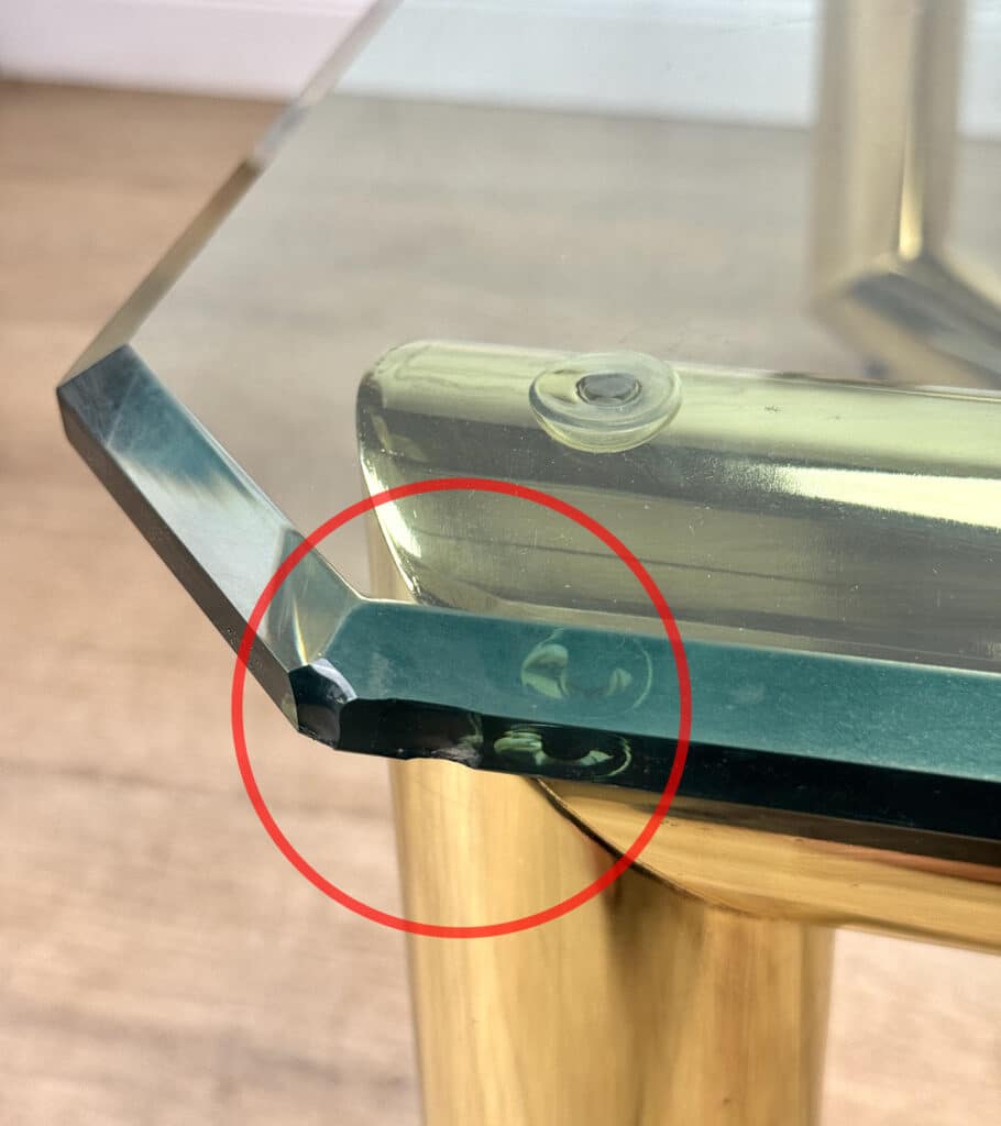 This Table is solid, sturdy and very well made. A series of chips along the glass top’s edge can be seen. We’ve circled these areas in our photo gallery to reference. This top is VERY heavy.