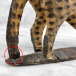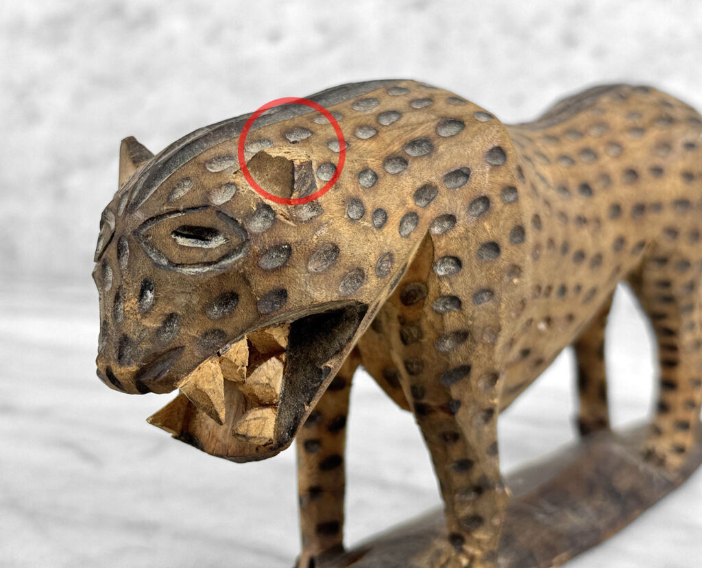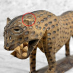 A Possible repair was made along the tail – where the tail meets the base. A chip along the top of the jaguars right ear is shown. We’ve circled these areas in our photo gallery to reference. The sculpture is in overall good condition and looks great while displayed.