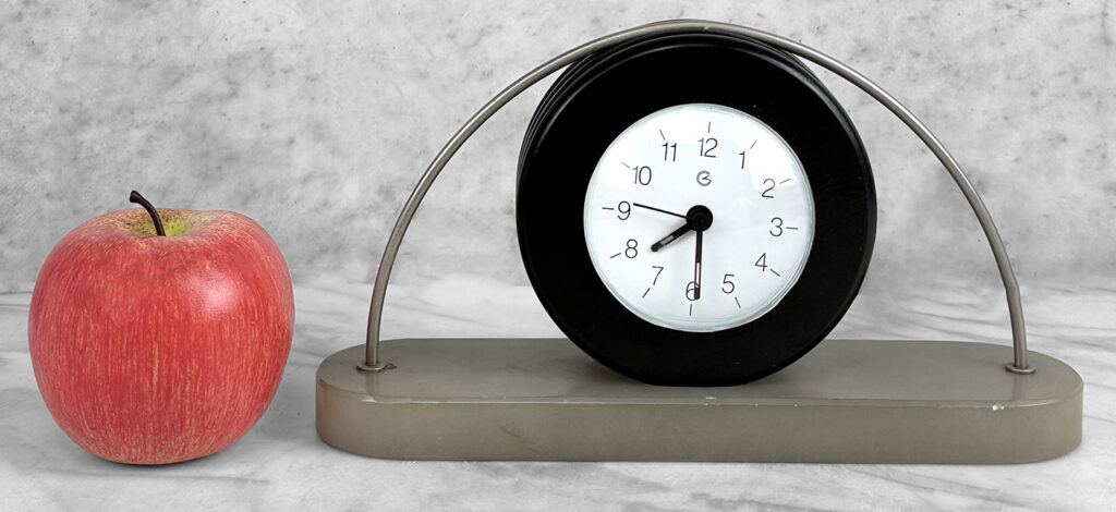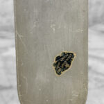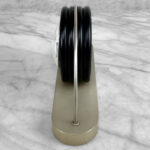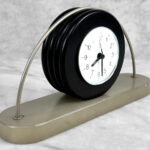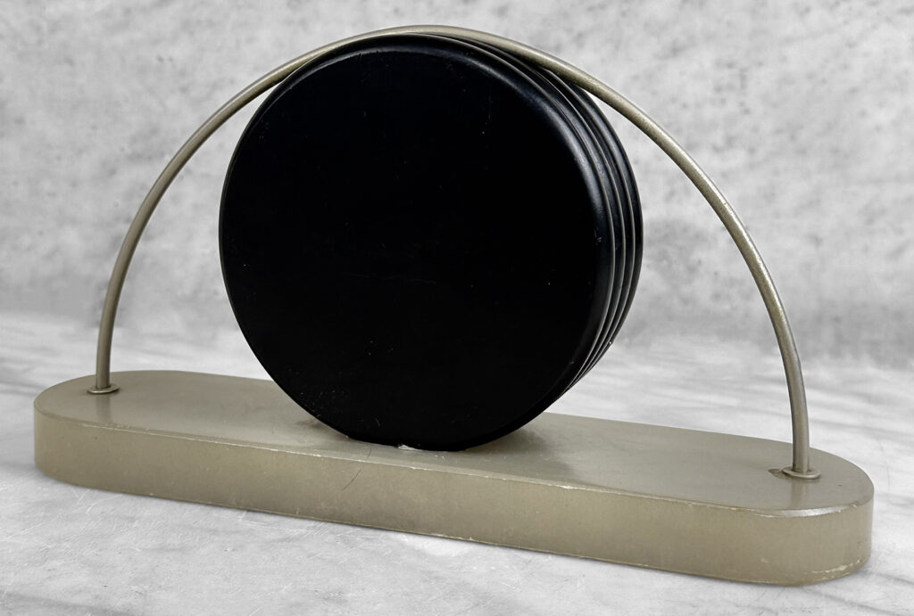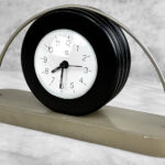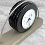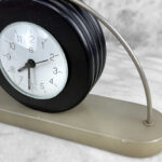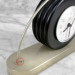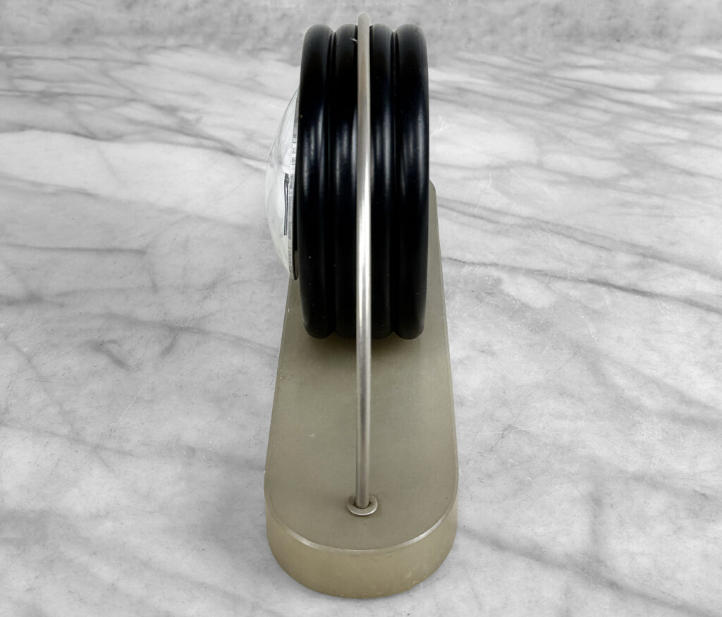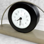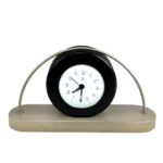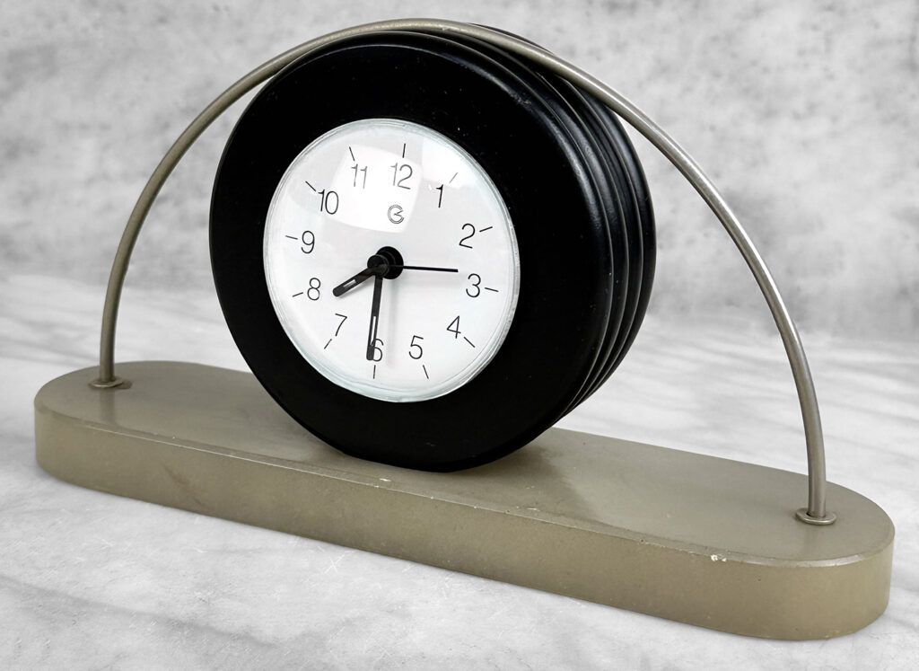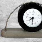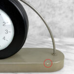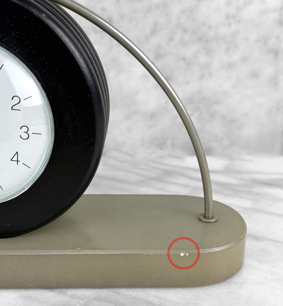 Discoloration and a series of flea bites can be seen to the alabaster. The glass face of the clock appears to have been replaced at some point – It was glued to the face. A new battery was added, it runs and keeps time.