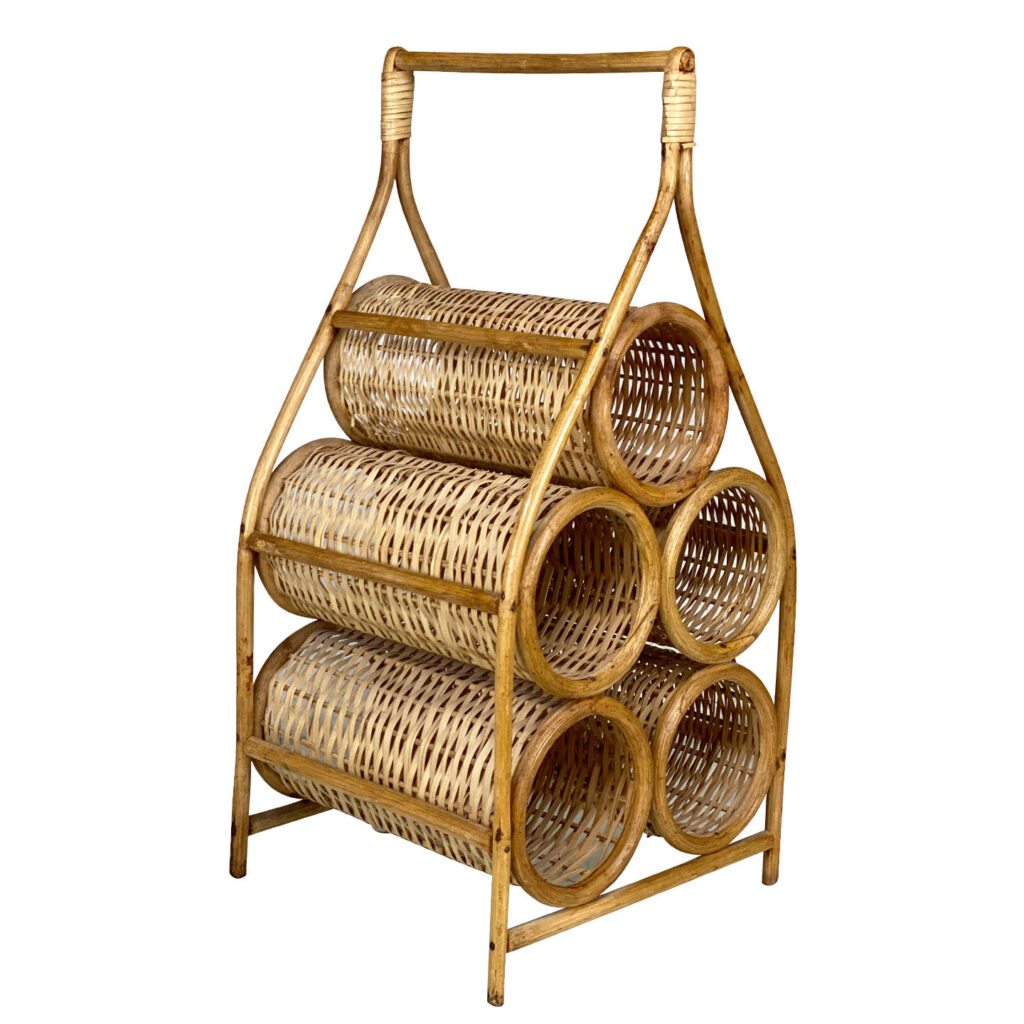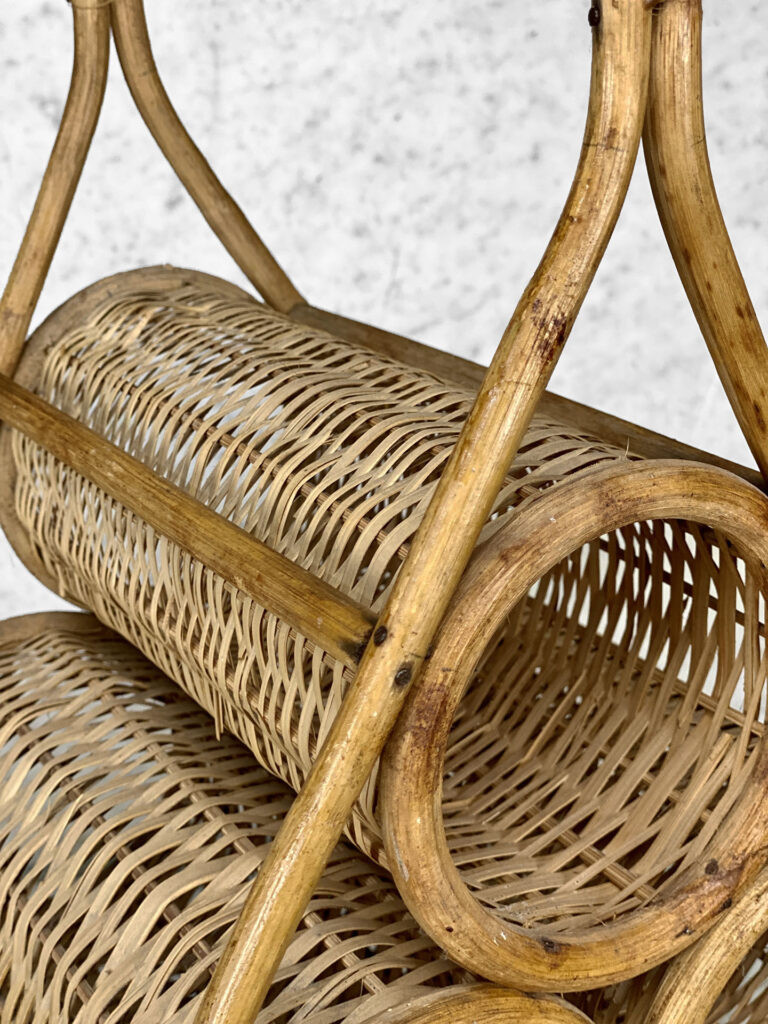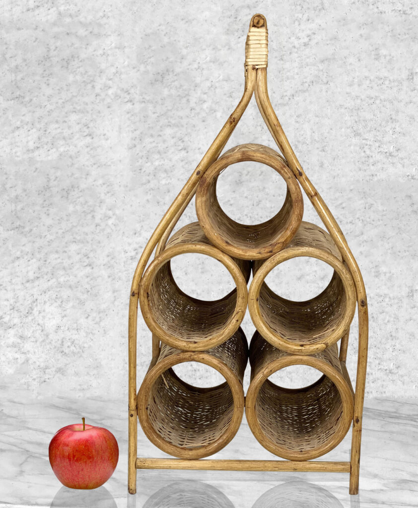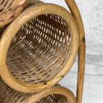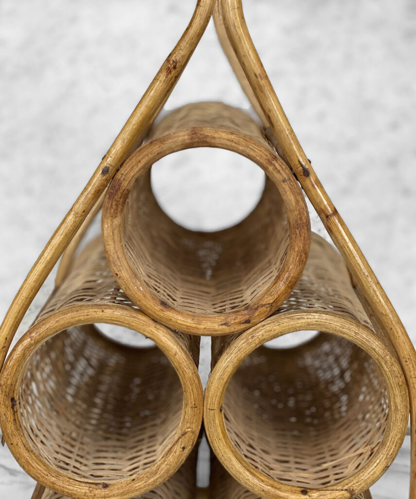 This Rattan Wine Bottle Holder was exceptionally well made, it stands solid and sturdy. Mild areas of lose caning can be seen, which is common from age. Each Holder offers full support as it should.