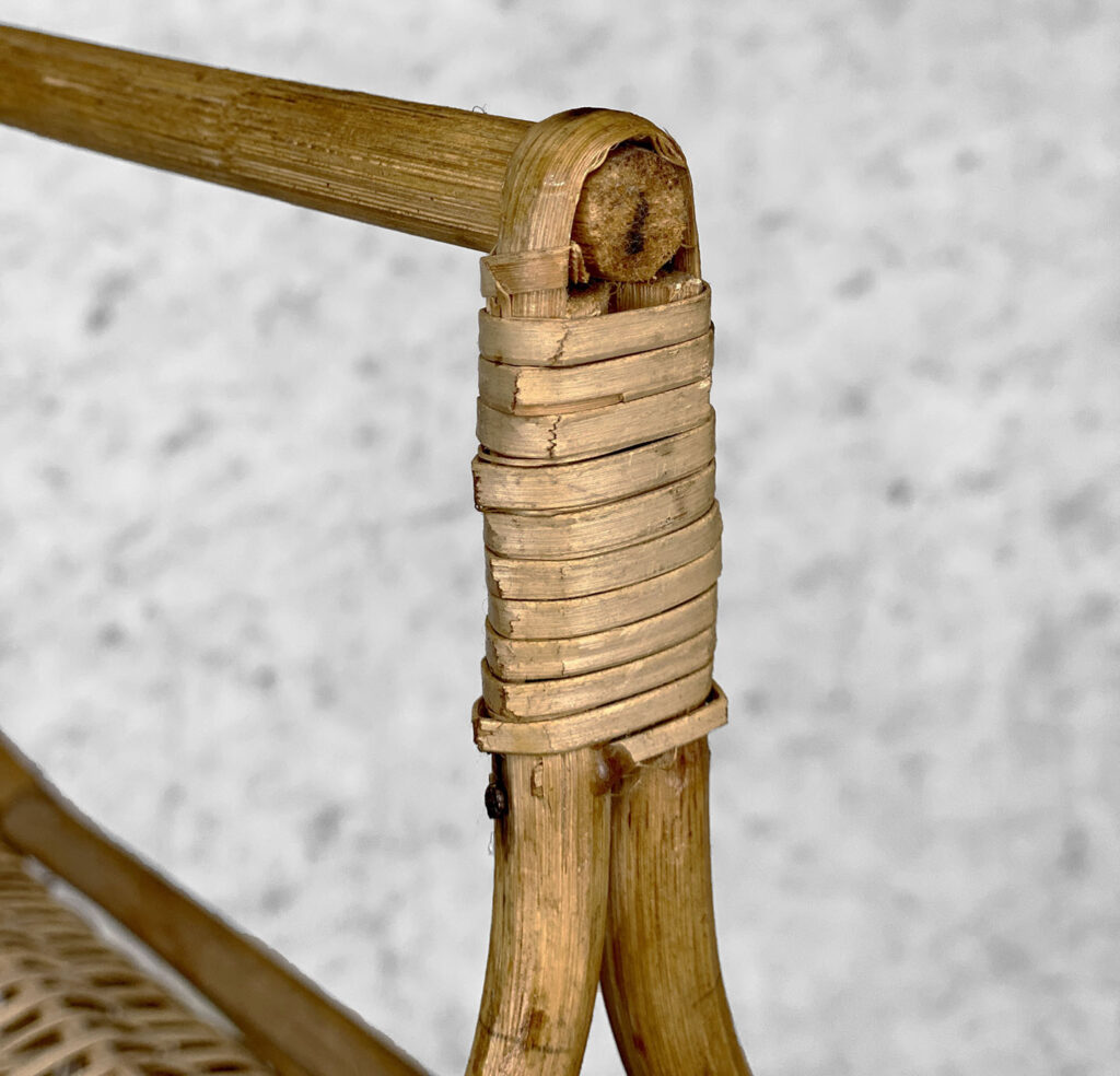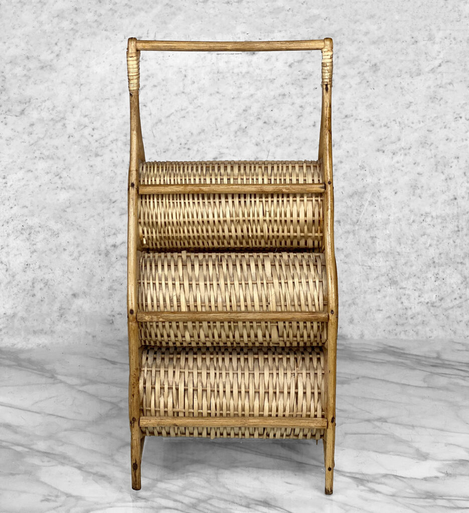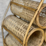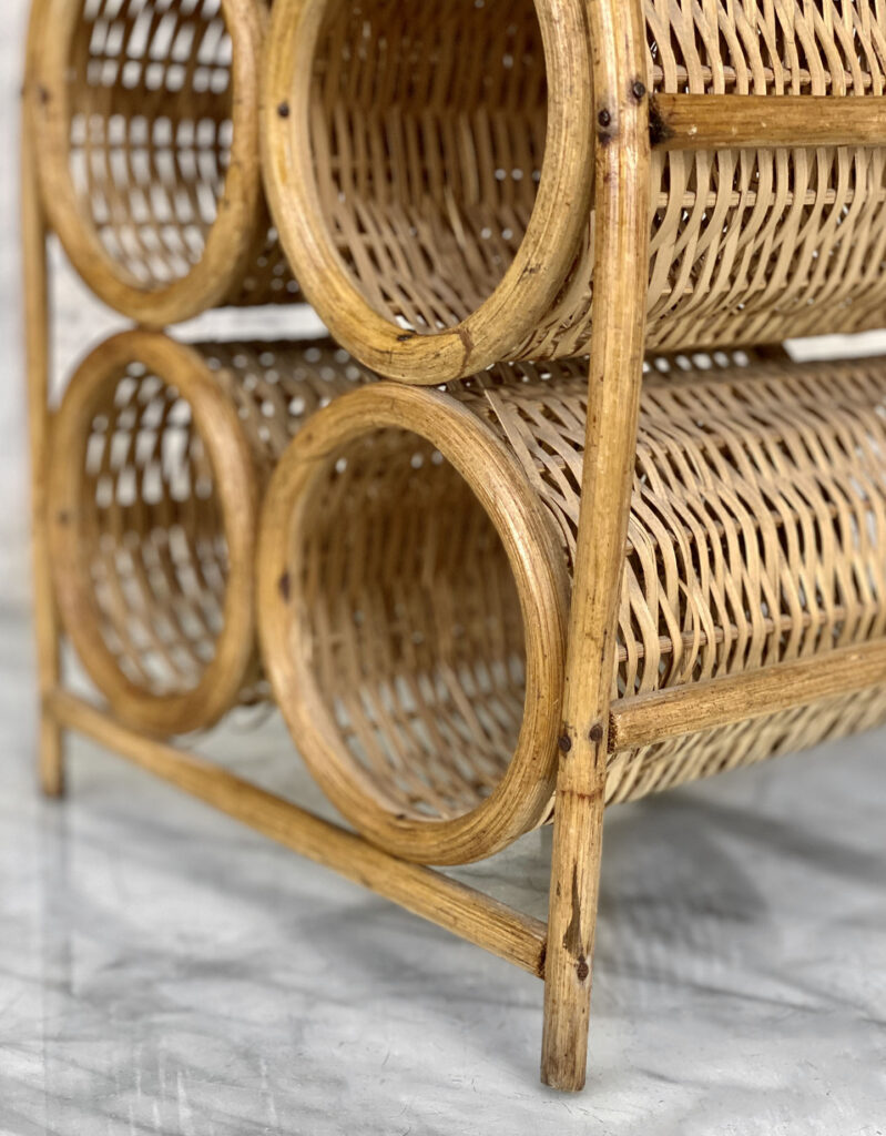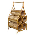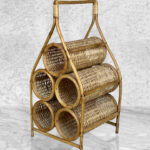 This Rattan Wine Bottle Holder was exceptionally well made, it stands solid and sturdy. Mild areas of lose caning can be seen, which is common from age. Each Holder offers full support as it should.