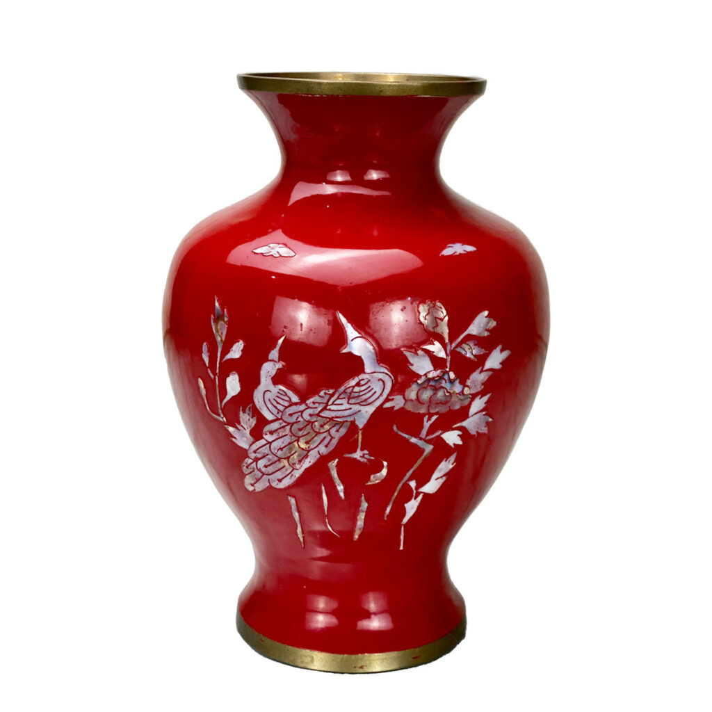 Vintage Chinese Brass Red Enamel Cloisonne Mother of Pearl Inlay Vase, c. Mid 20th Century