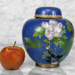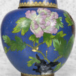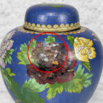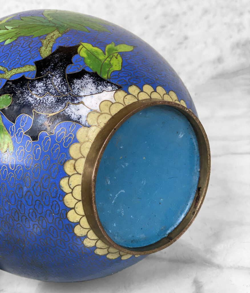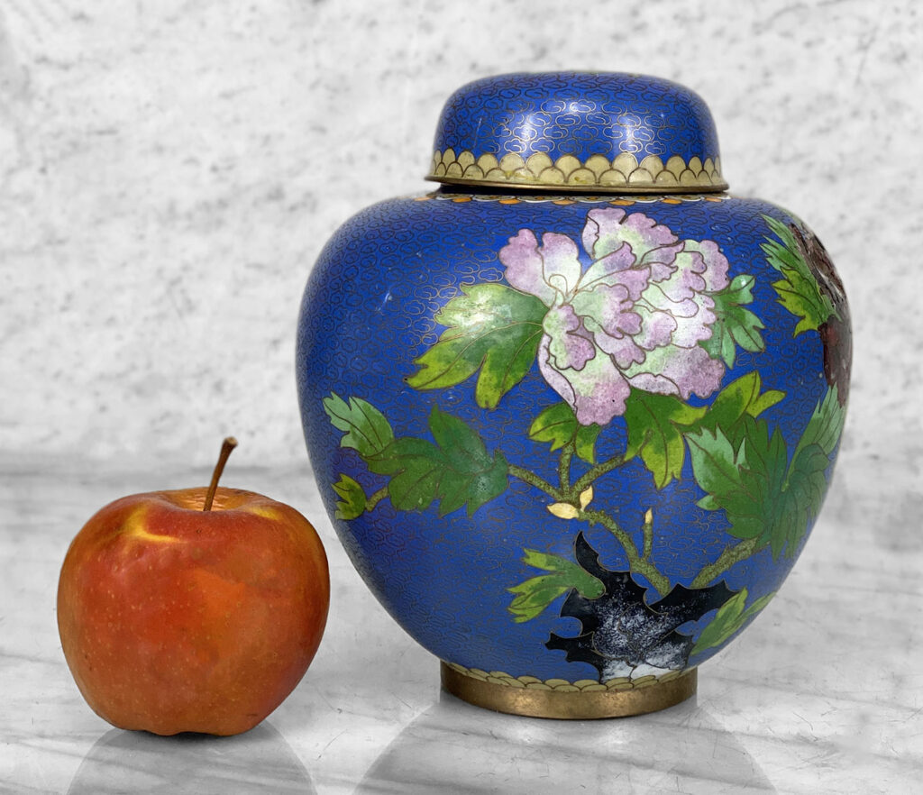 This Vintage Cloisonne Ginger Jar shows an area of worn/missing enamel along the red flower. This area is circled in our photo gallery to reference. Mild surface scratches are consistent with age.