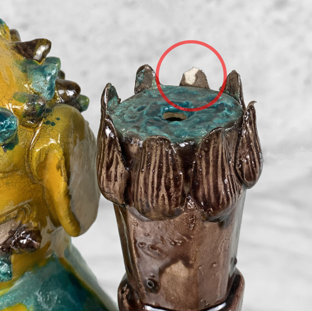This Porcelain Foo Dog is in overall good condition without any cracks or repairs shown. A flea bite along the top pillar is shown, this area is circled in our photo gallery to reference.