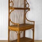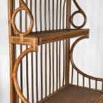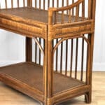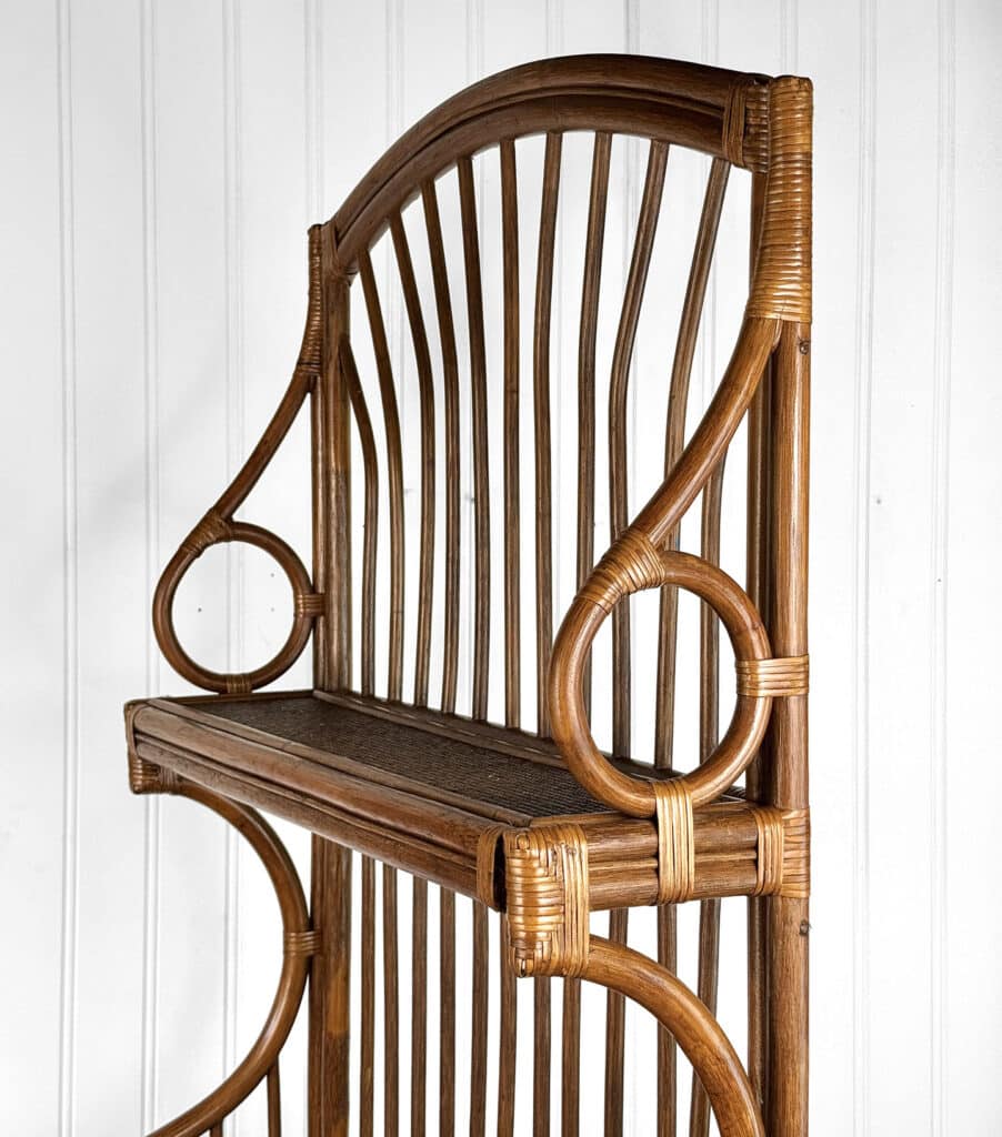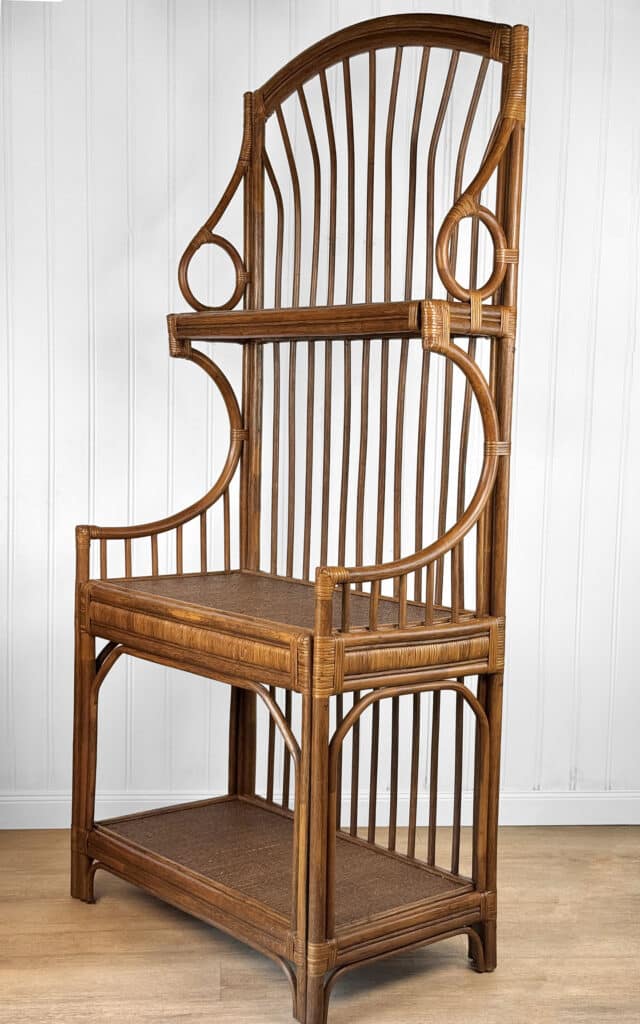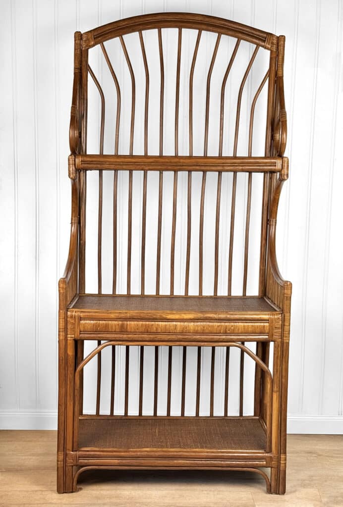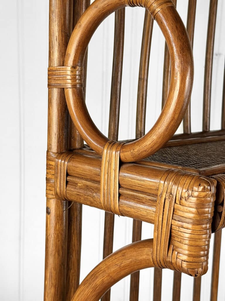 This Rattan Etagere is in overall good condition. It was exceptionally well made and is solid and sturdy. Each shelf supports a tremendous amount of weight. There aren’t any repairs or notable areas of wear. An overall great piece and in wonderful condition.