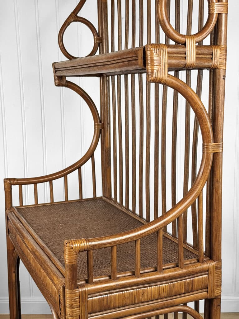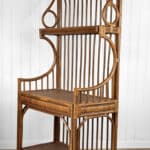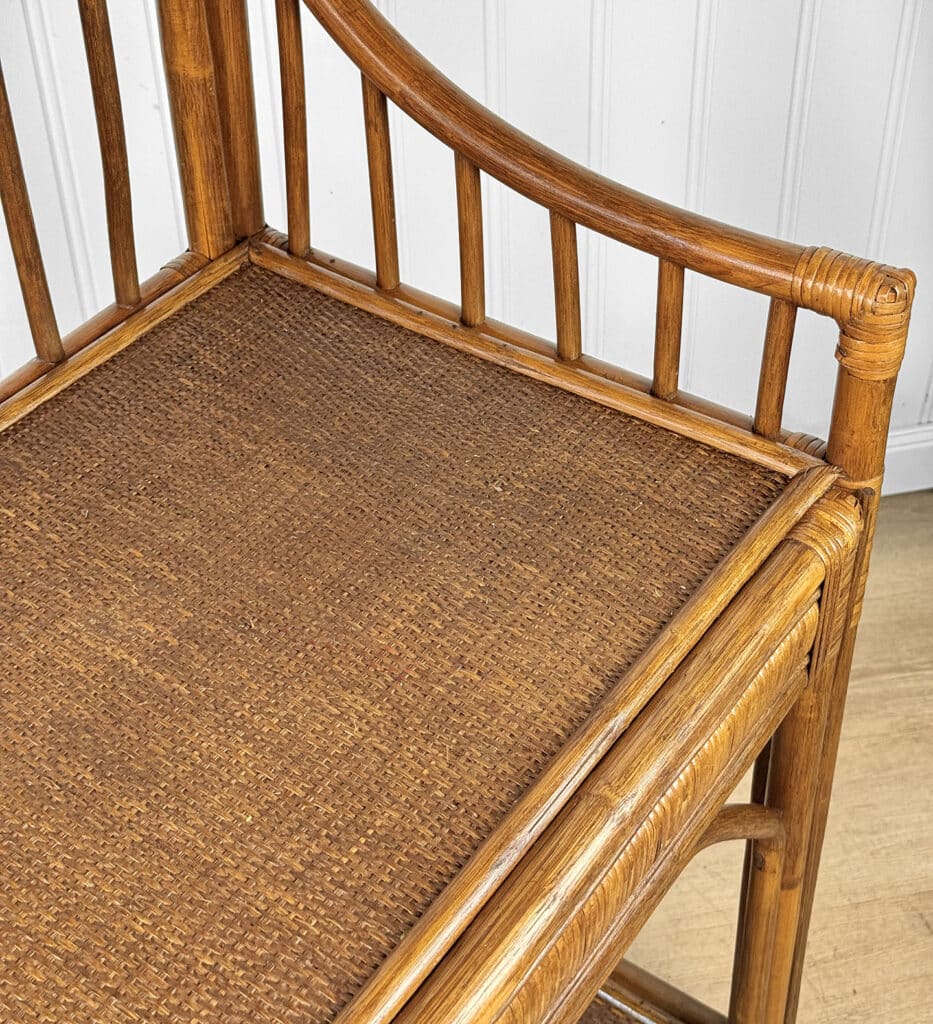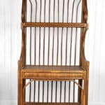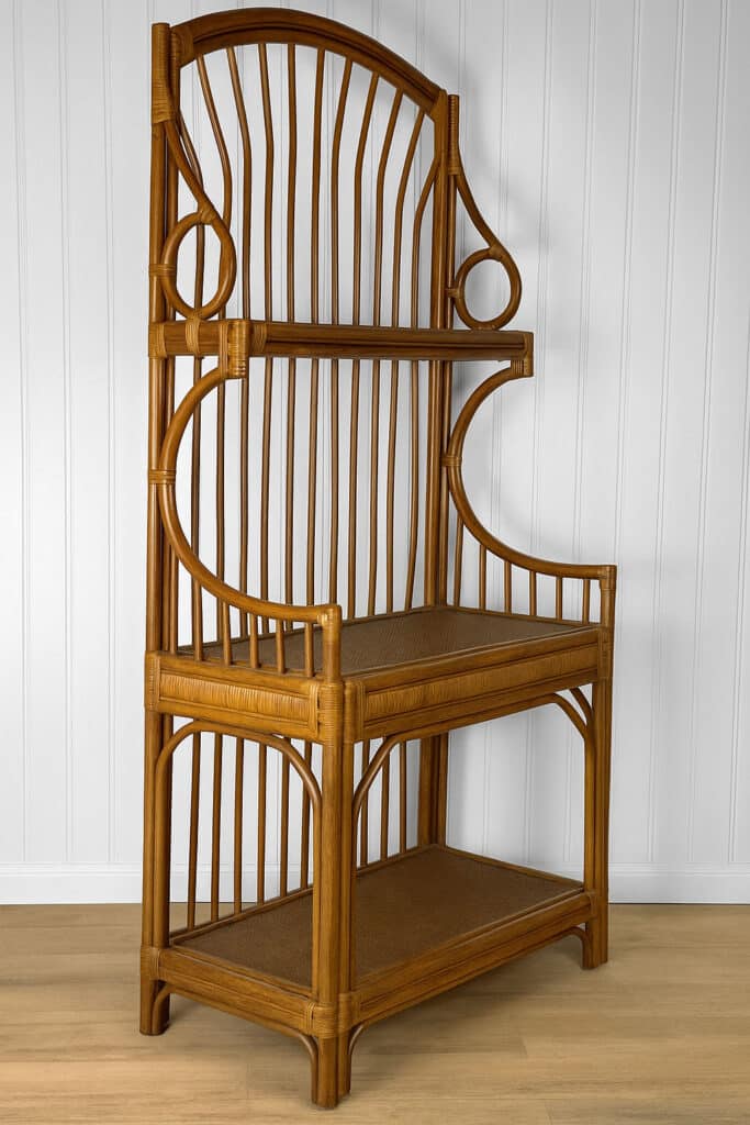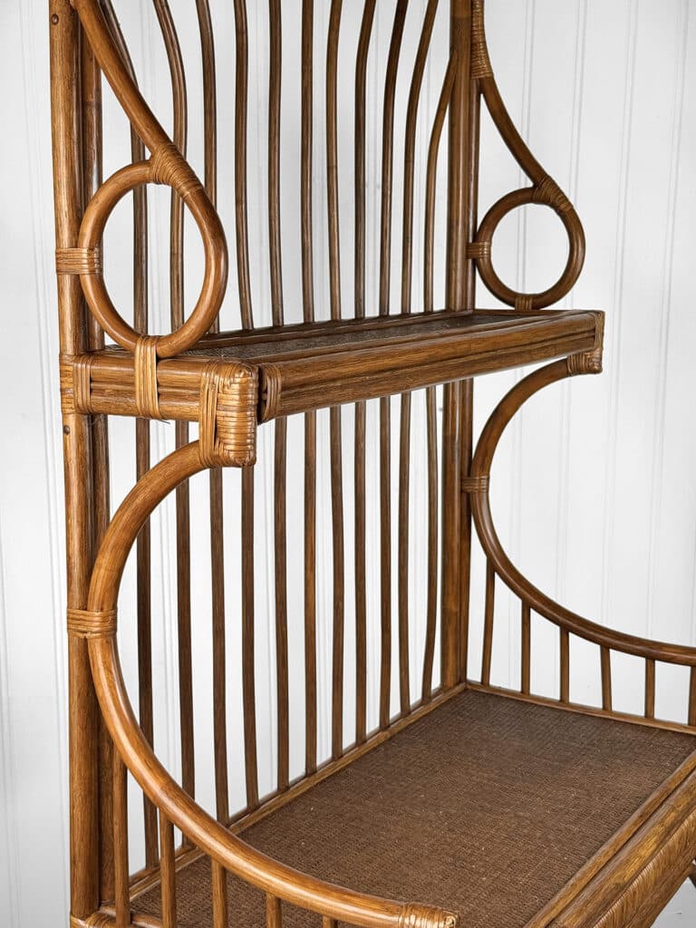 This Rattan Etagere is in overall good condition. It was exceptionally well made and is solid and sturdy. Each shelf supports a tremendous amount of weight. There aren’t any repairs or notable areas of wear. An overall great piece and in wonderful condition.