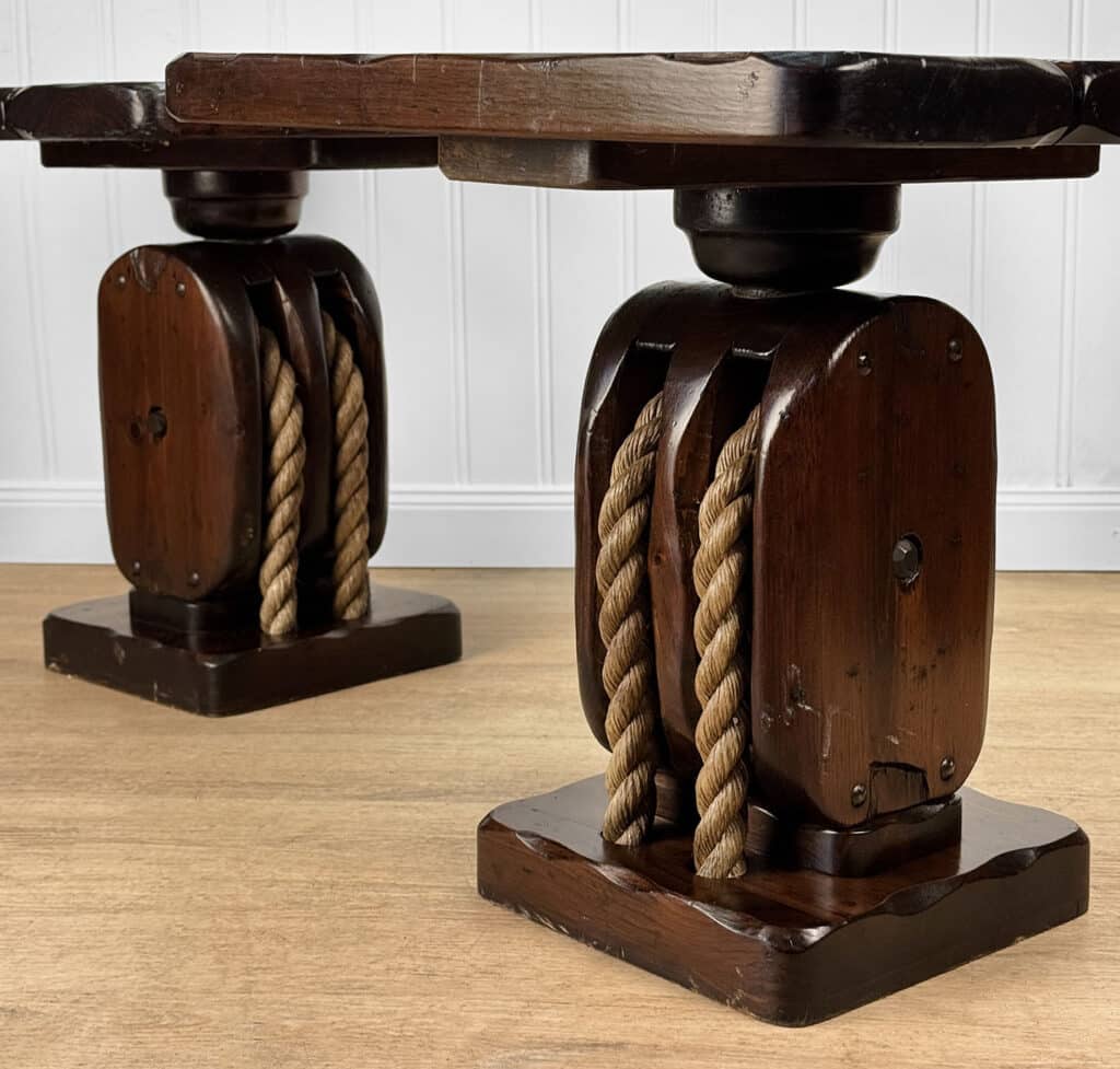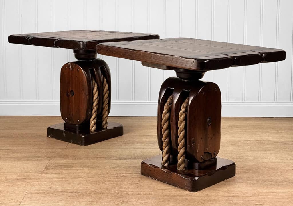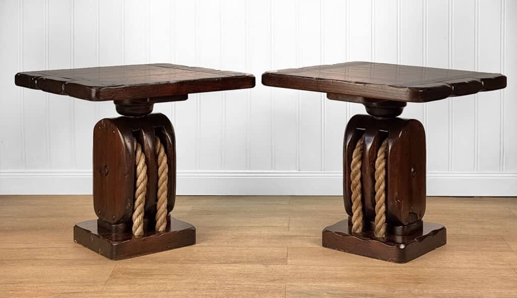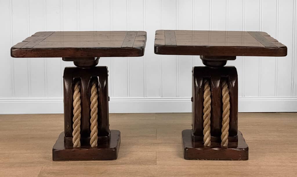 The Pair of Ship Pulley End Tables were very well made, they’re solid, sturdy and supports a tremendous amount of weight. Each table shows a fair amount of surface scratches and finish blemishes from age, but no repairs. They show nice character and look great when staged.