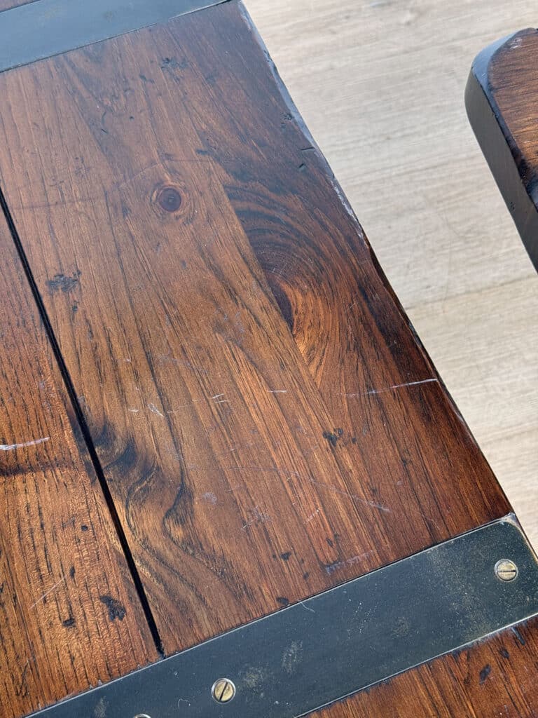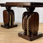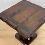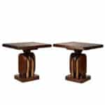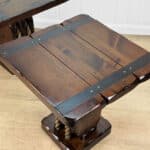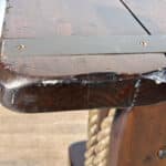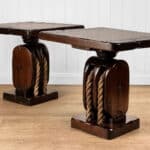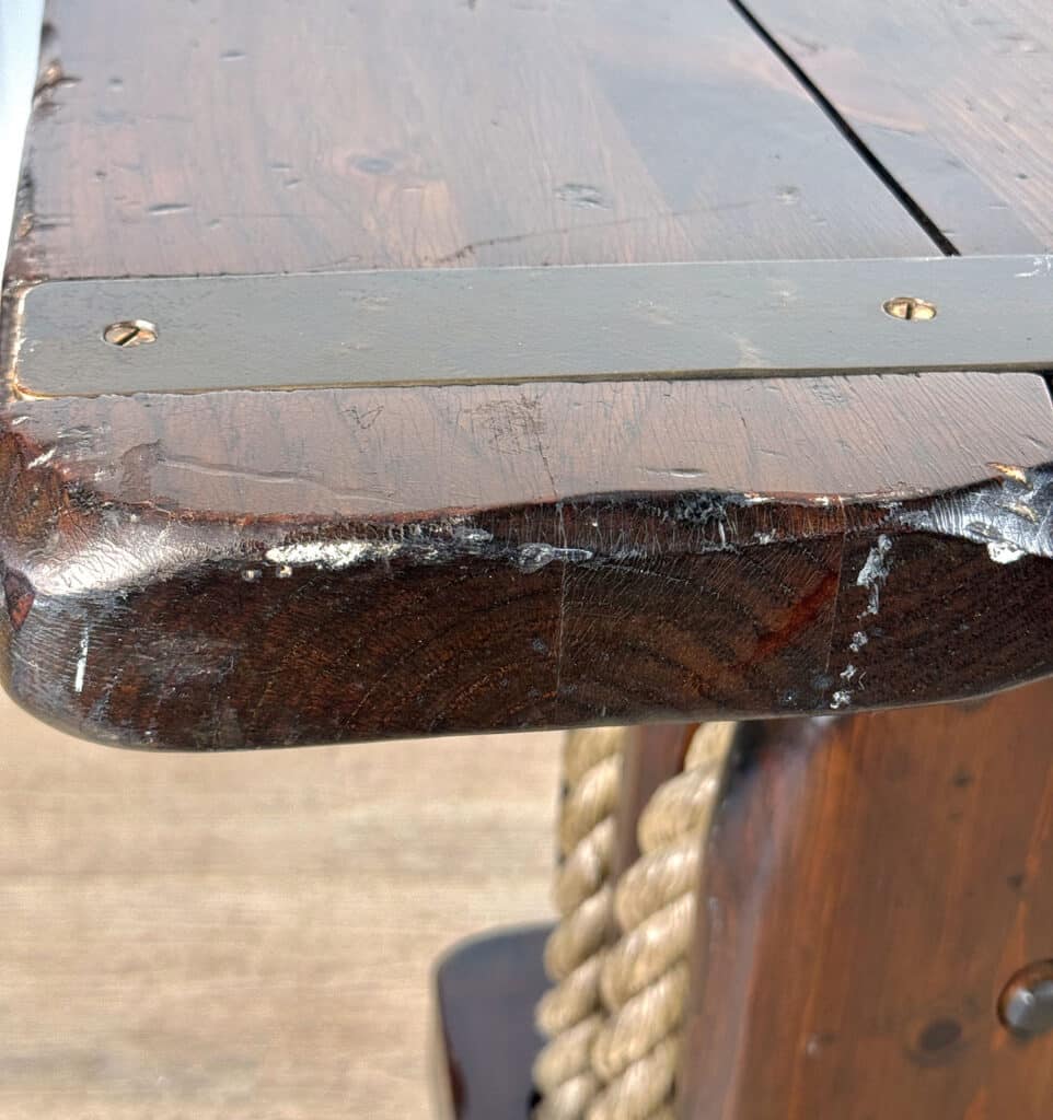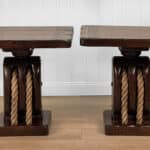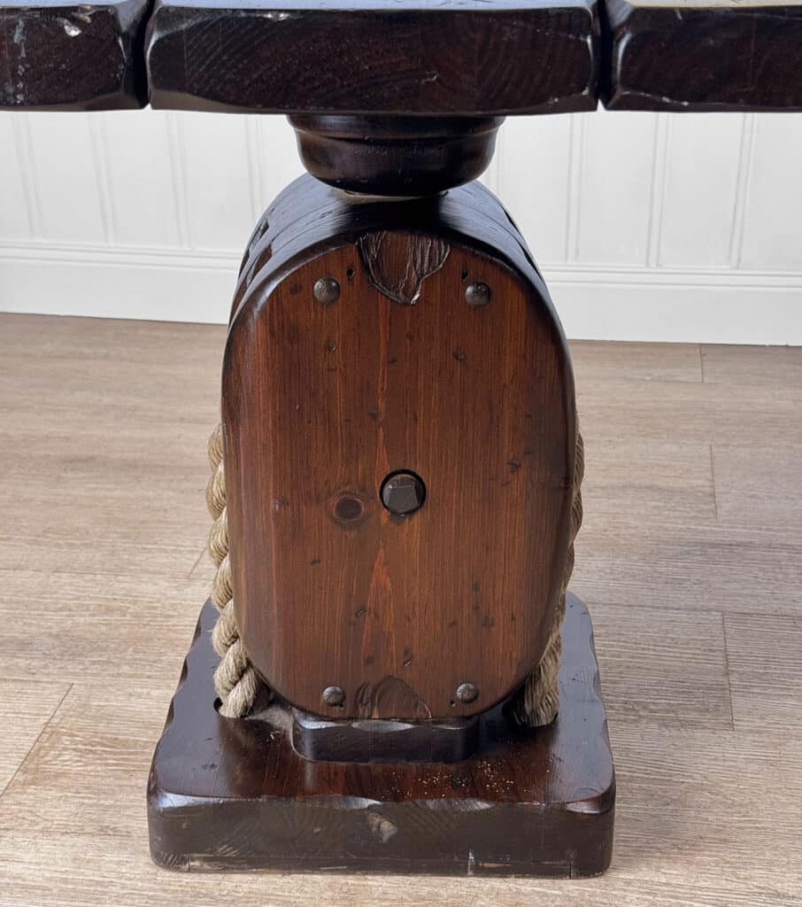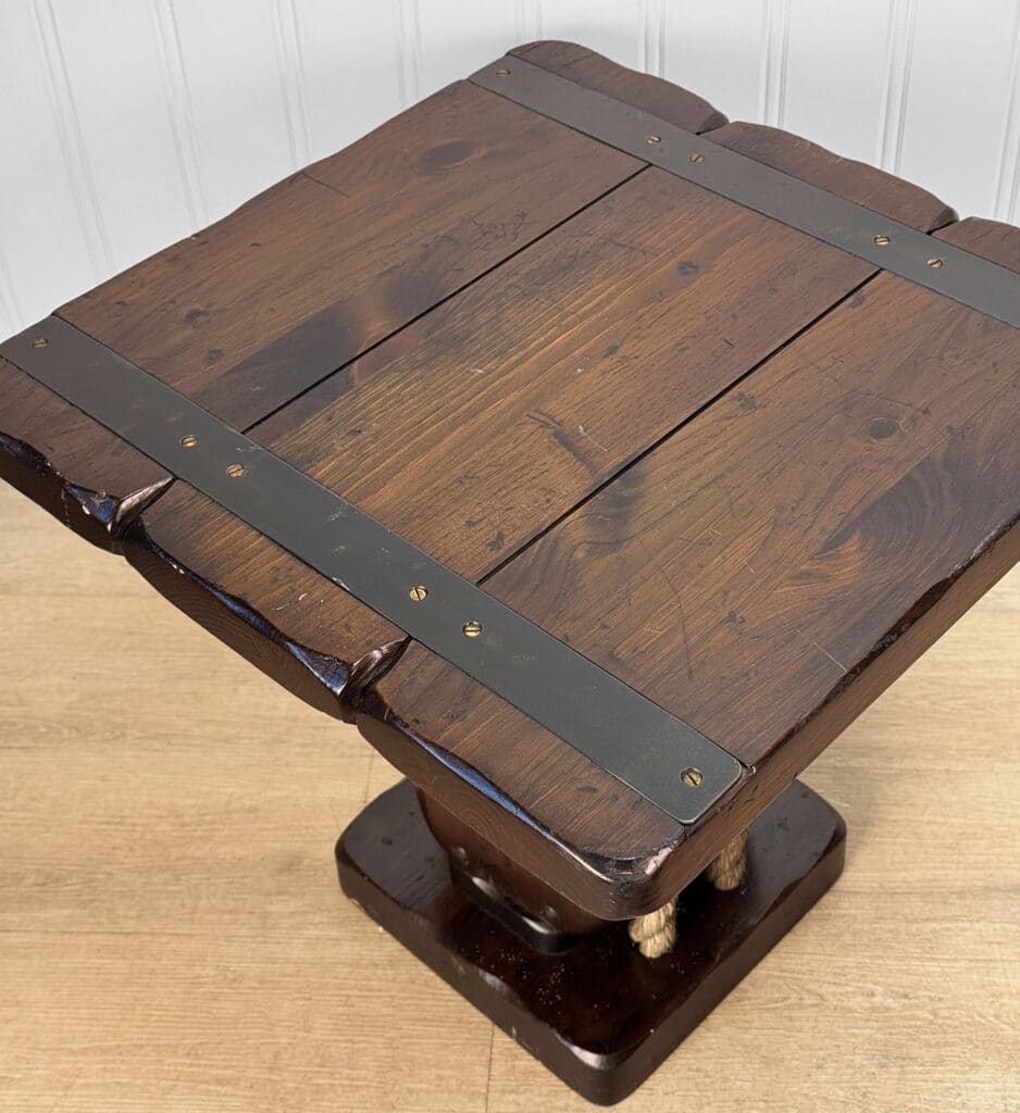 The Pair of Ship Pulley End Tables were very well made, they’re solid, sturdy and supports a tremendous amount of weight. Each table shows a fair amount of surface scratches and finish blemishes from age, but no repairs. They show nice character and look great when staged.