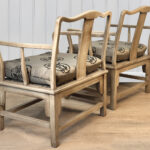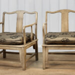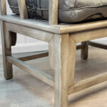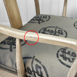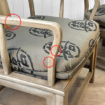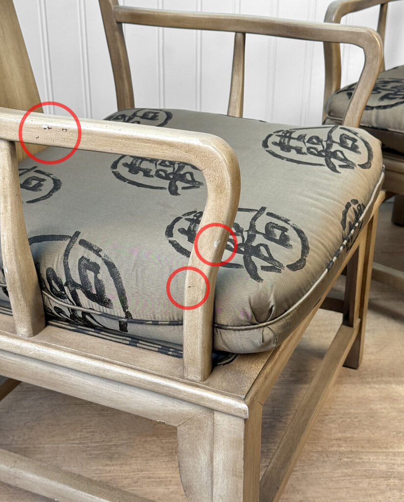 Each Chair is solid, sturdy and makes a great daily seat. The cushions are in good condition, a series of light stains are shown to one cushion. These are circled in our photo gallery to reference. Casual scuffs to the finish is shown from age. Finish loss to one of the arm rests is shown.