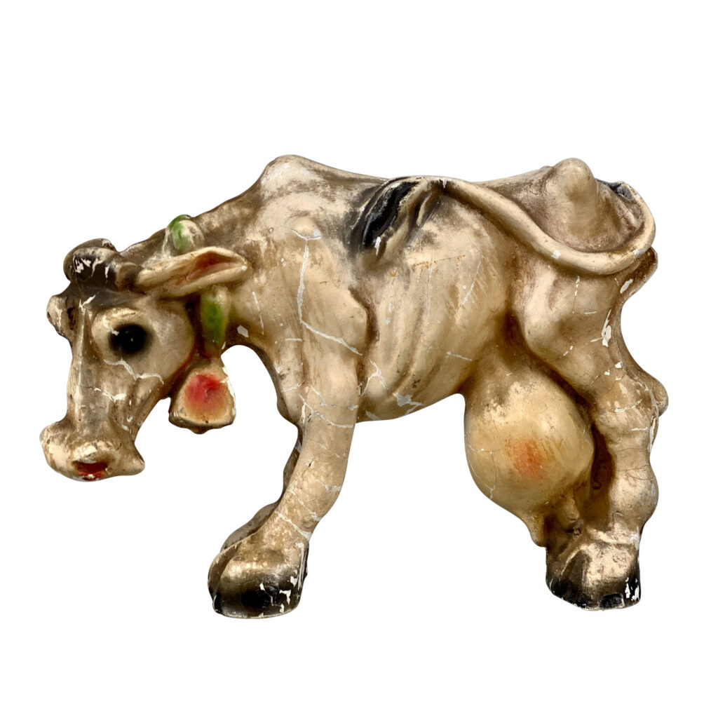 This Unusual Chalkware Cow Sculpture was exceptionally well made. Blemishes, scratches and chips to the finish are shown throughout. It makes for the perfect display piece. There aren’t any repairs or cracks shown.