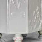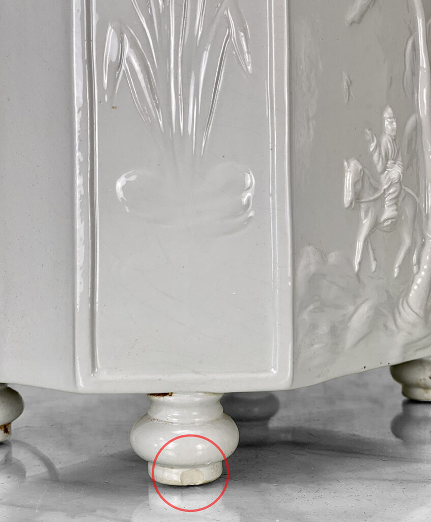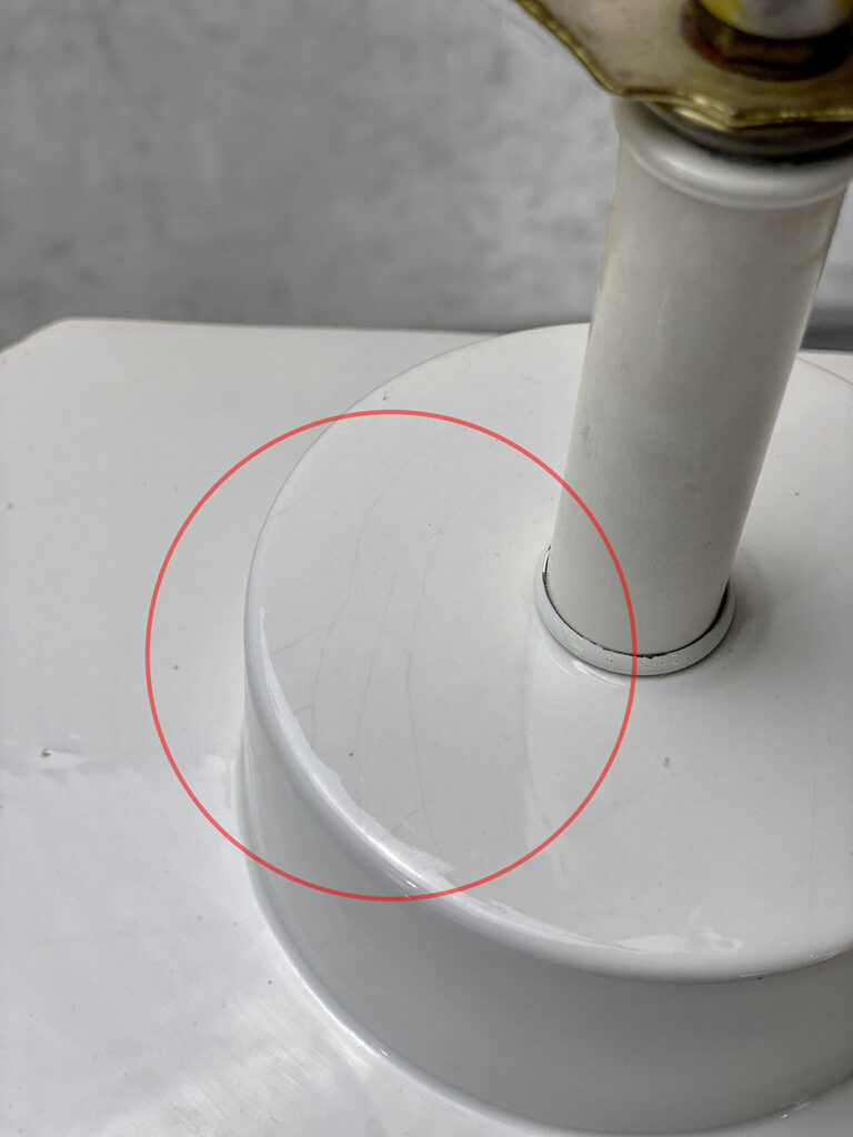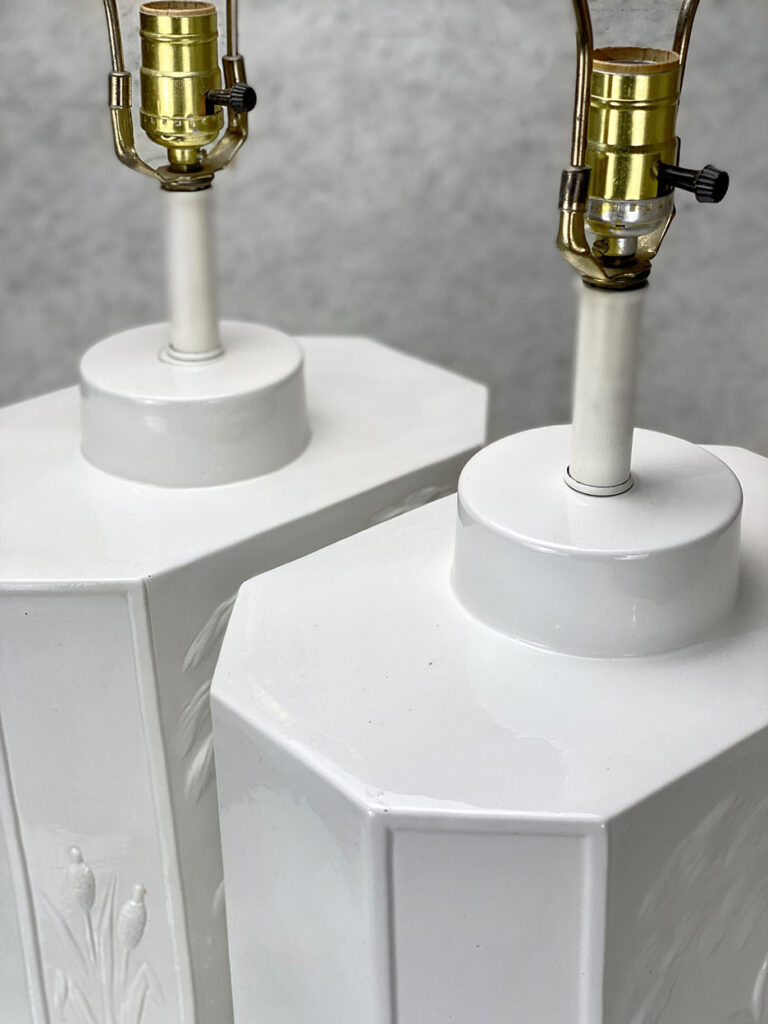 This Pair of Porcelain Lamps are fully tested and work as they should, they do not have to be rewired. A chip along the porcelain feet is shown as well as mild crazing to the glazing upon the top of one lamp. These areas are circled in our photo gallery to reference. Shades are not included.